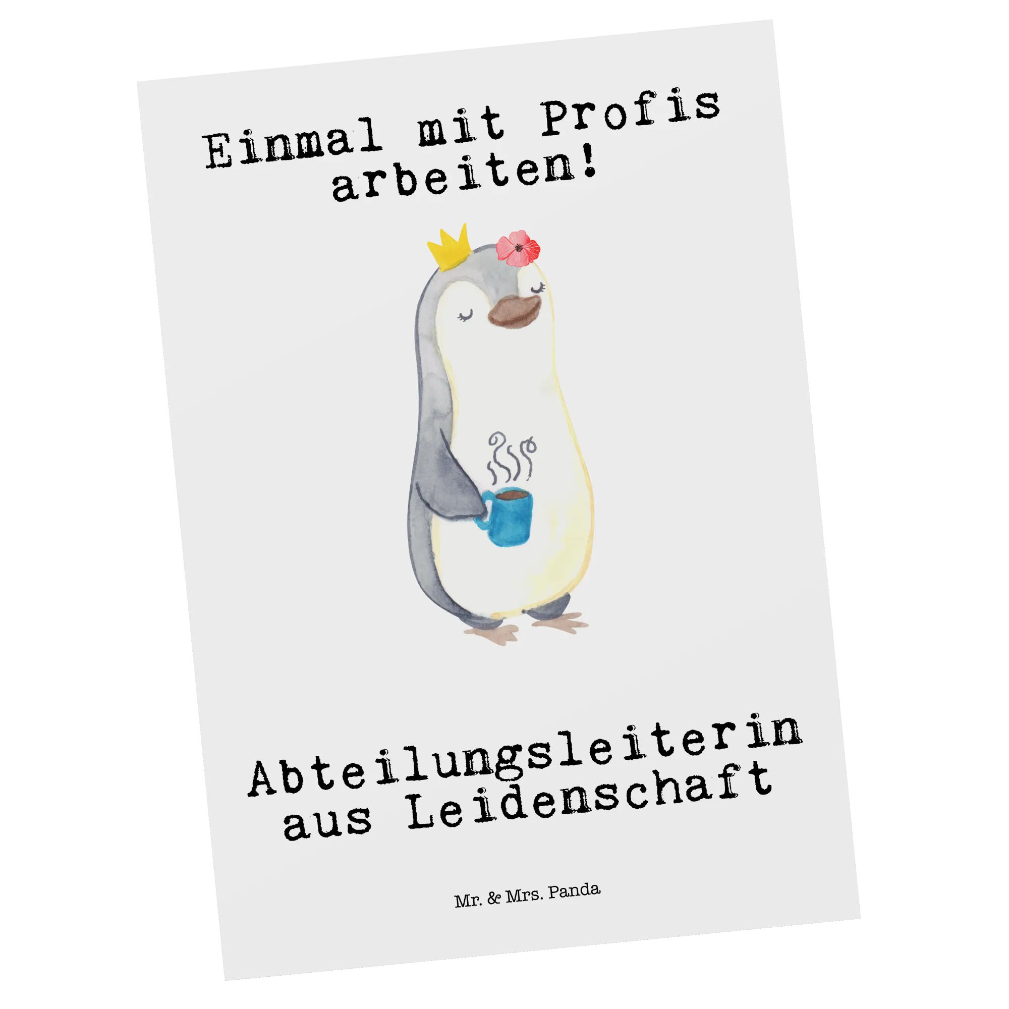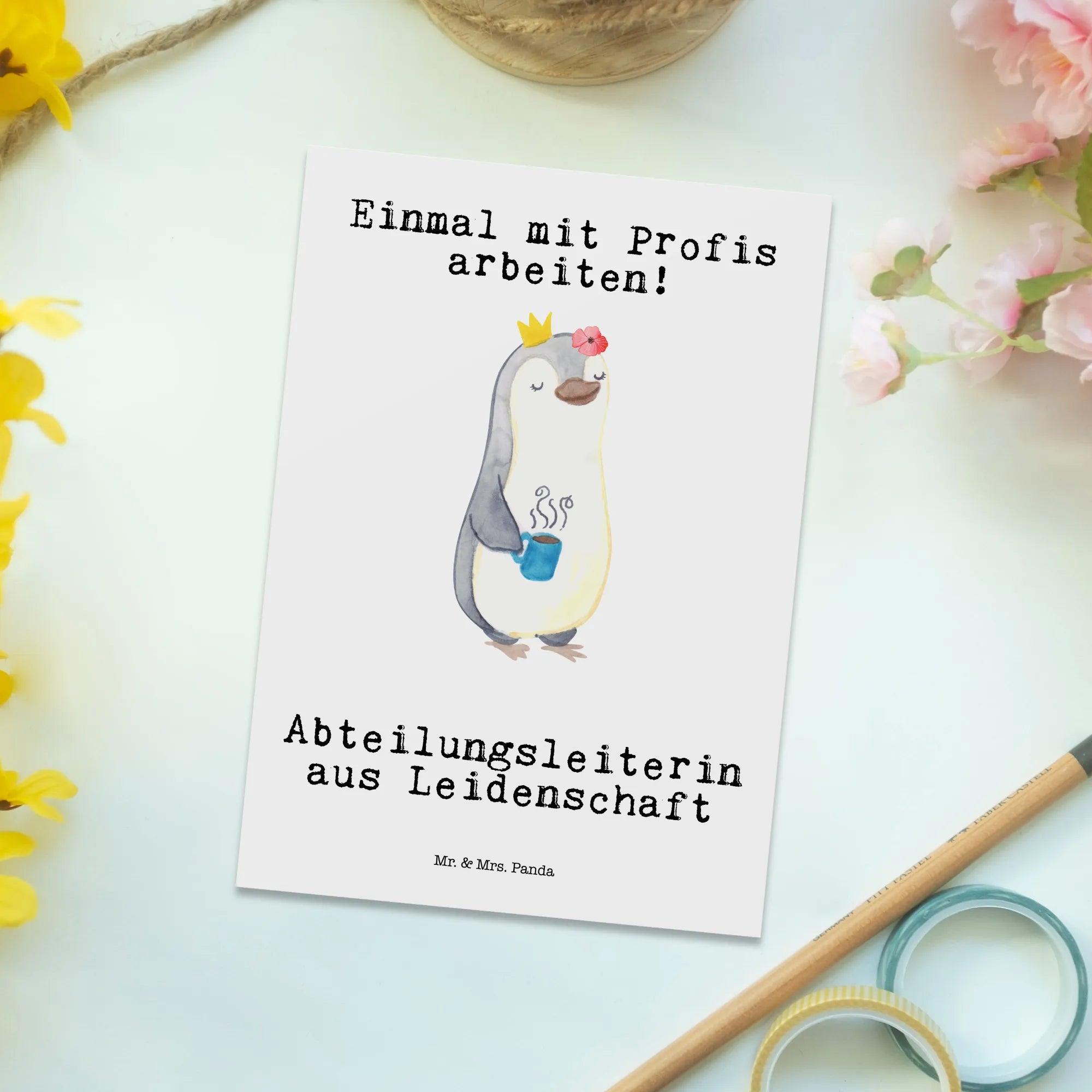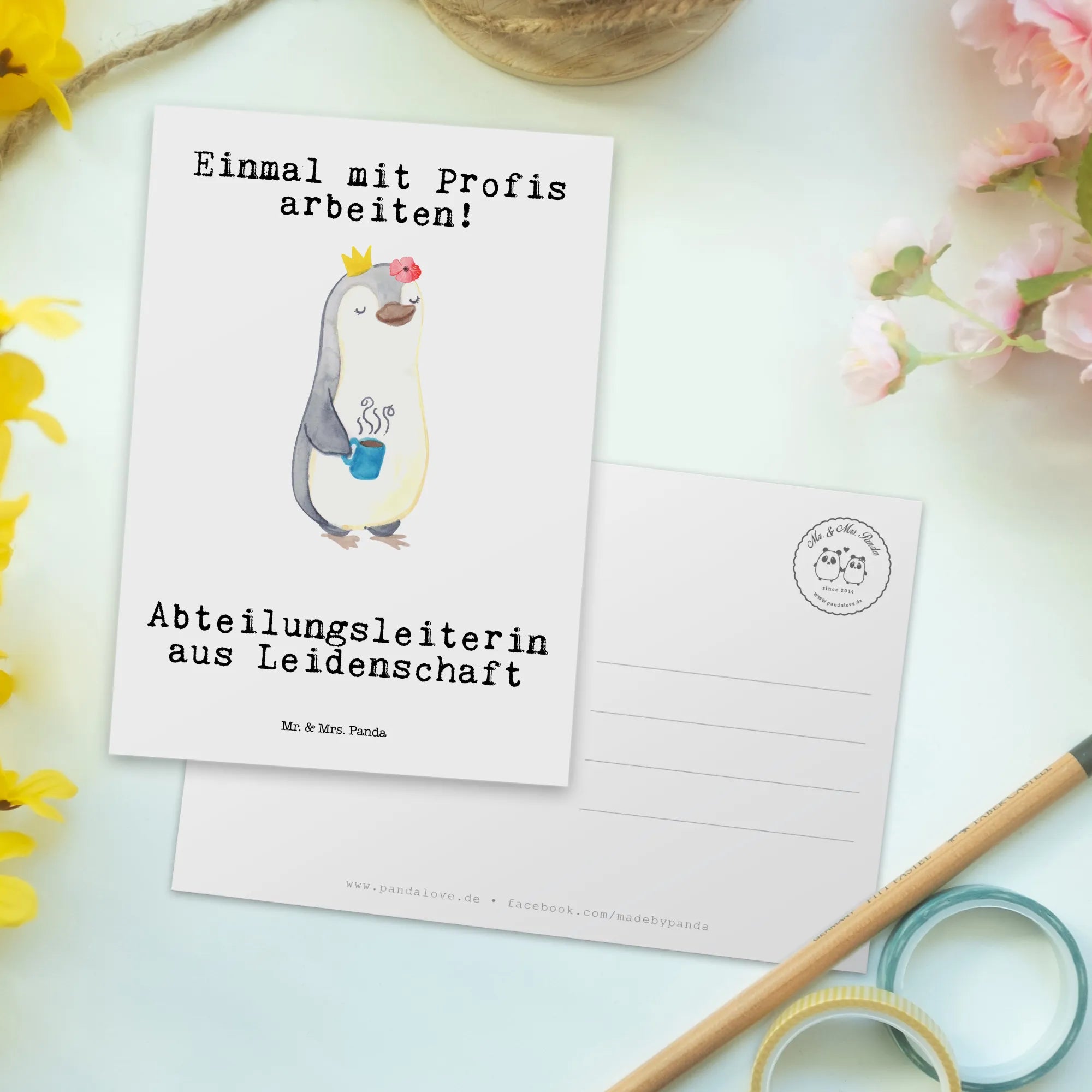 Suchst du das perfekte Geschenk für die beste Abteilungsleiterin in deinem Leben? Unsere Postkarte "Abteilungsleiterin aus Leidenschaft" von Mr. & Mrs. Panda ist genau das Richtige! Mit einem süßen Pinguin in einer Krone, der stolz mit einer Kaffeetasse posiert, wird diese Postkarte garantiert für ein Lächeln sorgen.