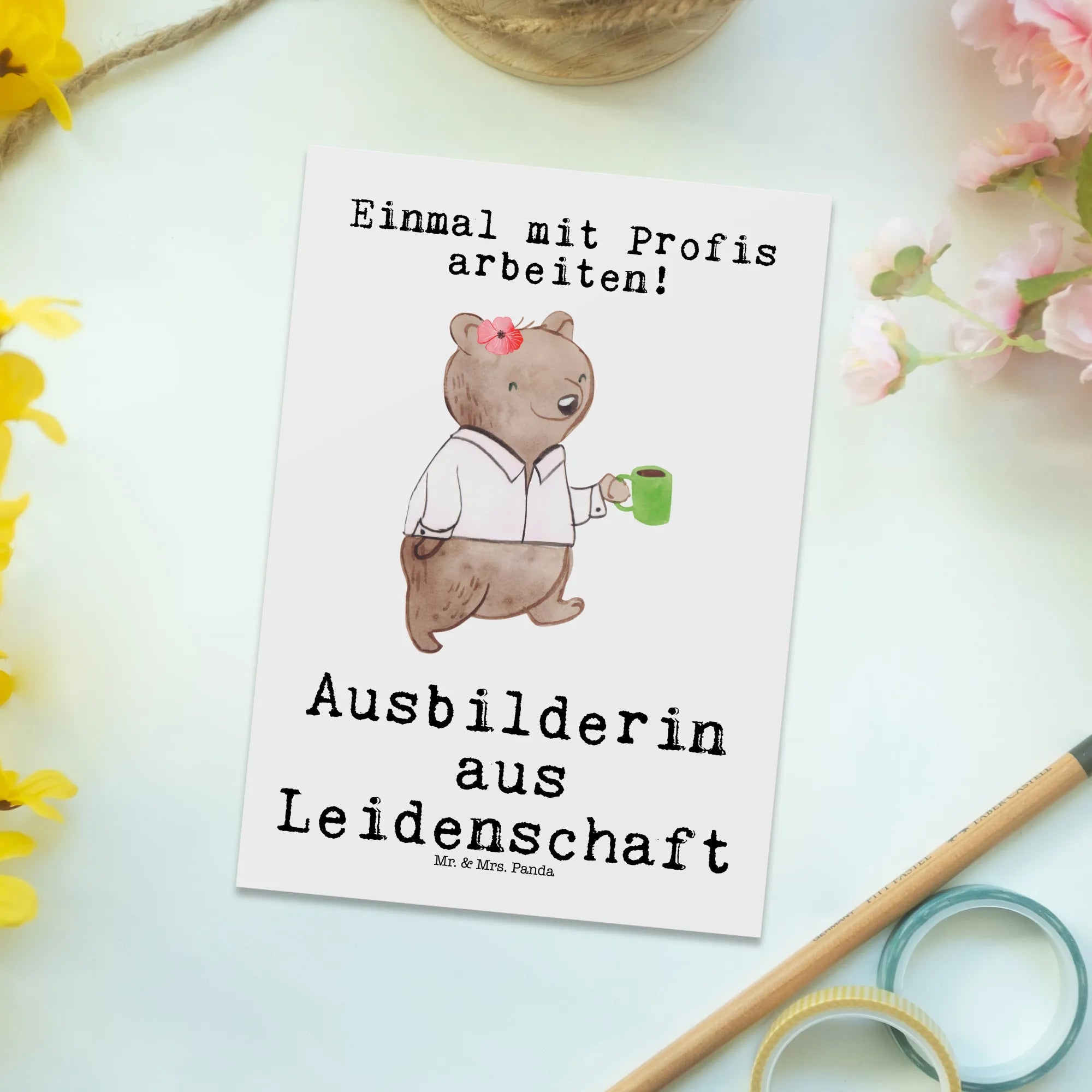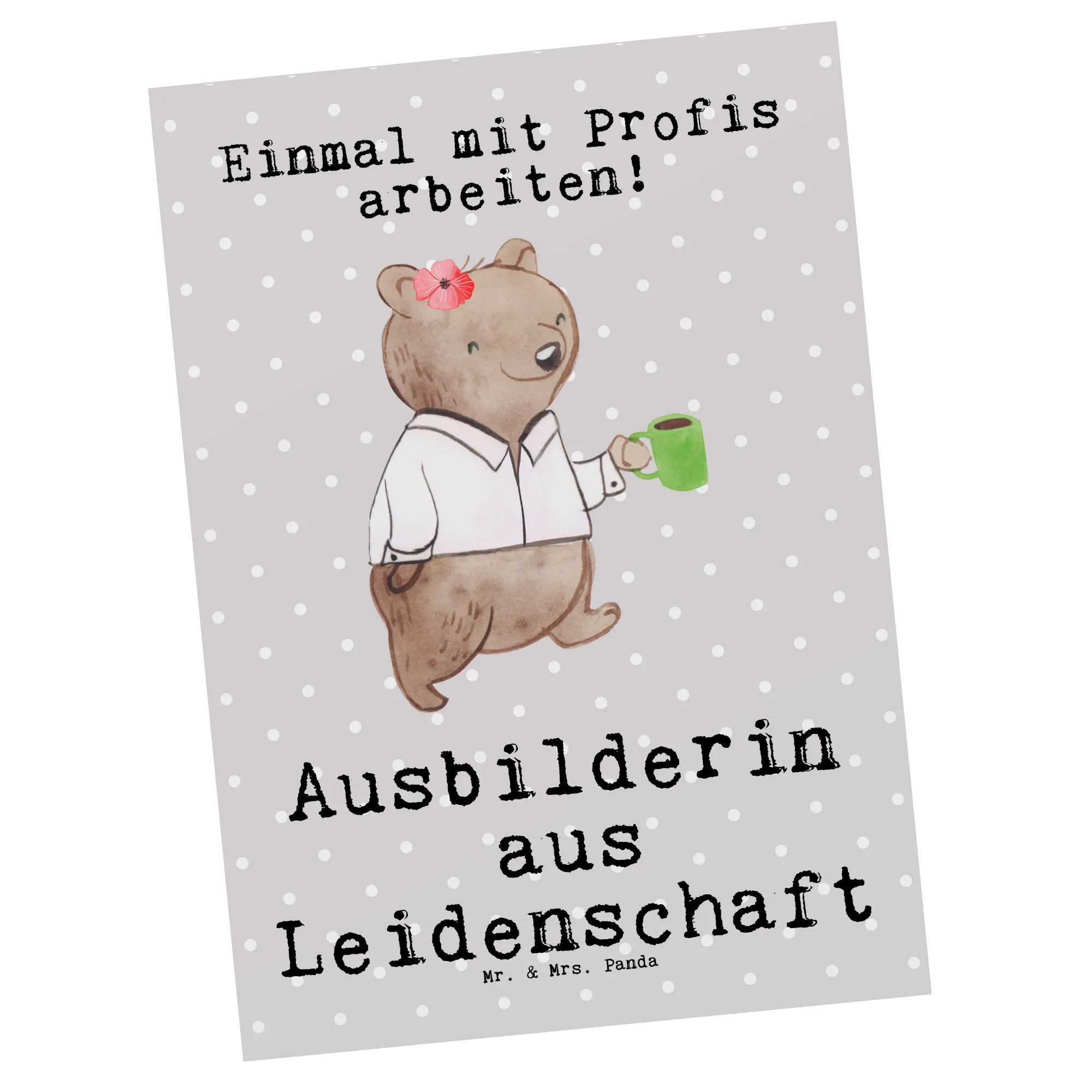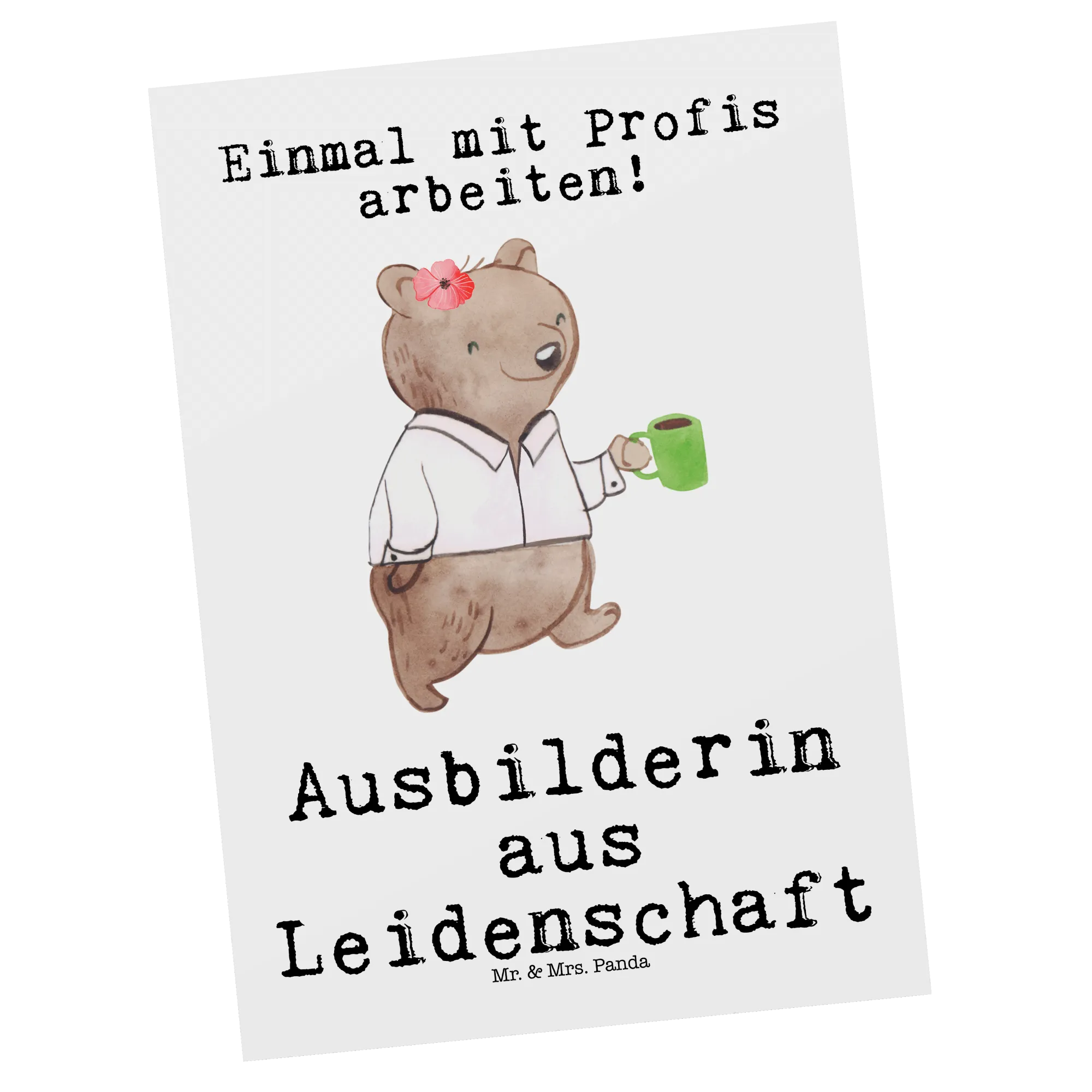 Die süße Bärendame mit einer Kaffeetasse in der Hand symbolisiert die Leidenschaft und Hingabe, die Ausbilderinnen in ihre Arbeit stecken. Mit dem Slogan "Ausbilderin aus Leidenschaft" wird die Botschaft noch persönlicher und einprägsamer. Die Karte hat eine blanko Rückseite zur individuellen Gestaltung, sodass du persönliche Worte der Dankbarkeit einfügen kannst.