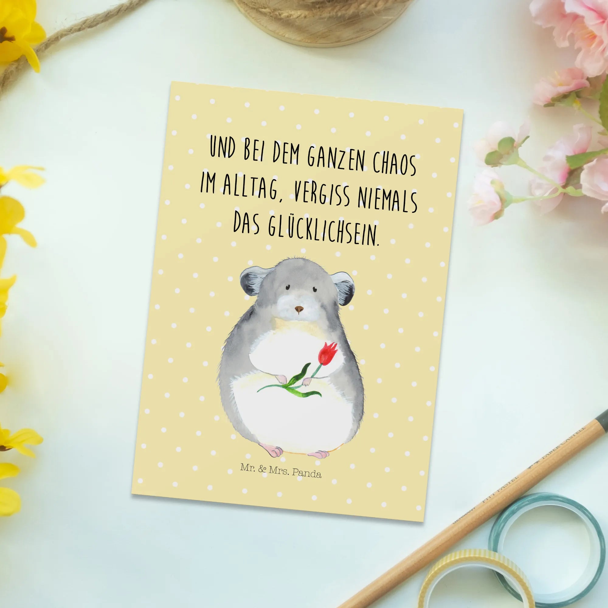 Diese liebevoll illustrierte Grußkarte zeigt ein entzückendes Chinchilla mit einer Blume in den Pfötchen und dem herzerwärmenden Spruch: „Und bei dem ganzen Chaos im Alltag, vergiss niemals das Glücklichsein.“ Der pastellige Gelbton im Hintergrund macht die Karte zu einem strahlenden Hingucker, der sofort gute Laune verbreitet.