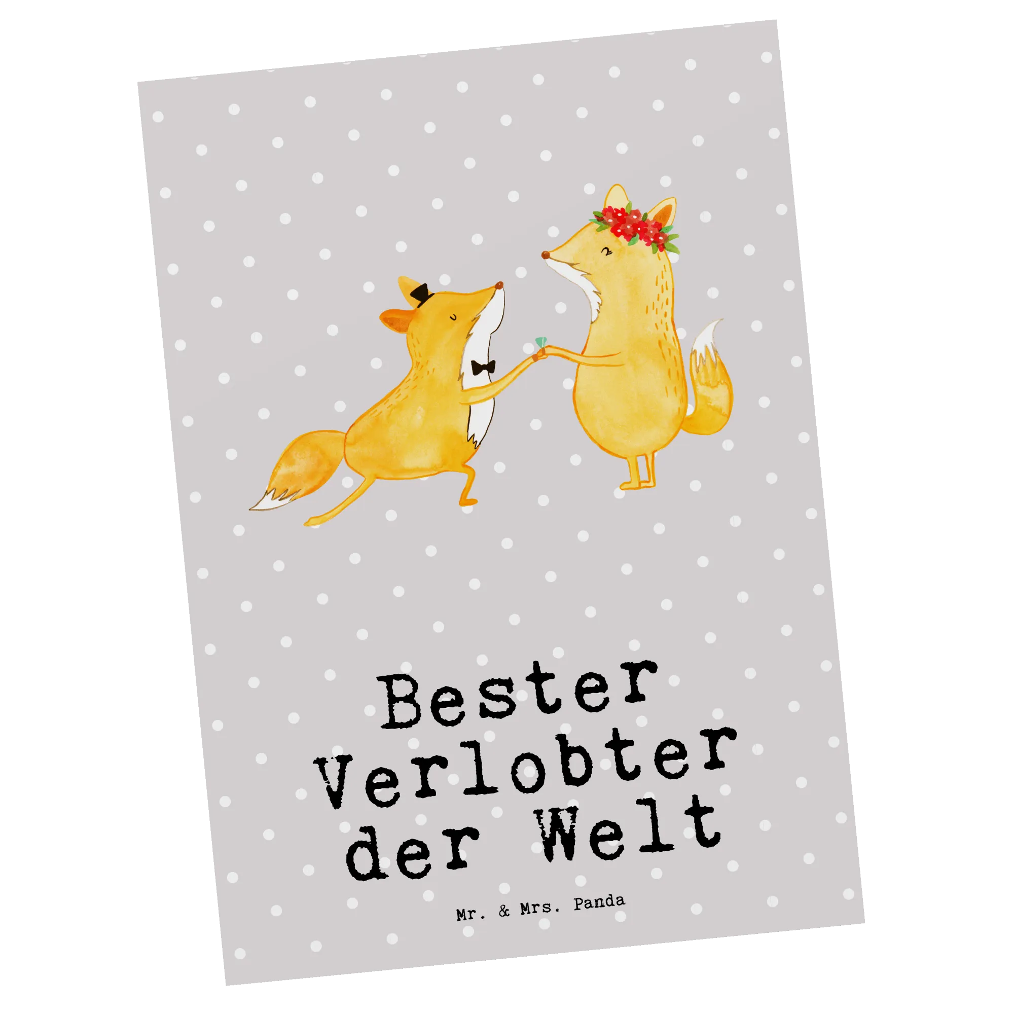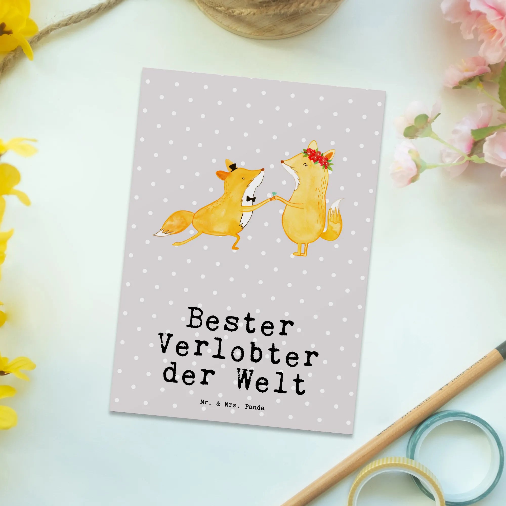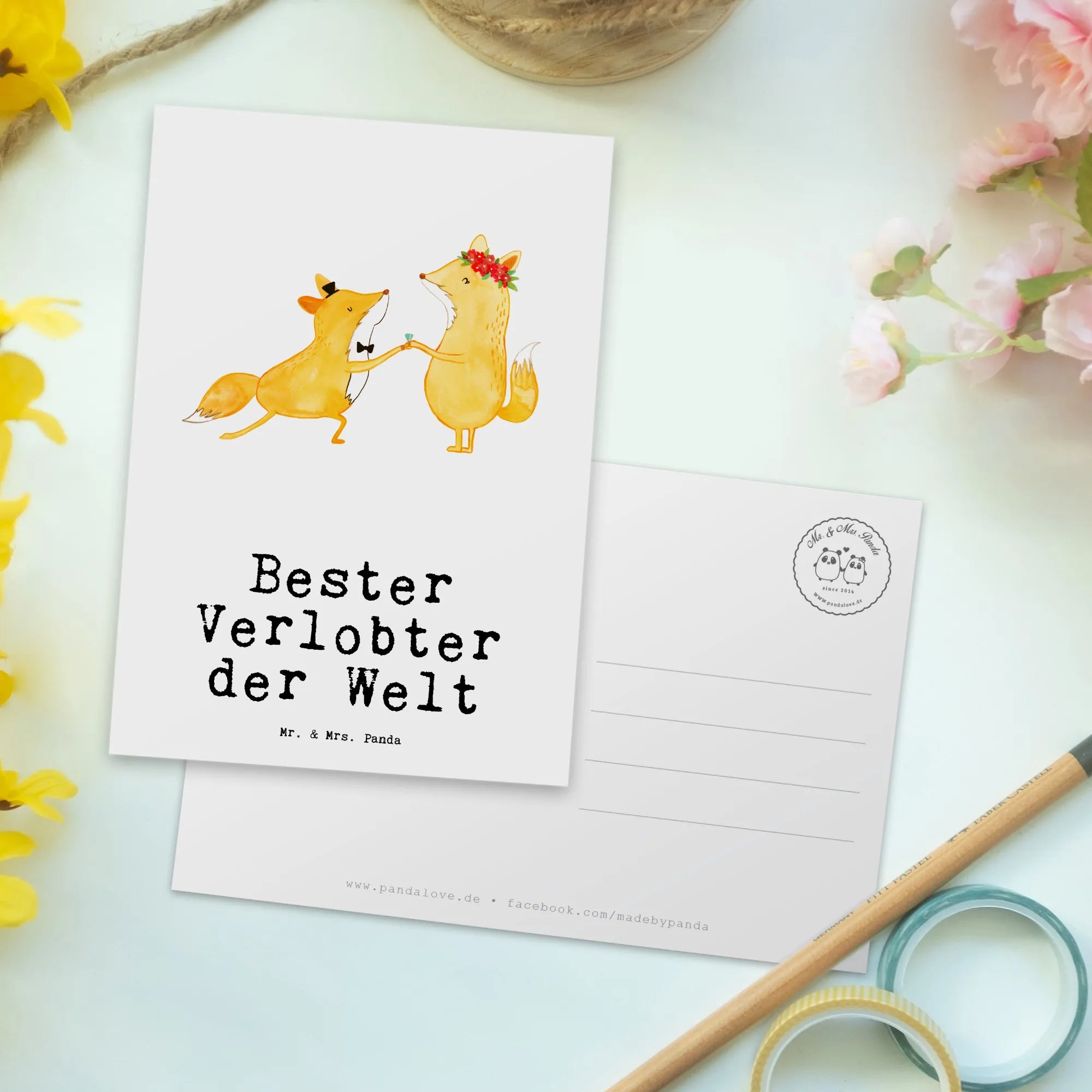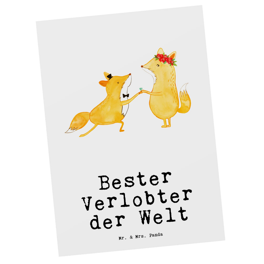 Die Postkarte "Fuchs Bester Verlobter der Welt" von Mr. & Mrs. Panda ist das perfekte Geschenk für deinen zukünftigen Ehemann. Mit ihrem liebevollen Design und dem motivierenden Slogan drückt diese Karte deine Wertschätzung für ihn aus. Die Karte zeigt einen niedlichen Fuchs, der seiner Fuchsin einen romantischen Heiratsantrag macht. Dieses einzigartige Motiv wird Herzen höher schlagen lassen!