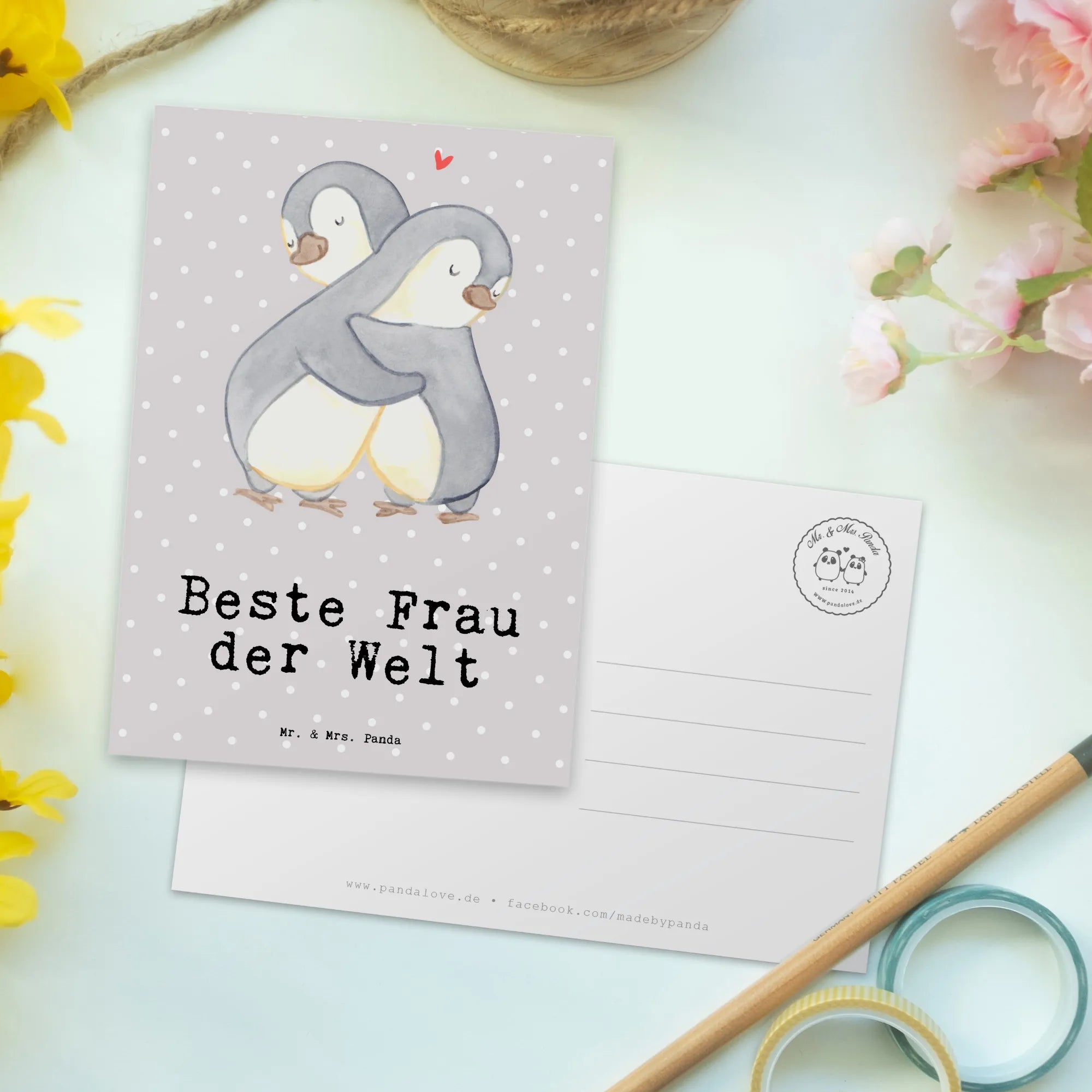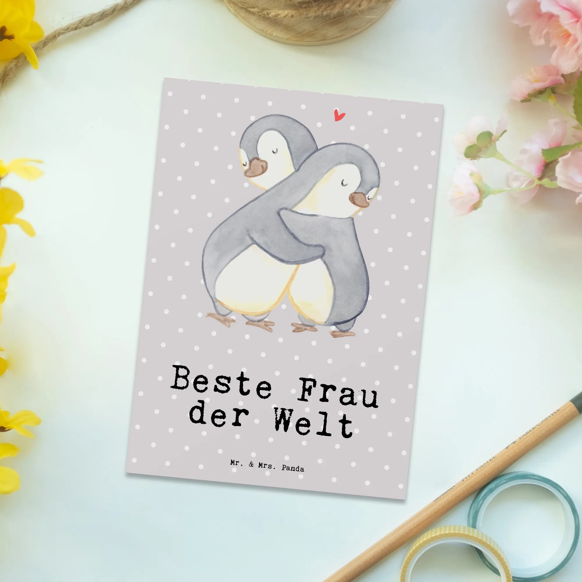 Schicke Freude mit dieser einzigartigen Postkarte von Mr. & Mrs. Panda und sorge dafür, dass der Tag deiner besten Frau zu etwas ganz Besonderem wird! Sie wird es dir danken und mit einem Lächeln reagieren. Verschenke Liebe in Kartenform – weil sie es wert ist. Hol dir jetzt die Postkarte "Pinguin Beste Frau der Welt" und mach einem besonderen Menschen eine unvergessliche Freude!