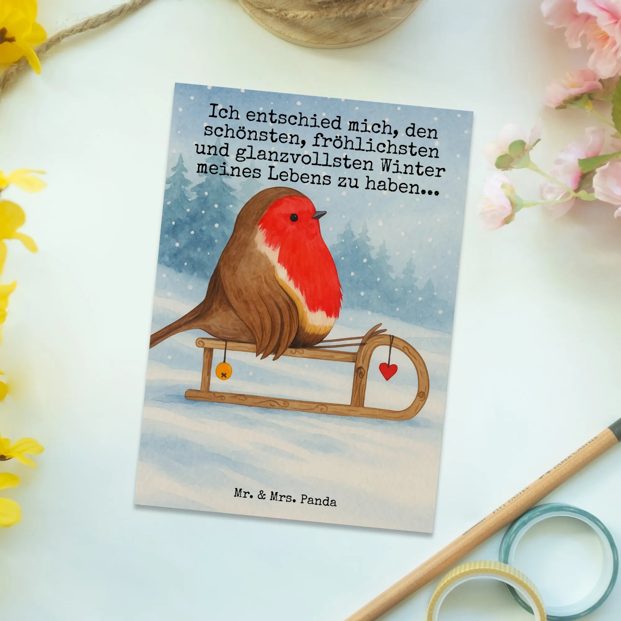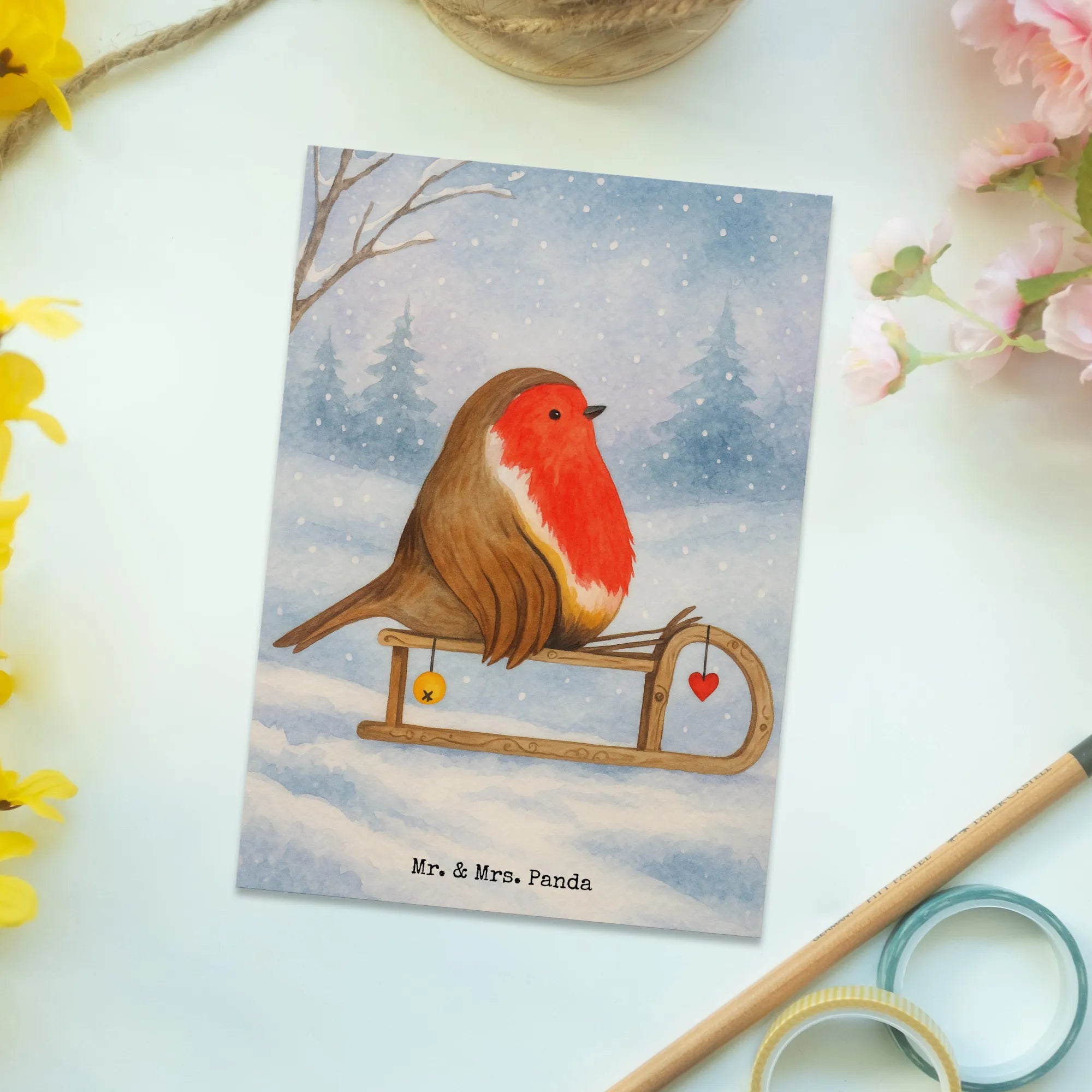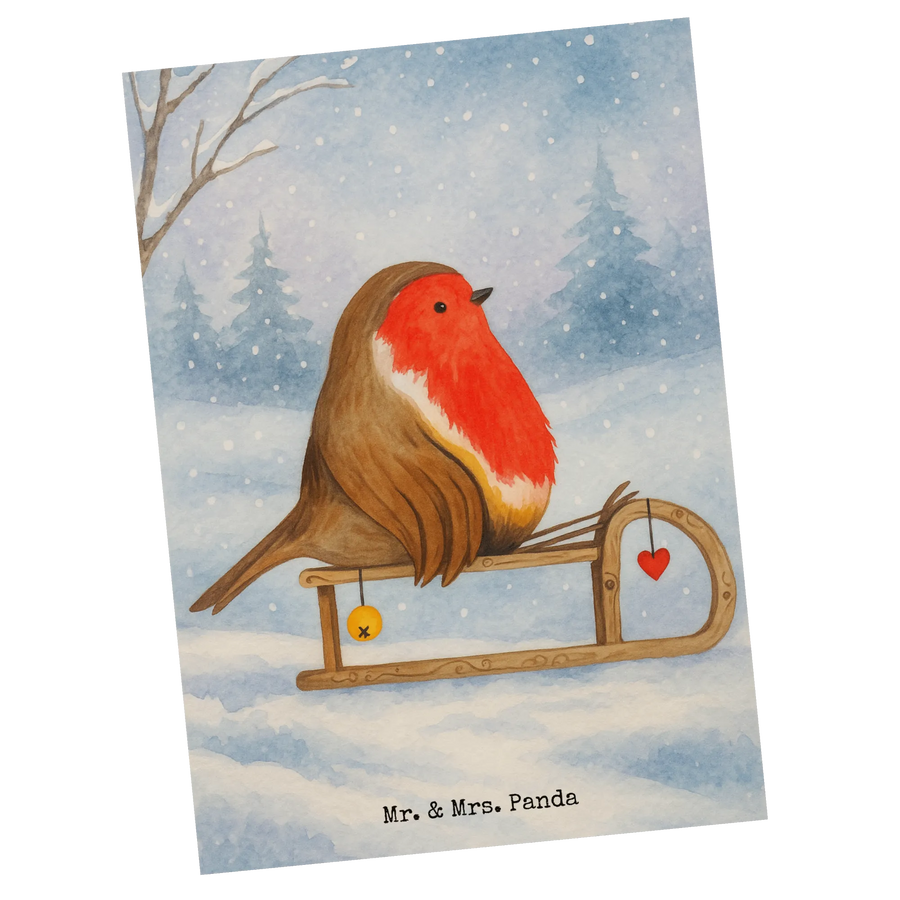 Liebevolles Design: Das Motiv wurde von Mrs. Panda in Aquarell handgezeichnet und fängt die märchenhafte Stimmung der Winter Kollektion ein. Die hochwertige Veredelung der Vorderseite lässt das Rotkehlchen auf dem Schlitten besonders strahlen, während die Rückseite blanko bleibt und Raum für deine persönlichen Worte bietet.