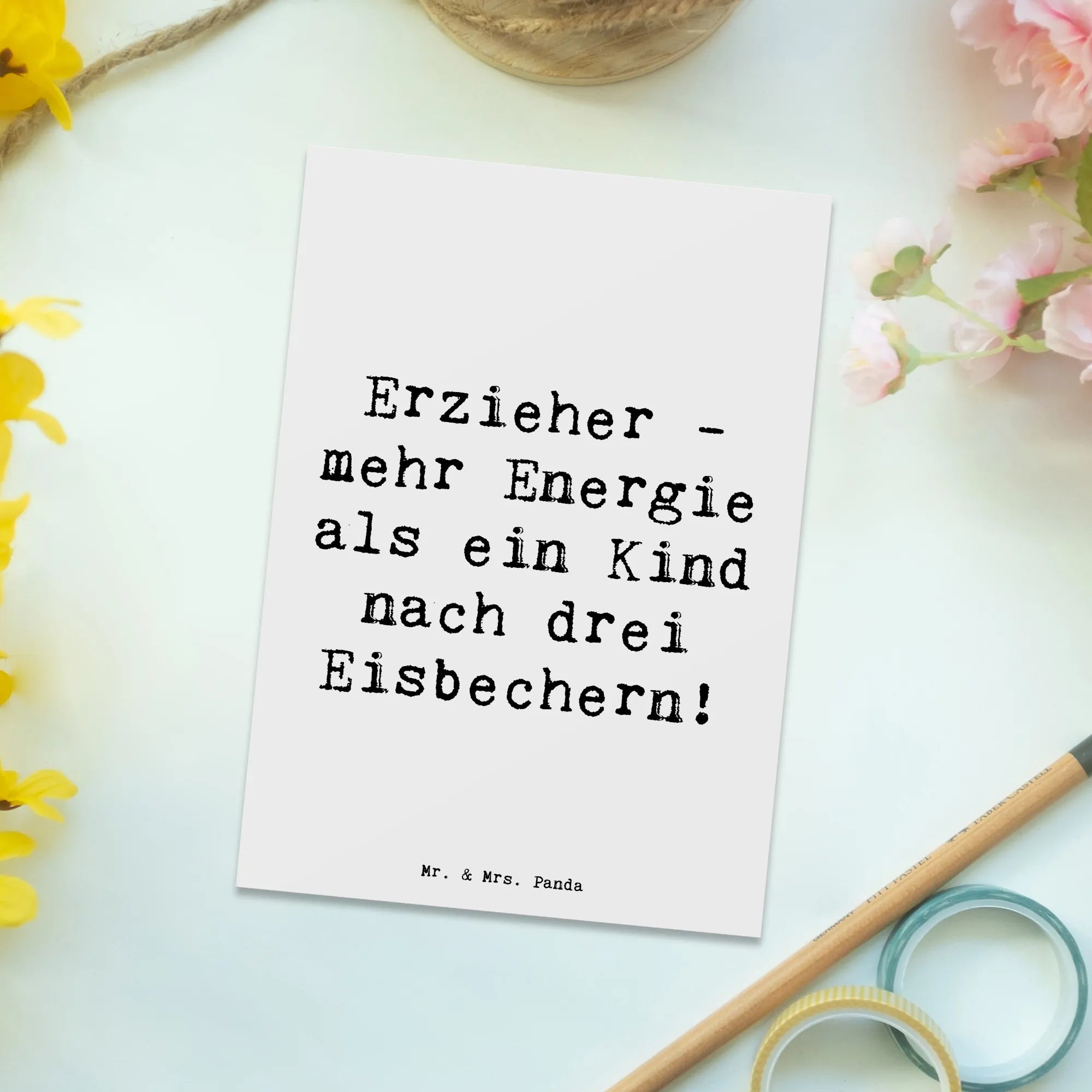 Wenn du auf der Suche nach dem perfekten Geschenk für einen Erzieher bist, dann haben wir bei Mr. & Mrs. Panda genau das Richtige für dich! Unsere Postkarte aus der Kollektion „Berufe“ zeigt liebevoll das Motiv ‚Erzieher - mehr Energie als ein Kind nach drei Eisbechern!‘. Diese einzigartige Postkarte ist ein wunderbares Zeichen der Wertschätzung für die, die Tag für Tag mit Leidenschaft und Energie für unsere Kinder da sind.