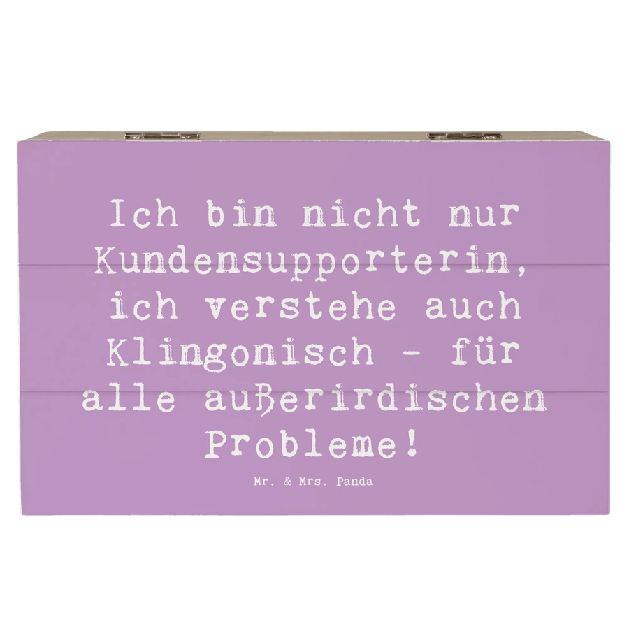 Diese wunderschöne Holzkiste von Mr. & Mrs. Panda ist das perfekte Geschenk für alle, die im Kundenservice arbeiten oder einfach nur die großartigen Fähigkeiten und die Hilfsbereitschaft von Kundensupporterinnen schätzen. Mit dem liebevoll gestalteten Motiv 'Ich bin nicht nur Kundensupporterin, ich verstehe auch Klingonisch - für alle außerirdischen Probleme!' wird jeder, der diese Holzkiste sieht, sofort ein Lächeln auf den Lippen haben.