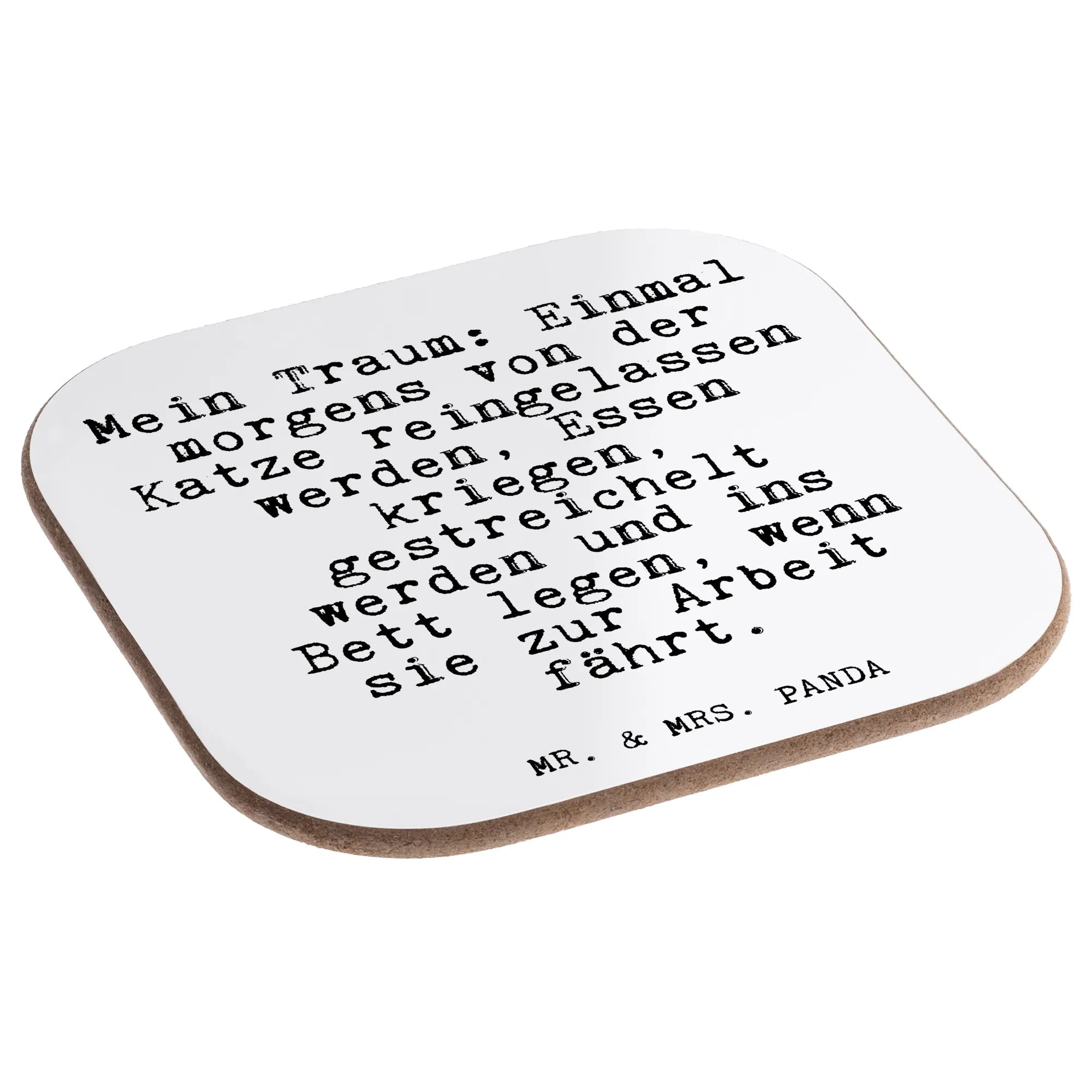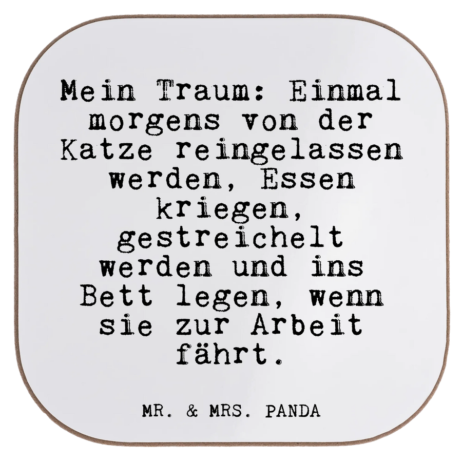 Du suchst nach dem perfekten Geschenk für dich selbst oder deine Katzenliebhaber-Freunde? Dann ist unser wunderschöner quadratischer Untersetzer von Mr. & Mrs. Panda genau das Richtige! Bedruckt mit dem witzigen Spruch: "Mein Traum: Einmal morgens von der Katze reingelassen werden, Essen kriegen, gestreichelt werden und ins Bett legen, wenn sie zur Arbeit fährt." ist dieser Untersetzer nicht nur eine praktische Ergänzung für jede Kaffeetasse oder jedes Glas, sondern bringt auch ein Lächeln in deinen Alltag.