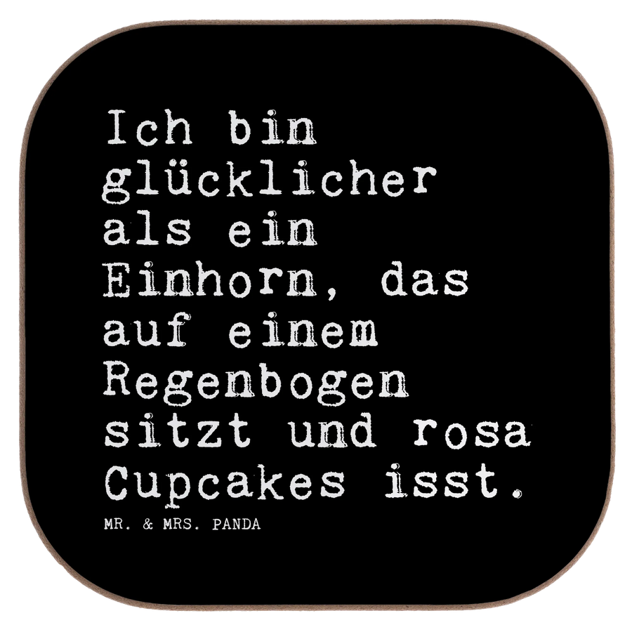 Bring Magie in deinen Alltag: Der quadratische Untersetzer von Mr. & Mrs. Panda trägt den frechen Spruch „Ich bin glücklicher als ein Einhorn, das auf einem Regenbogen sitzt und rosa Cupcakes isst.“ und zaubert sofort gute Laune in Küche, Wohnzimmer oder auf der Terrasse.