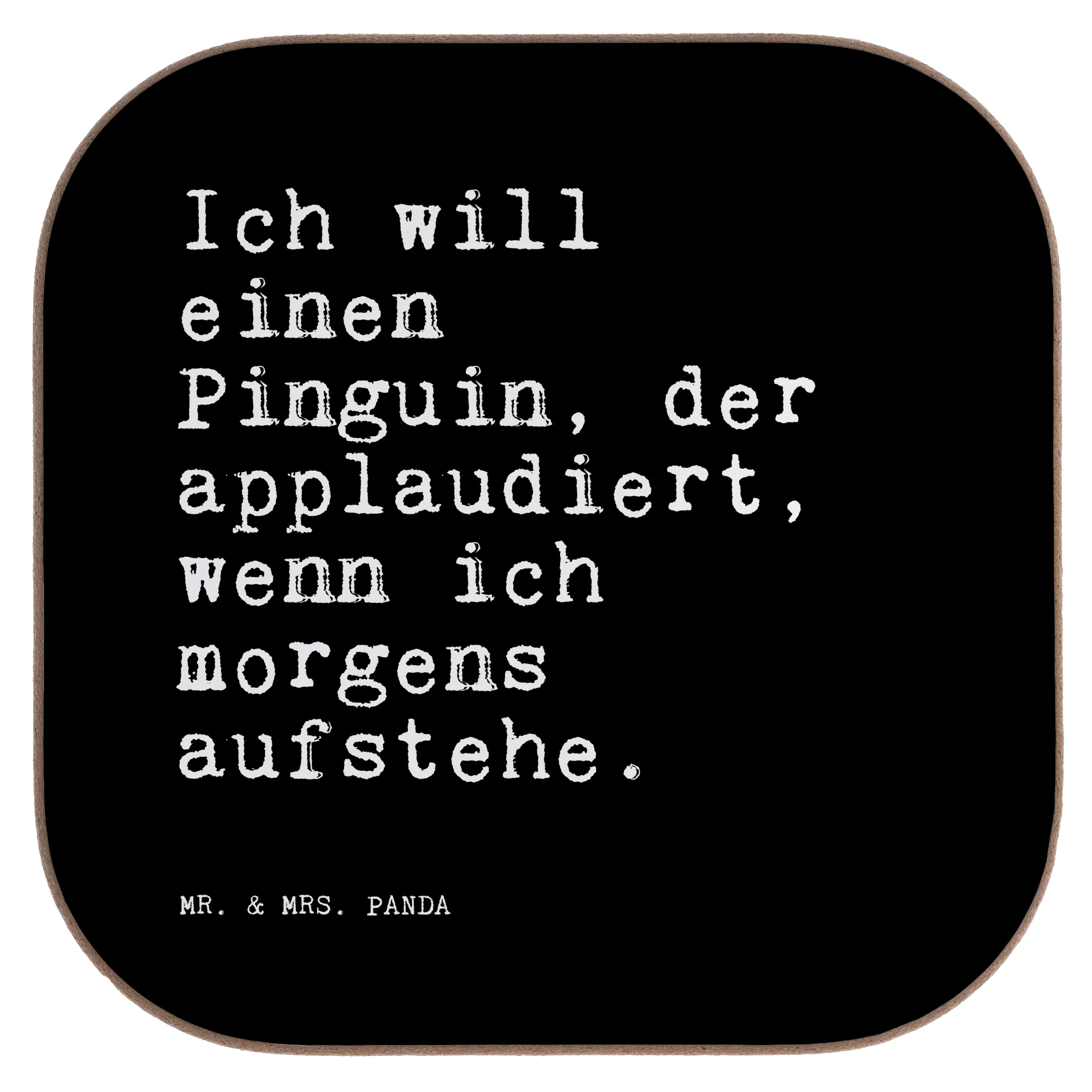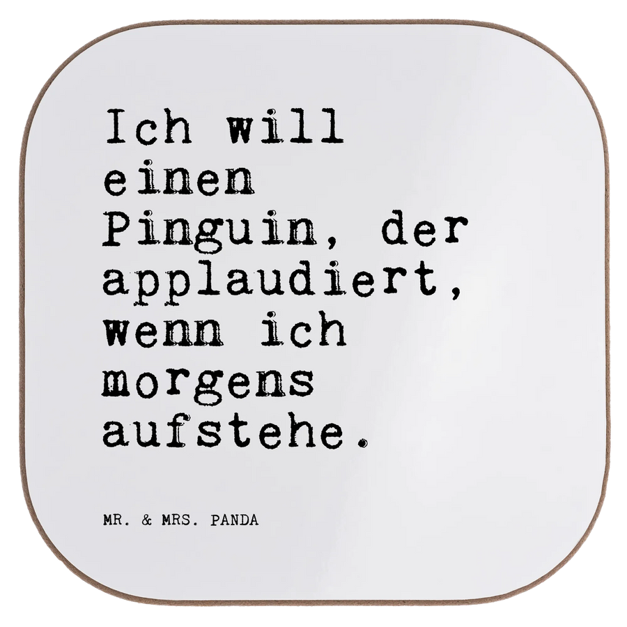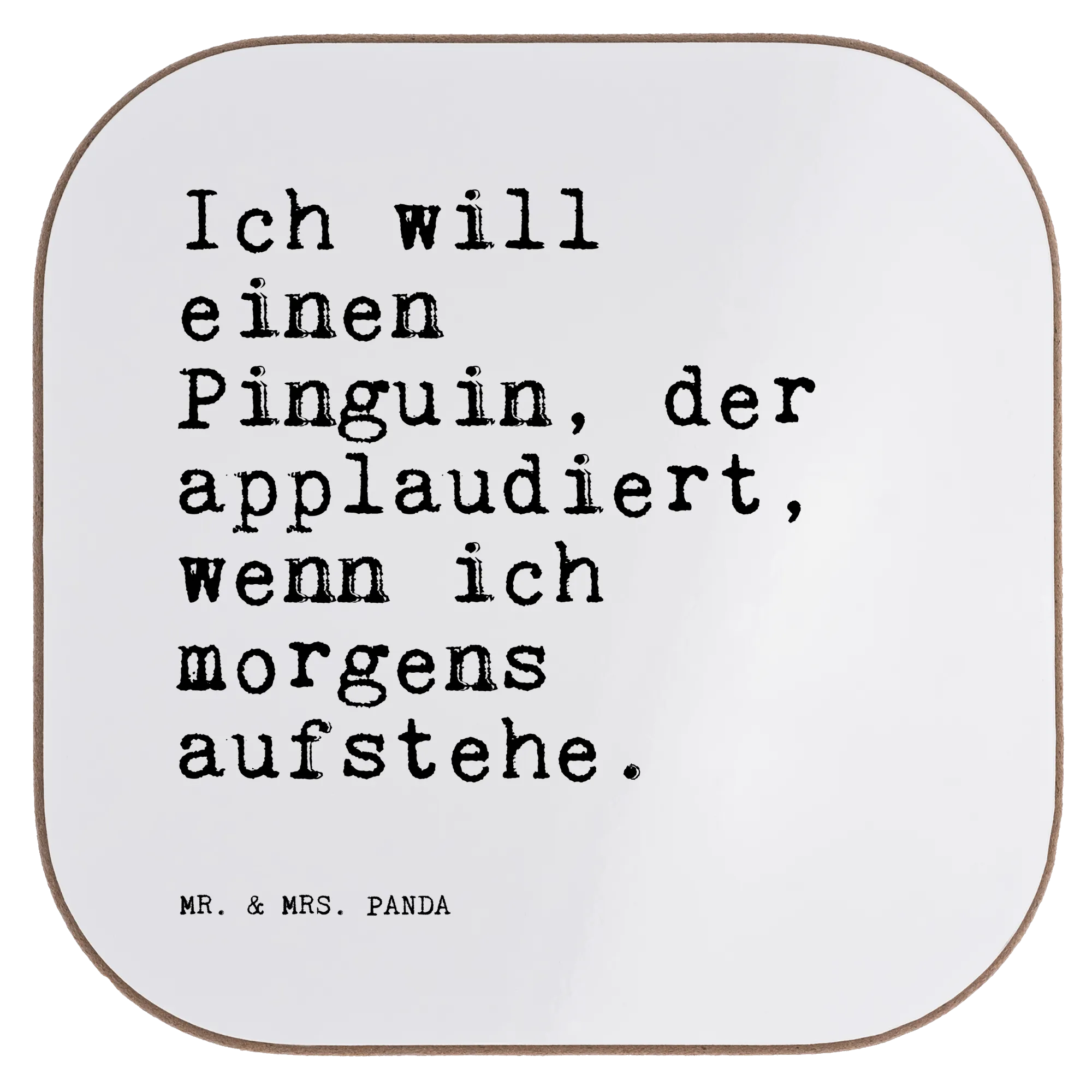 Bring gute Laune auf den Tisch! Unser quadratischer Untersetzer von Mr. & Mrs. Panda trägt den frechen Spruch: „Ich will einen Pinguin, der applaudiert, wenn ich morgens aufstehe.“ und ist damit das perfekte Geschenk für Morgenmuffel, Freundinnen und alle, die Humor am Frühstückstisch lieben. 😊