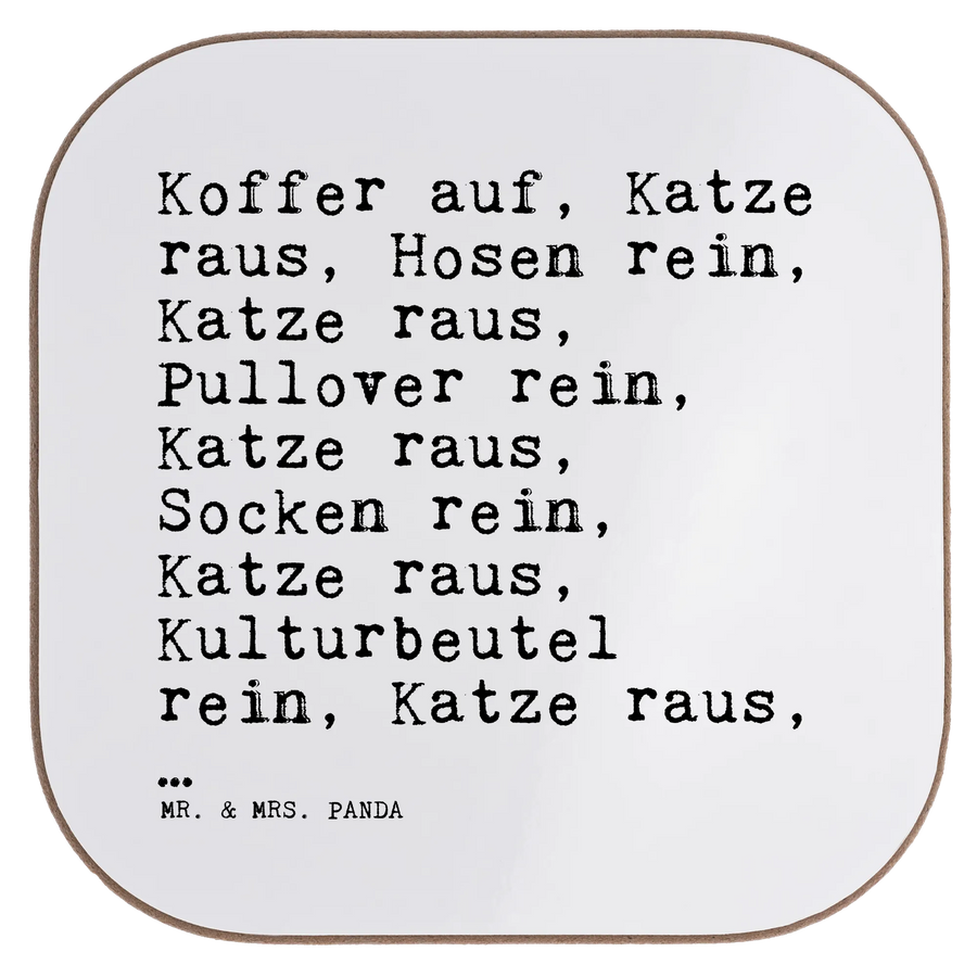 Quadratische Untersetzer Sprüche und Zitate Koffer auf, Katze raus, Hosen rein, Katze raus, Pullover rein, Katze raus, Socken rein, Katze raus, Kulturbeutel rein, Katze raus, … - Weiß