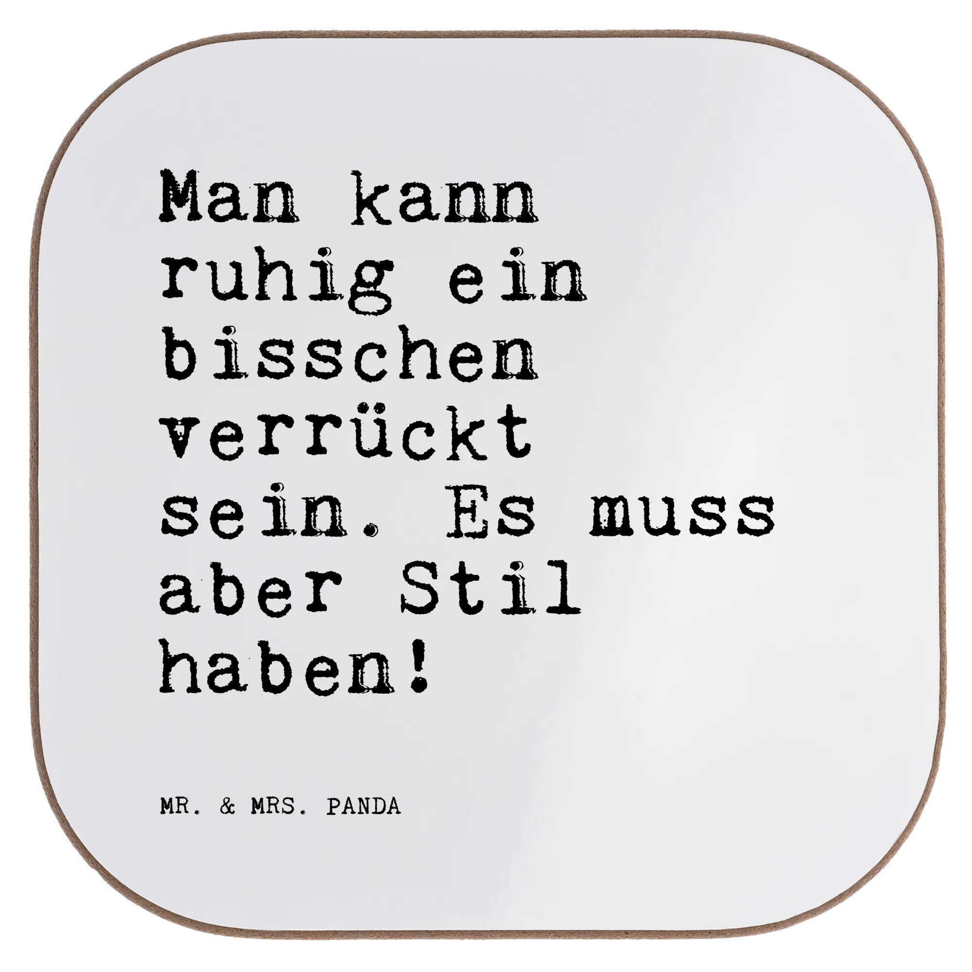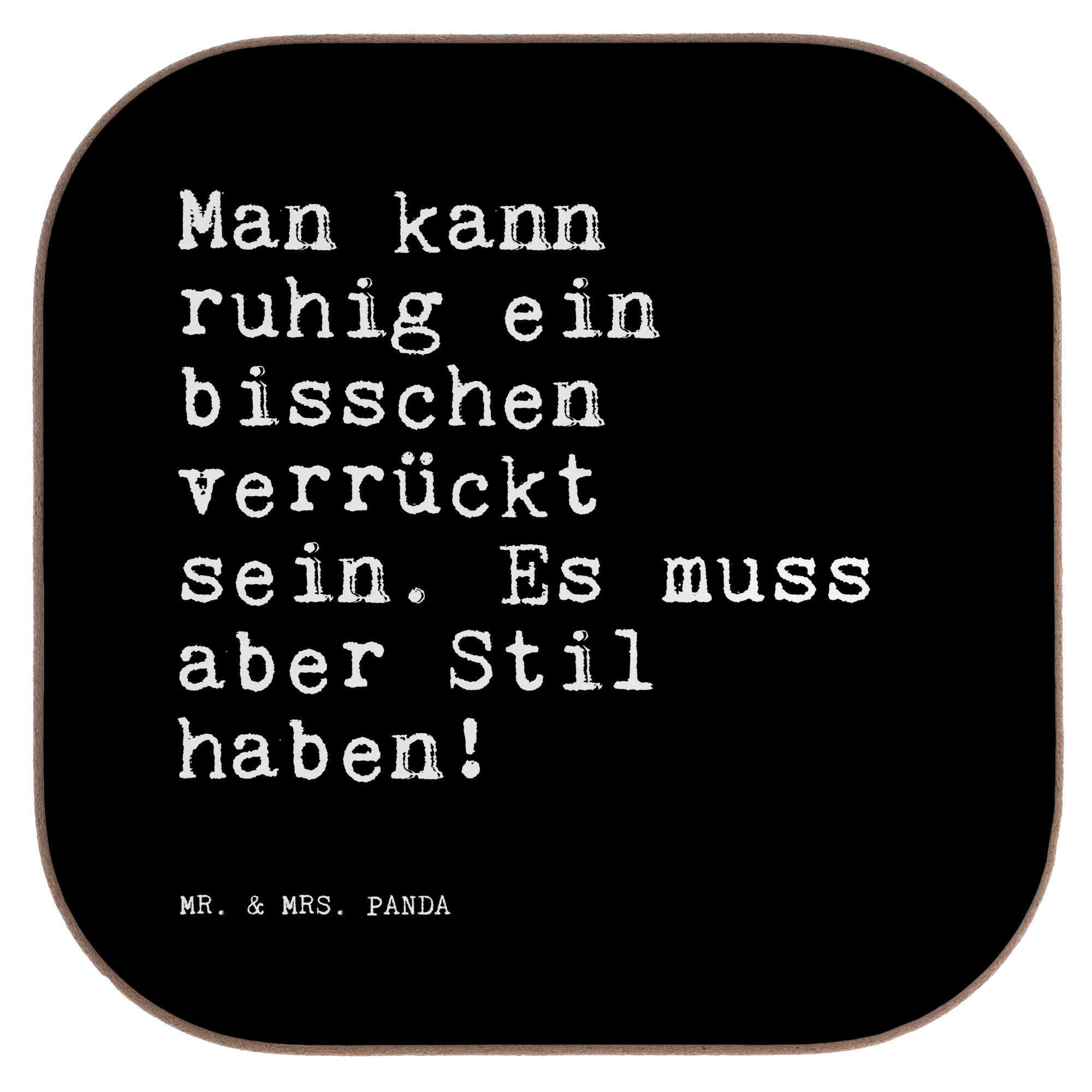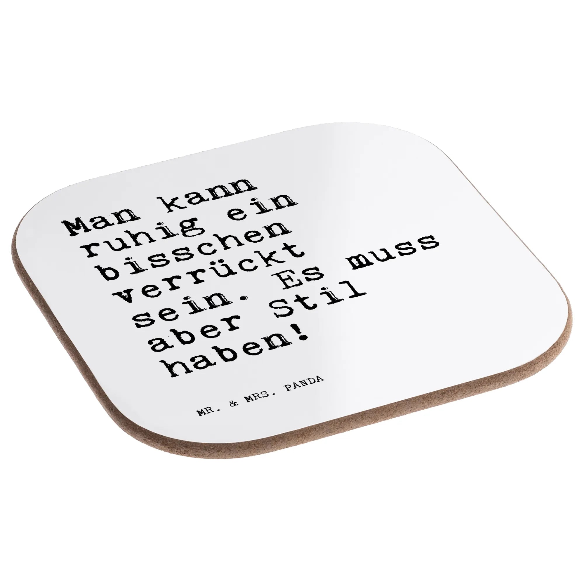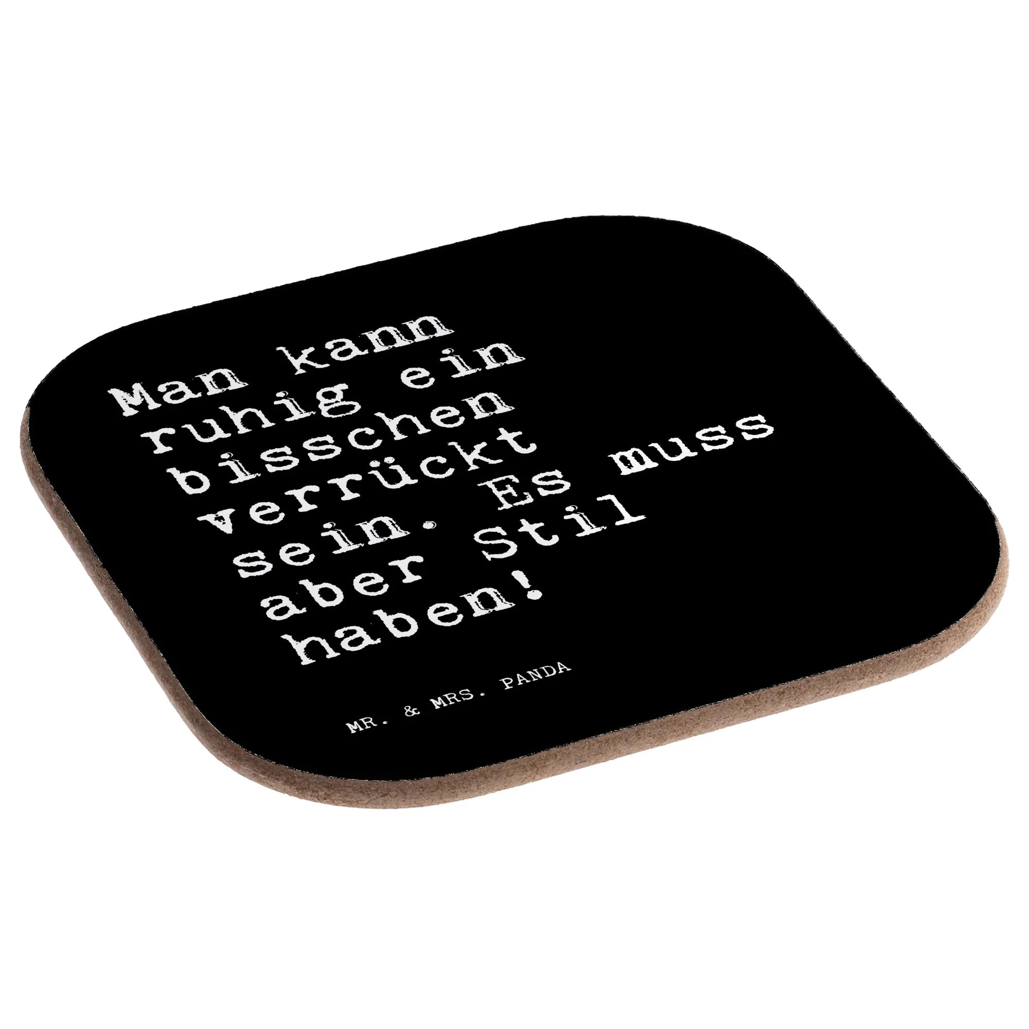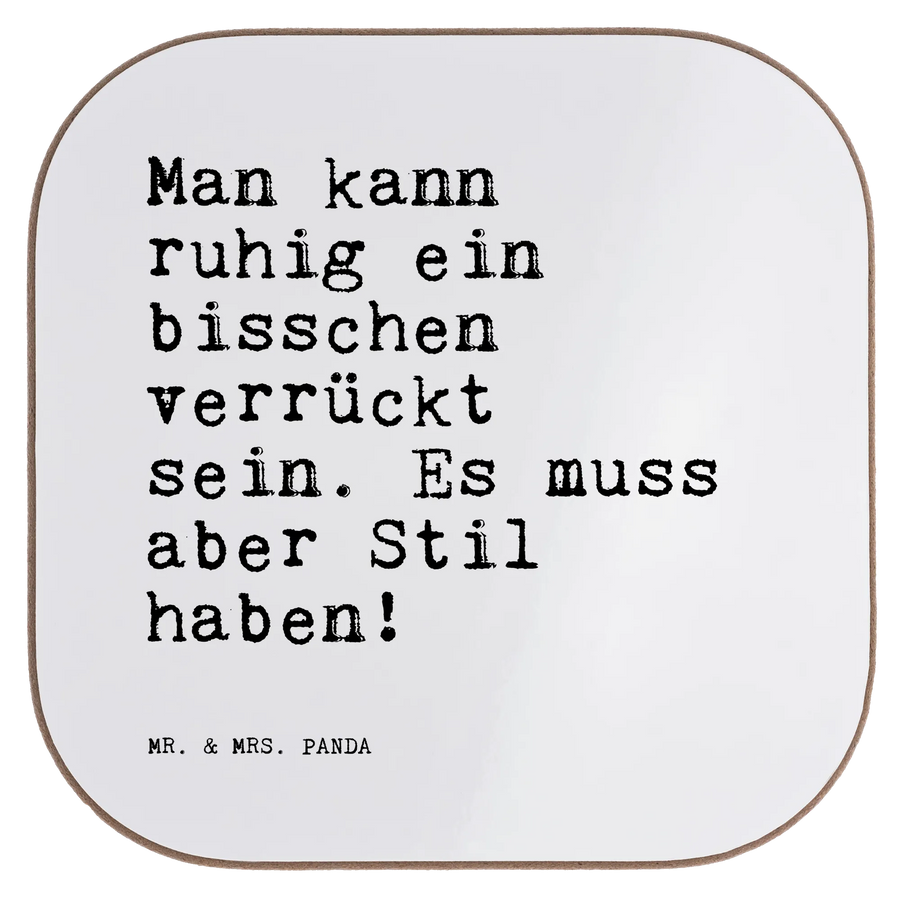 Ein wunderschöner quadratischer Untersetzer von Mr. & Mrs. Panda – dekorativ, praktisch und mit einer Prise Humor. Der Untersetzer ist bedruckt mit dem Spruch: „Man kann ruhig ein bisschen verrückt sein. Es muss aber Stil haben!“ und bringt damit Charme und Persönlichkeit auf Deine Tasse, Dein Glas oder Deine Flasche.