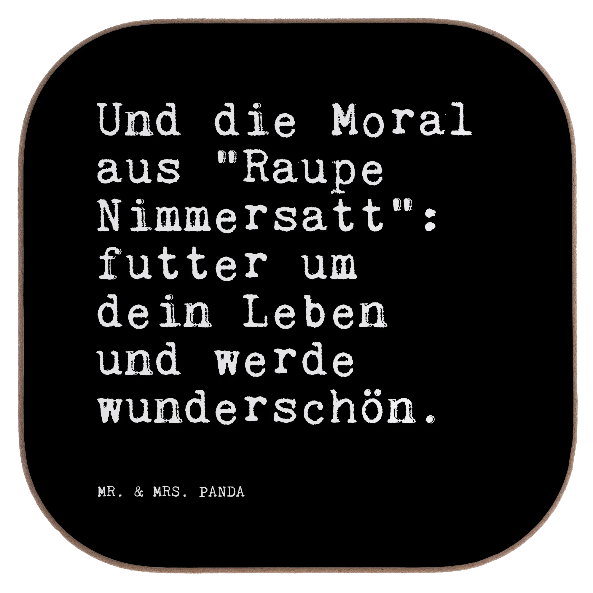 Quadratische Untersetzer Sprüche und Zitate Und die Moral aus "Raupe Nimmersatt": futter um dein Leben und werde wunderschön. - Schwarz