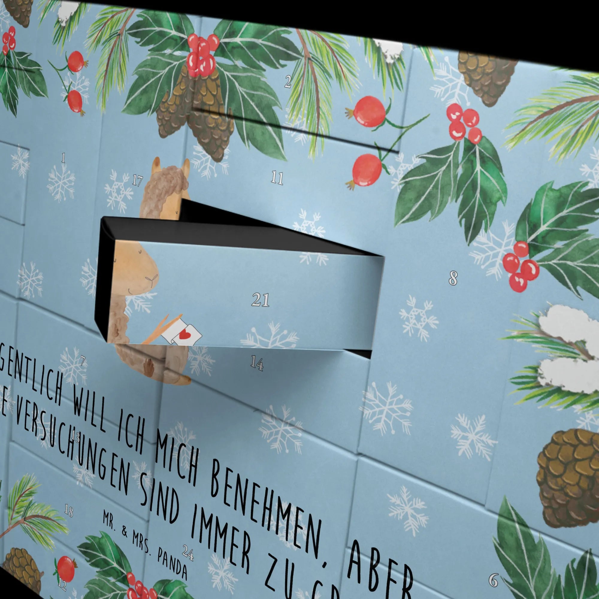 Der Befüllbare Adventskalender Alpaka Fahne von Mr. & Mrs. Panda ist das perfekte Geschenk für alle Alpaka-Liebhaber und diejenigen, die die Vorfreude auf Weihnachten zelebrieren möchten! Mit einer liebevollen Zeichnung von Mrs. Panda auf der Frontseite und dem Motto 'Eigentlich will ich mich benehmen, aber die Versuchungen sind immer zu groß' bringt dieser Kalender nicht nur Freude, sondern auch ein Lächeln in jedes Zuhause.
