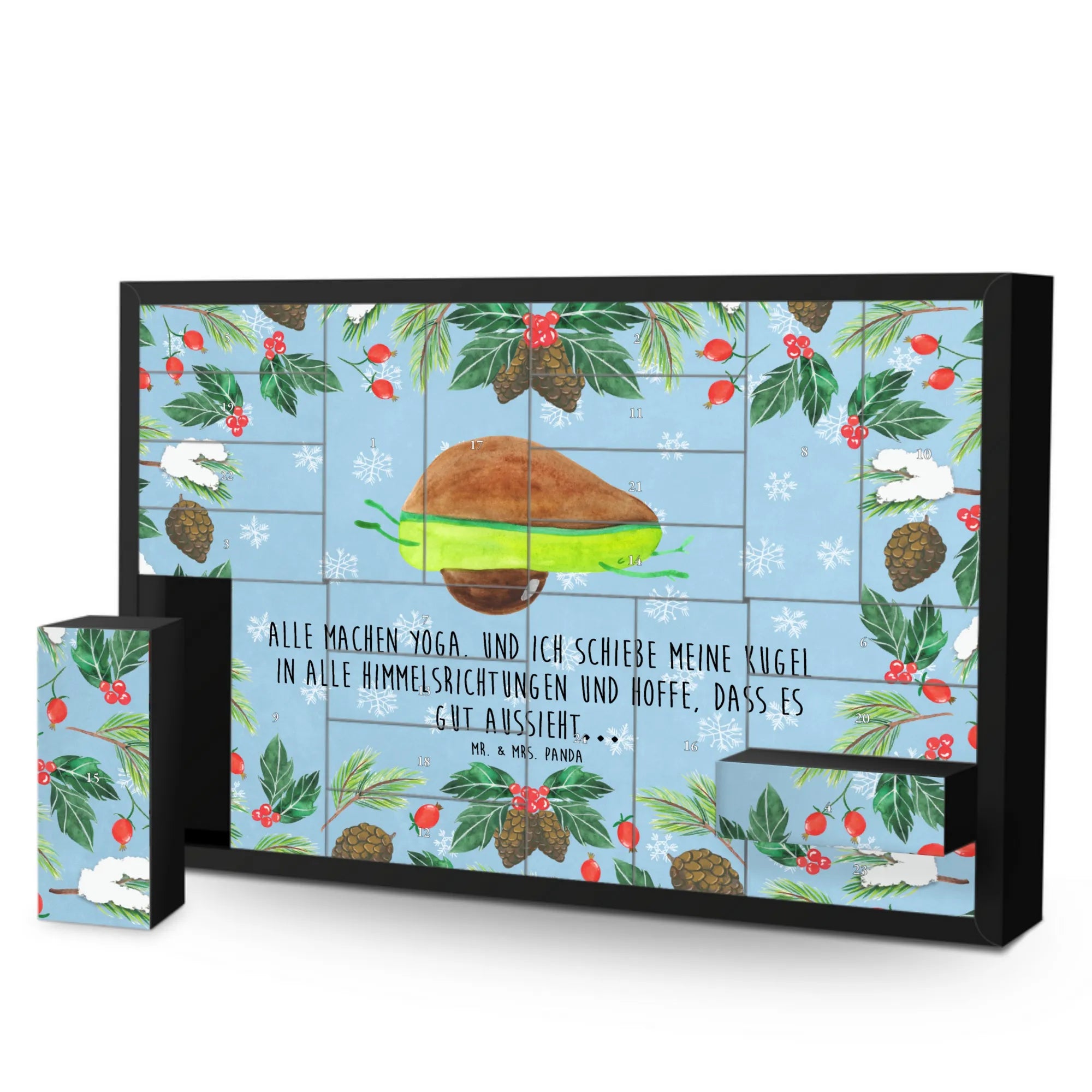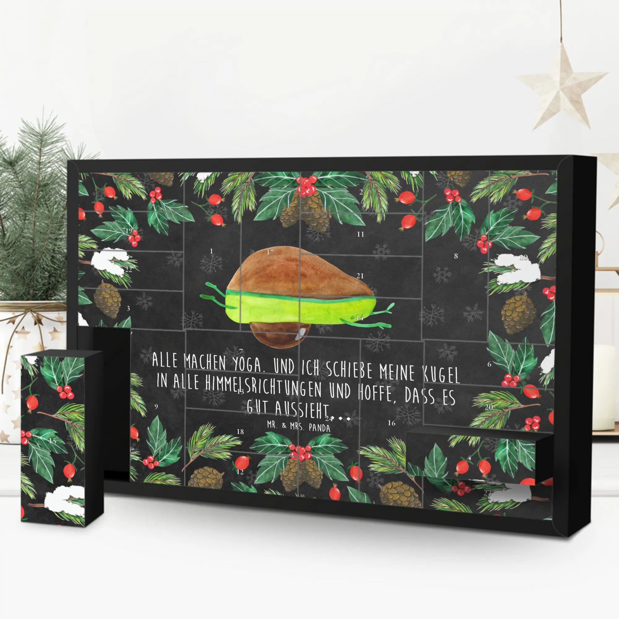 Der Befüllbare Adventskalender Avocado Yoga von Mr. & Mrs. Panda ist das perfekte Geschenk für alle, die eine kleine Portion Humor und Freude in der Vorweihnachtszeit lieben. Mit seinem niedlichen Motiv einer tollpatschigen Avocado, die sich beim Yoga versucht, bringt dieser Adventskalender nicht nur ein Lächeln auf die Lippen, sondern auch eine charmante Note in jedes Zuhause.