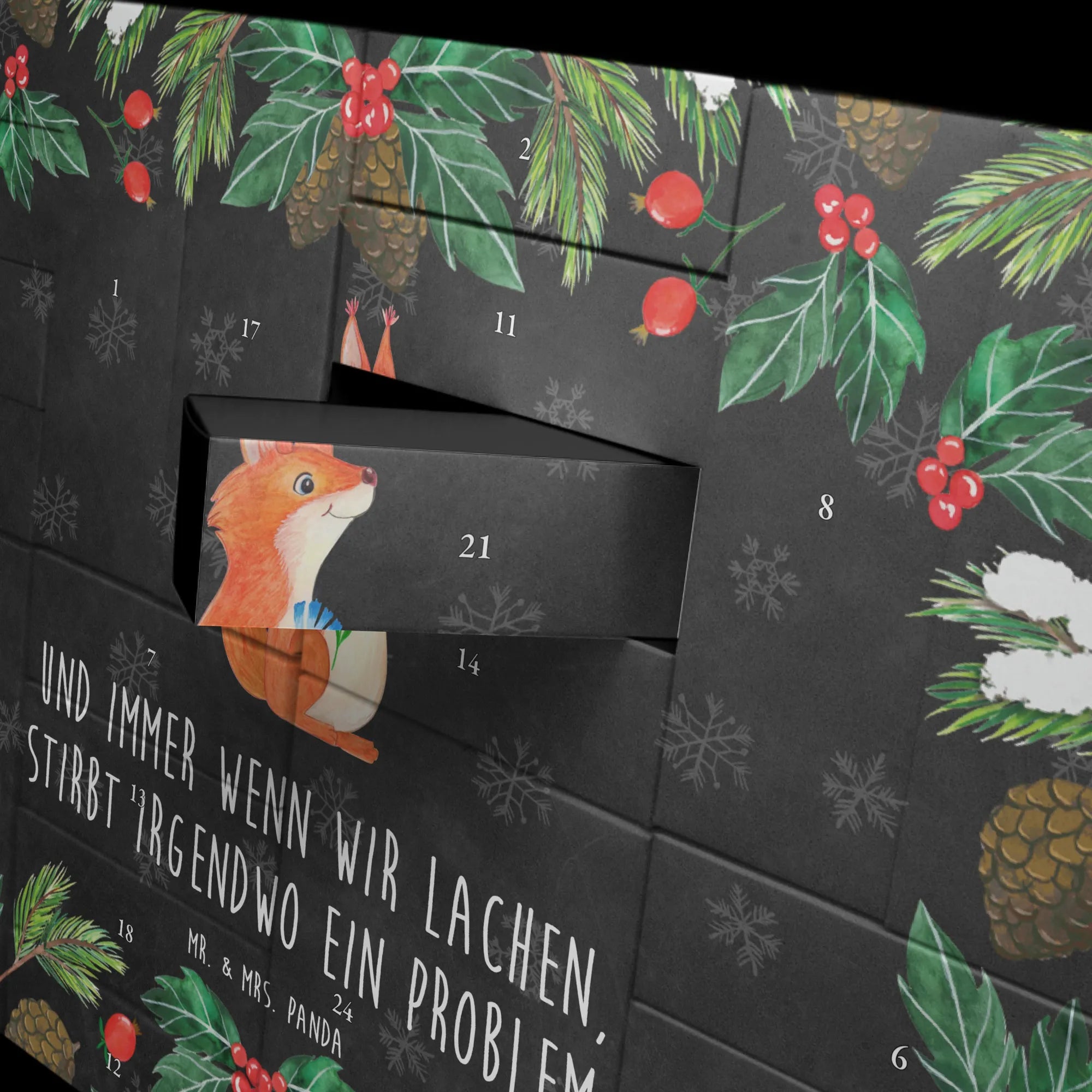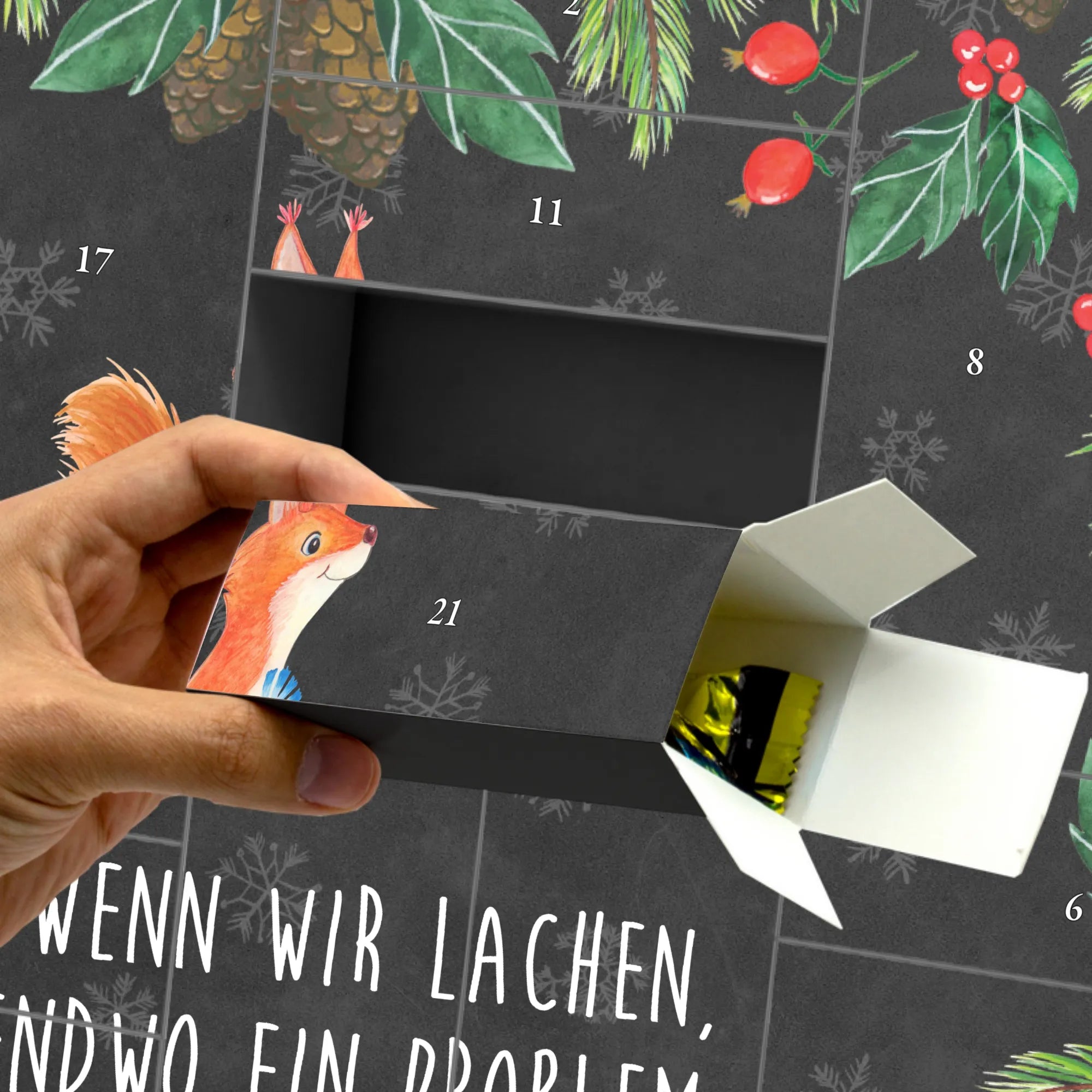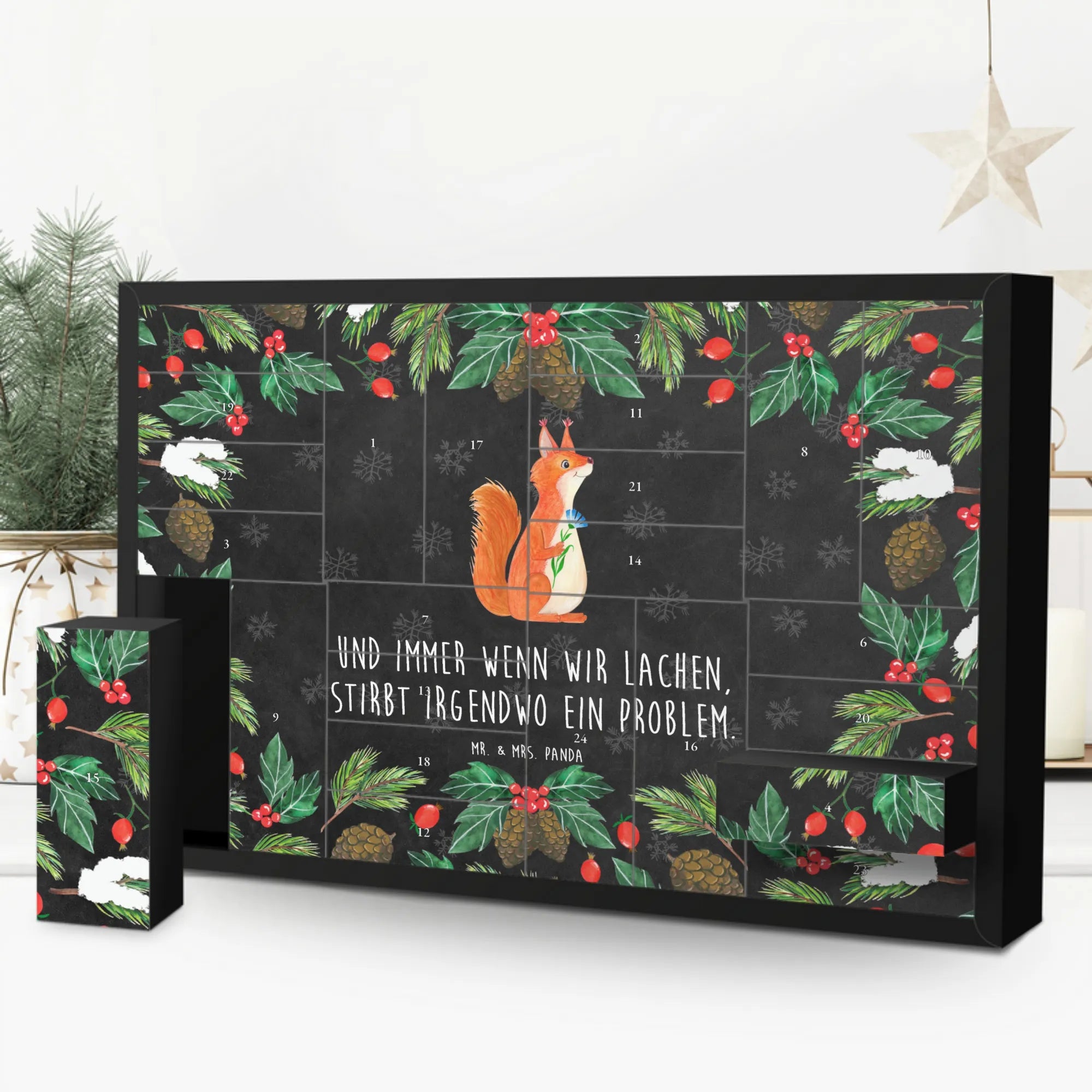 Dieser liebevoll gestaltete Adventskalender zum Selbstbefüllen zaubert dir und deinen Lieben ein Lächeln ins Gesicht. Das niedliche Eichhörnchen mit Blume, handgezeichnet von Mrs. Panda, und der positive Spruch „Und immer wenn wir lachen, stirbt irgendwo ein Problem.“ schenken jeden Dezember eine kleine Portion Glück und gute Laune.