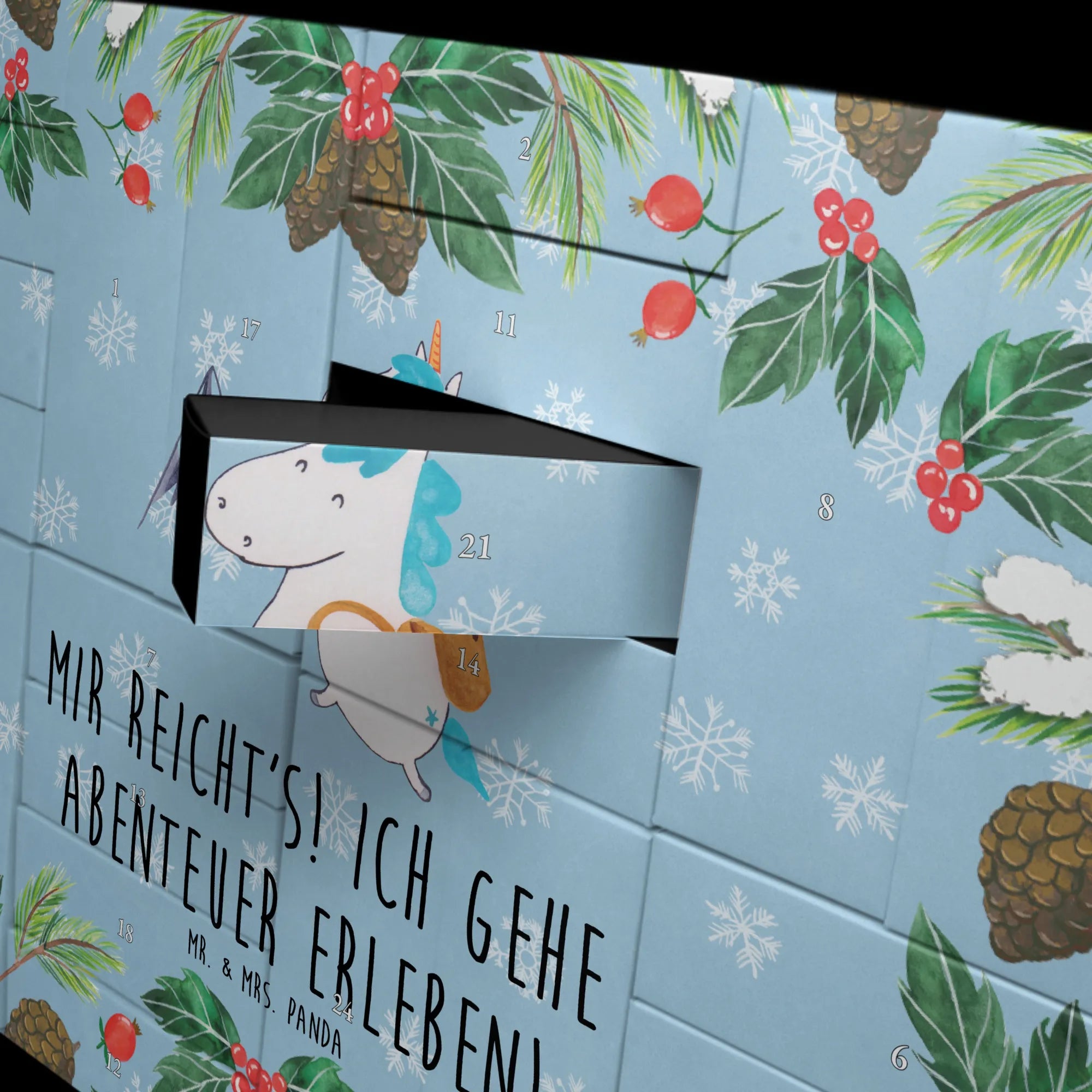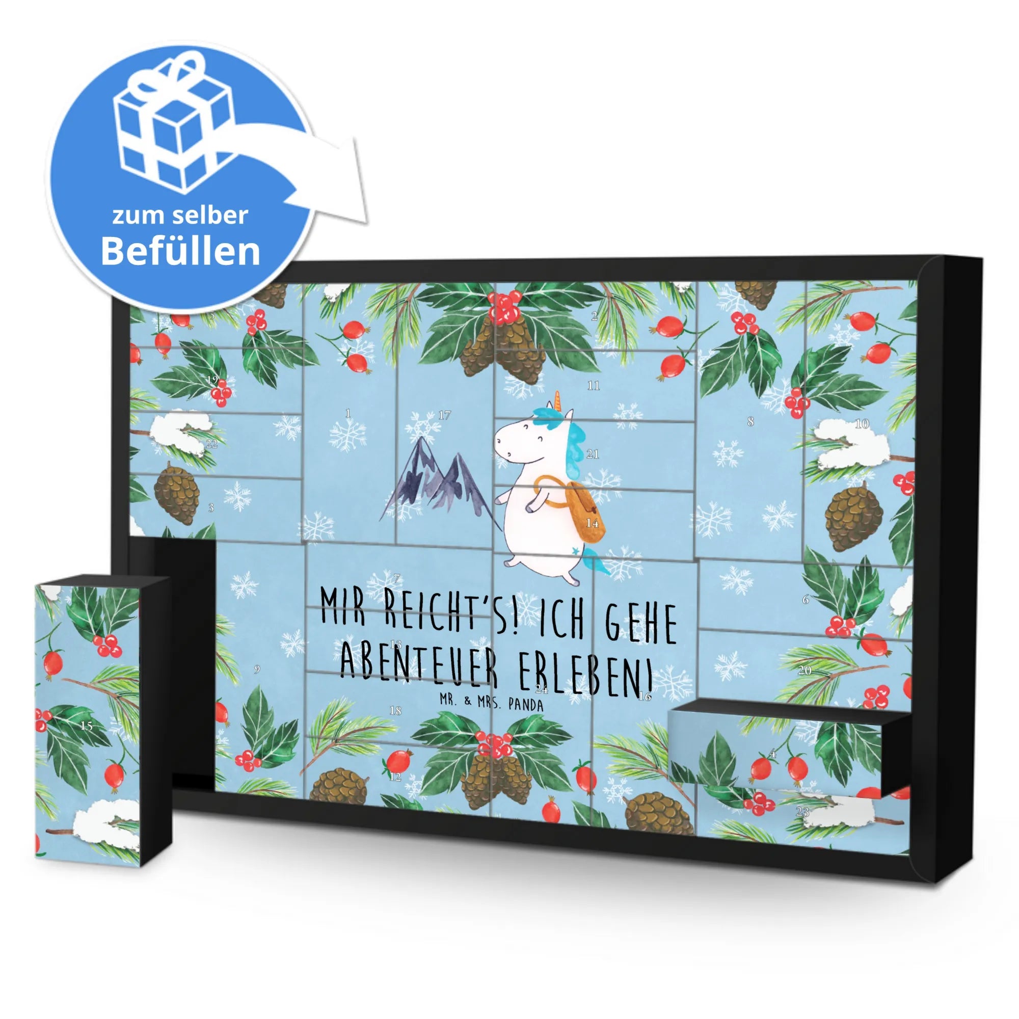 Der perfekte Adventskalender für kleine und große Abenteurer: Unser befüllbarer Adventskalender „Einhorn Bergsteiger“ aus der Einhorn - Kollektion von Mr. & Mrs. Panda verbindet zauberhafte Illustration mit Abenteuerlust. Das Motiv zeigt ein niedliches Einhorn mit Rucksack, das in die Berge aufbricht – begleitet vom Spruch „Mir reicht's! Ich gehe Abenteuer erleben!“