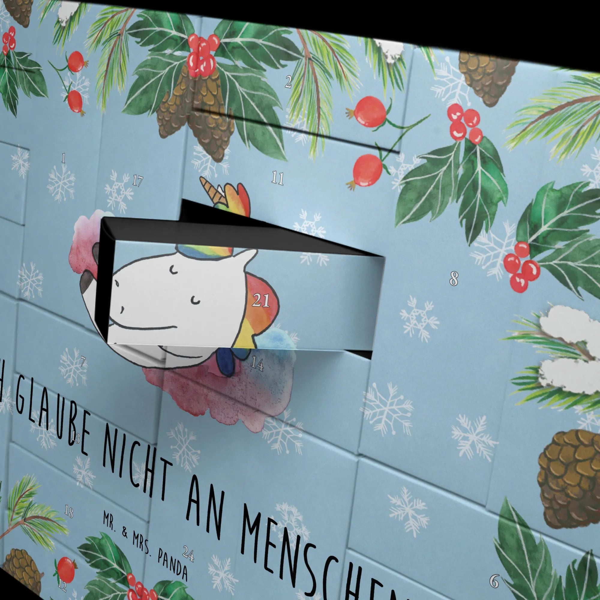 Der befüllbare Adventskalender Einhorn Wolke 7 von Mr. & Mrs. Panda ist nicht nur ein wunderschönes Dekorationselement, sondern auch das perfekte Geschenk für alle Einhorn-Liebhaber! Egal, ob für Kinder oder für junggebliebene Erwachsene, dieser Adventskalender bringt jeden Tag ein neues strahlendes Lächeln. Auf der Vorderseite ist ein liebevolles, handgezeichnetes Motiv von Mrs. Panda zu sehen: Ein süßes Einhorn, das entspannt auf einer Wolke sitzt und sich sicher ist: "Ich glaube nicht an Menschen." Eine kleine humorvolle Botschaft, die perfekt zu der magischen Welt der Einhörner passt!