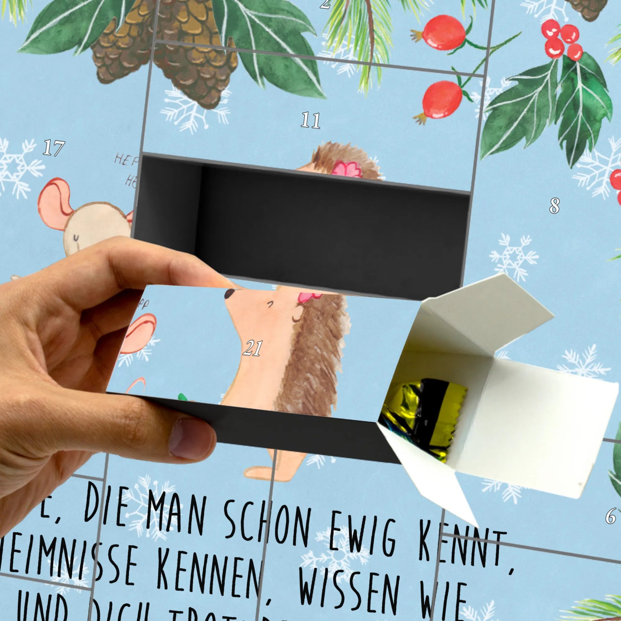 Das charmante Design mit dem putzigen Igelpaar, das fröhlich seilspringt, und der süßen Maus wird sicherlich jedem ein Lächeln ins Gesicht zaubern. Ob für Kinder oder im Kindergarten, dieser Adventskalender ist ideal geeignet, um die Vorweihnachtszeit zu einem besonderen Erlebnis zu machen. Er eignet sich hervorragend als Geschenk zu Nikolaus oder als tolle Mitbringsel zu Kindergeburtstagen.