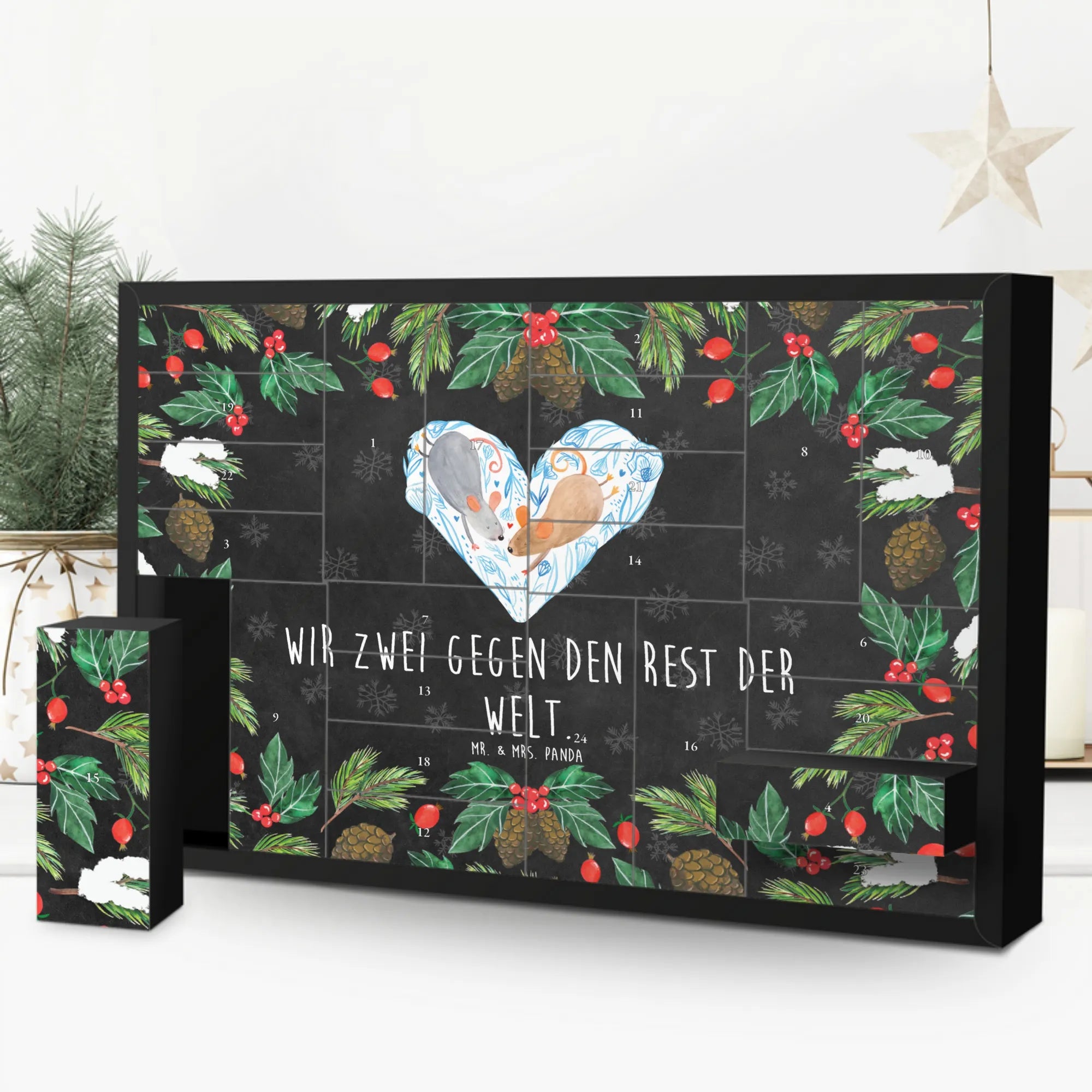 Der befüllbare Adventskalender "Mäuse Herz" von Mr. & Mrs. Panda ist die perfekte Geschenkidee für alle, die ihre Liebe zum Ausdruck bringen möchten. Dieses wunderschöne Exemplar ist nicht nur ein Adventskalender, sondern auch ein Liebesgeständnis, das direkt vom Herzen kommt! Mit dem liebevoll gestalteten Motiv von zwei niedlichen Mäusen, die sich zu einem Herz formen, verkörpert er das Motto "Wir zwei gegen den Rest der Welt." Die einzigartigen Aquarellfarben verleihen dem Kalender einen romantischen und einladenden Charme, während die zarten floralen Elemente im Hintergrund eine warme Atmosphäre schaffen.