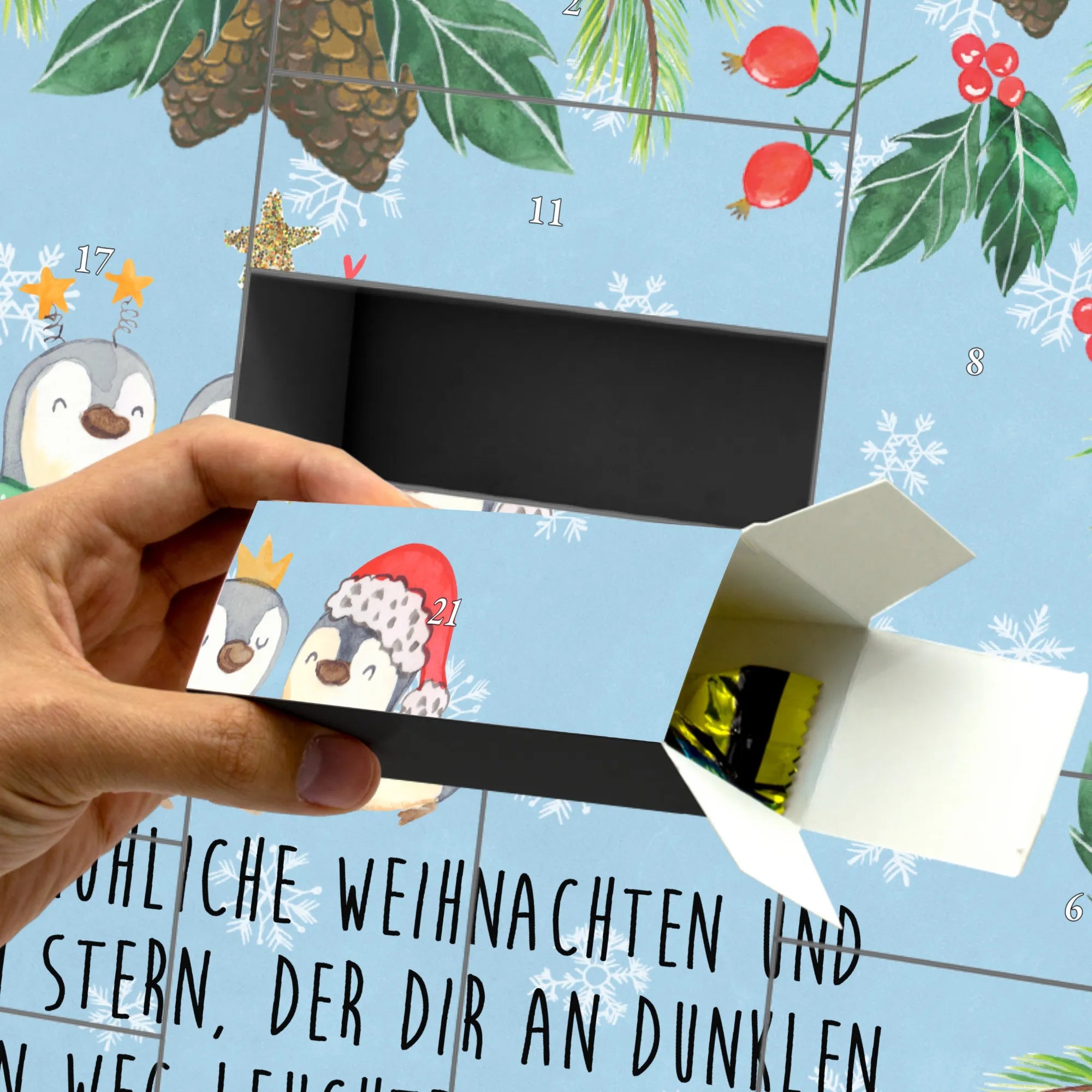 Die Frontseite des Kalenders ziert eine zauberhafte Zeichnung von Mrs. Panda, die drei süße Pinguine im königlichen Gewand zeigt. Dies ist nicht nur eine wunderschöne Dekoration für dein Zuhause, sondern auch eine besinnliche Möglichkeit, die Vorfreude auf Weihnachten zu steigern. Jeder Tag im Dezember wird zu einem kleinen Fest, wenn man die Schachteln öffnet und entdeckt, was sich darin verbirgt.