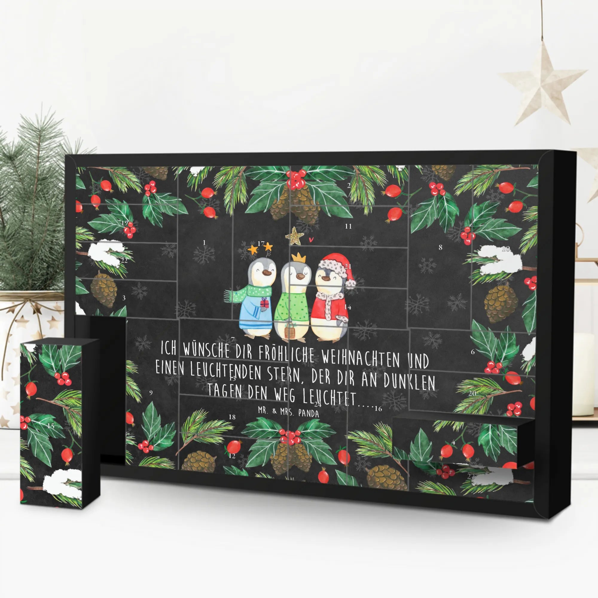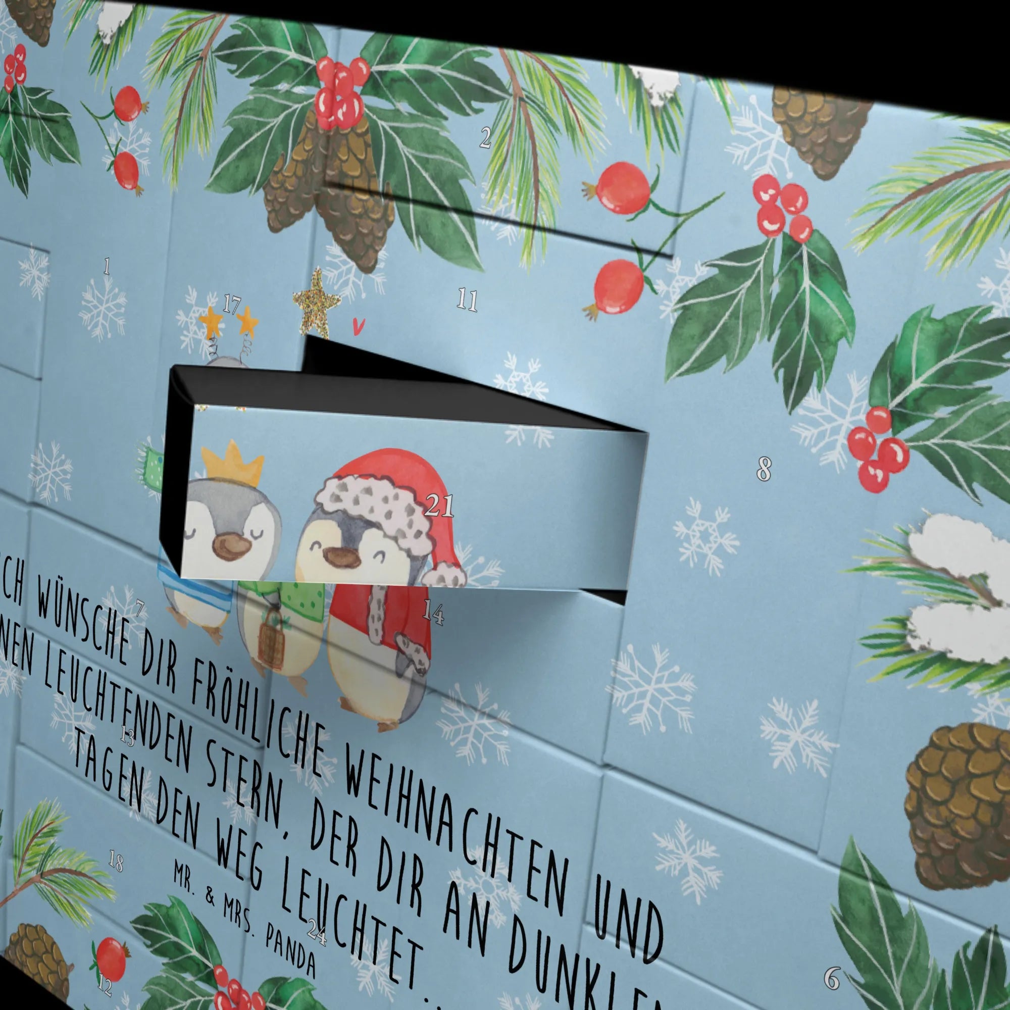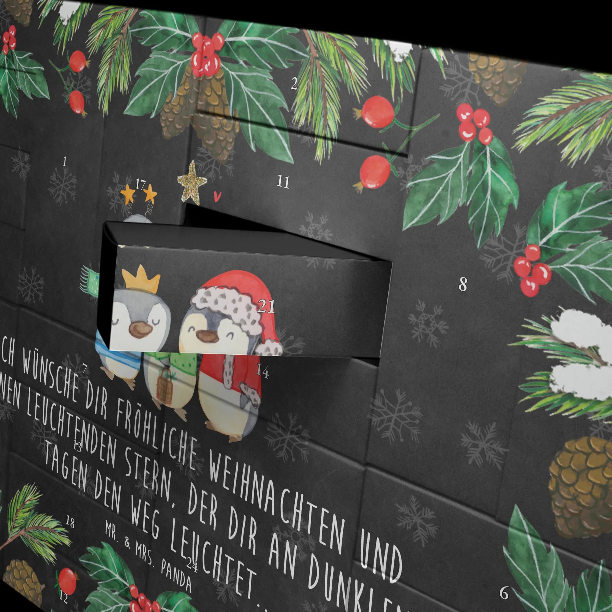 Und der besondere Hinweis: er wird ohne Füllung geliefert. So kannst du den Adventskalender ganz nach deinem individuellen Geschmack gestalten und ihn kreativ füllen. Lass die Vorfreude auf Heiligabend beginnen und genieße die kuschelige Winterzeit mit den einzigartigen Designs der Winter Kollektion von Mr. & Mrs. Panda.