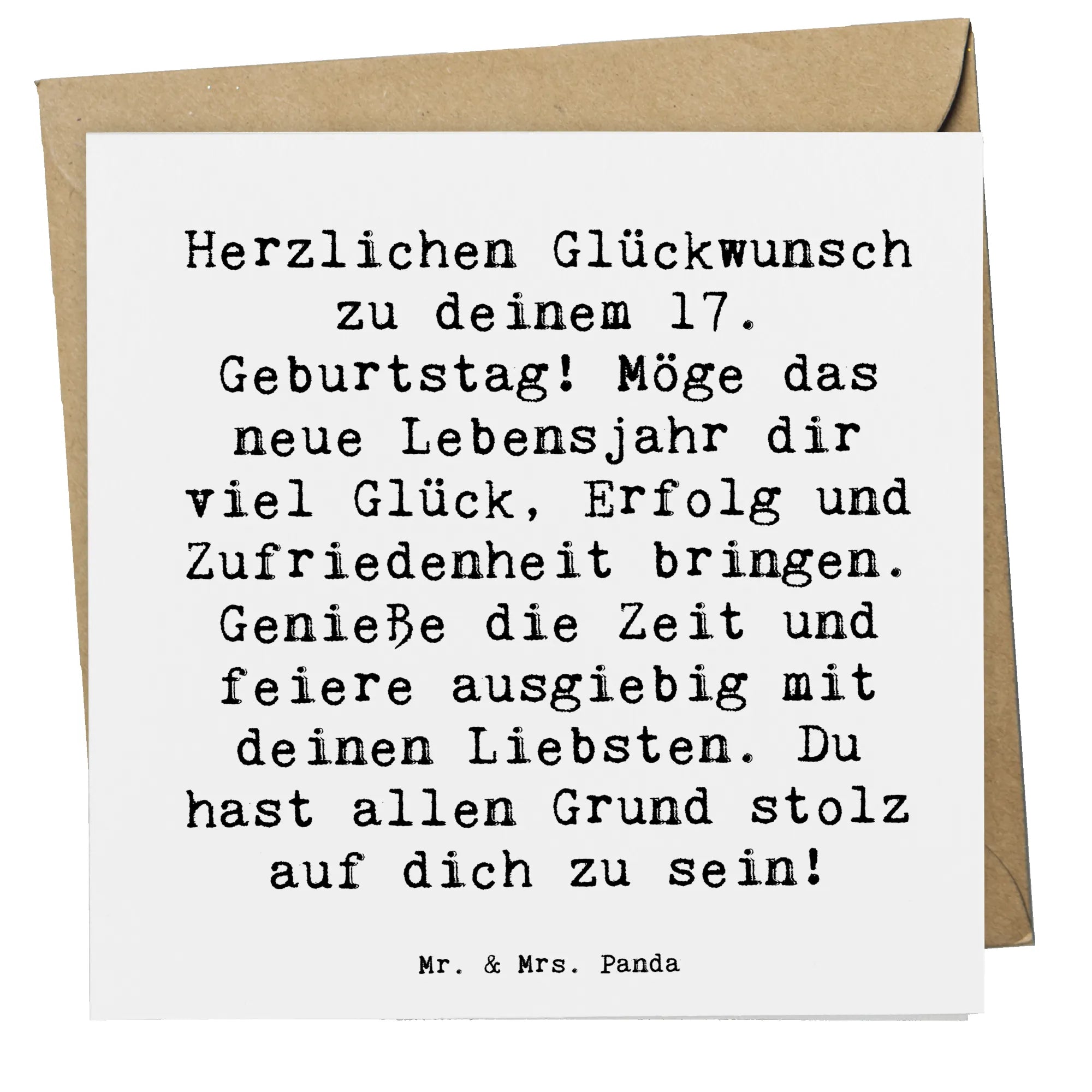 Die Deluxe Karte zum 17. Geburtstag von Mr. & Mrs. Panda ist das perfekte Geschenk für junge Erwachsene, die ihren Geburtstag gebührend feiern möchten. Mit einem liebevollen Spruch "Herzlichen Glückwunsch zu deinem 17. Geburtstag! Möge das neue Lebensjahr dir viel Glück, Erfolg und Zufriedenheit bringen. Genieße die Zeit und feiere ausgiebig mit deinen Liebsten. Du hast allen Grund stolz auf dich zu sein!" ist sie ideal für die Einladung zu einer Party oder als Glückwunschkarte.