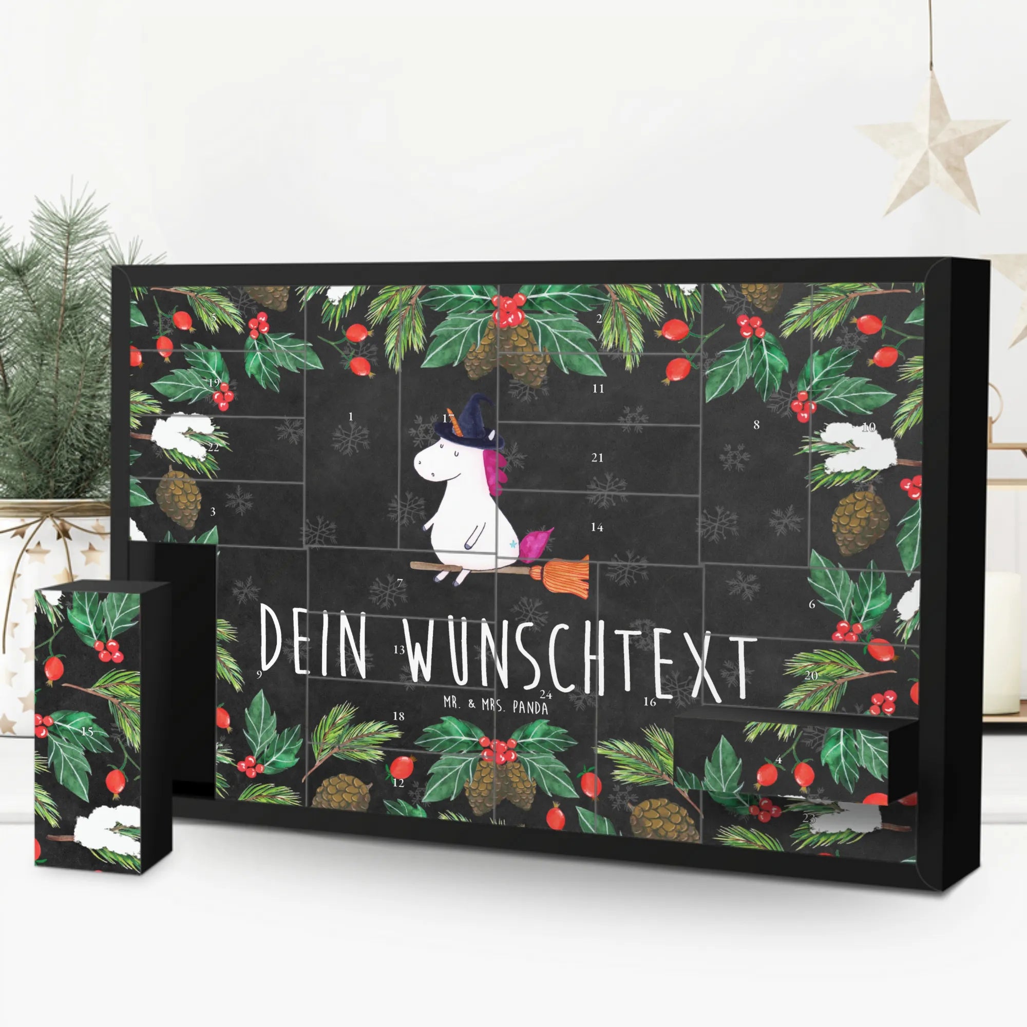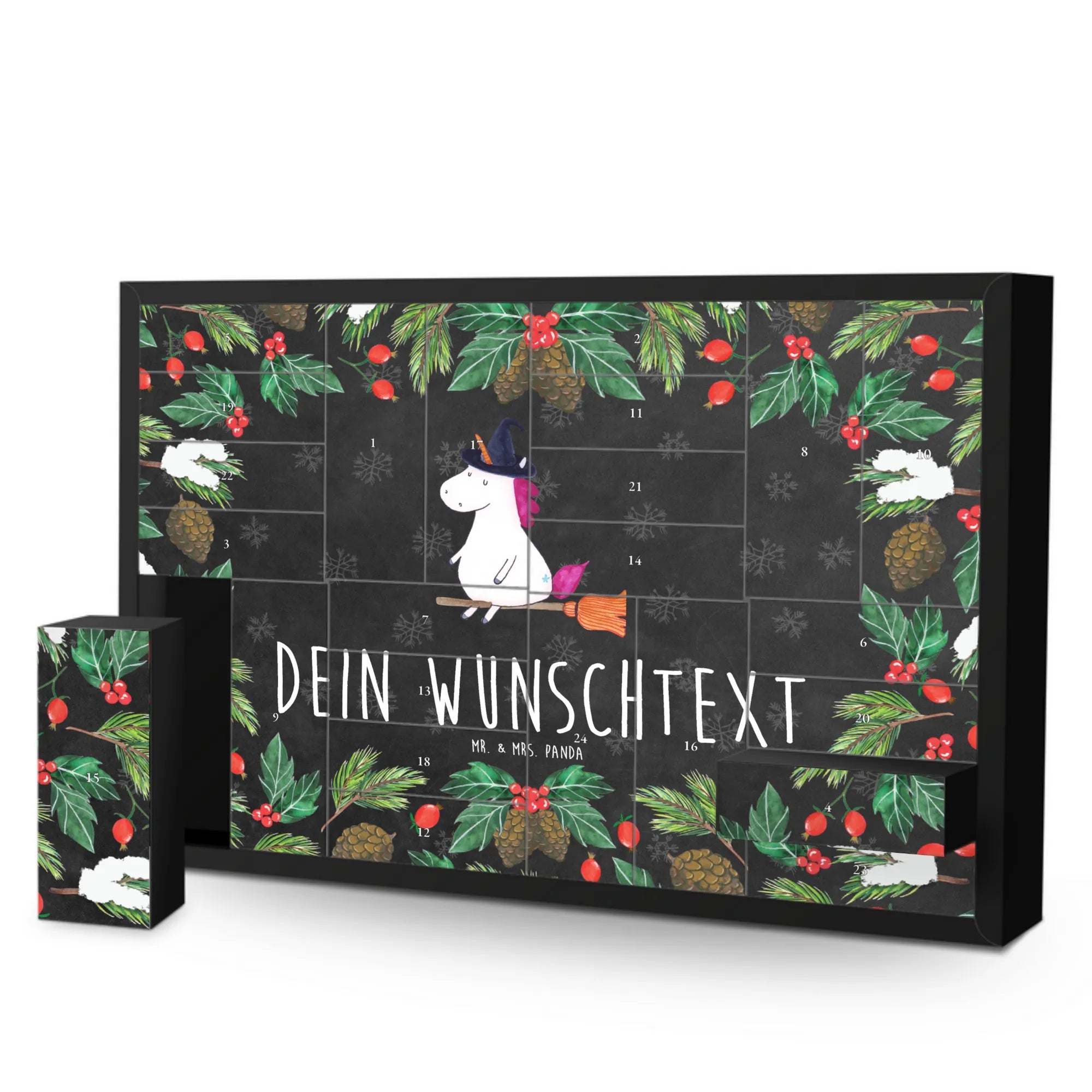 Der personalisierte befüllbare Adventskalender Einhorn Hexe von Mr. & Mrs. Panda ist das perfekte Geschenk für alle, die das Besondere lieben. Du bist auf der Suche nach einem einzigartigen Adventskalender, der nicht nur dekorativ ist, sondern auch eine ganz persönliche Note hat?