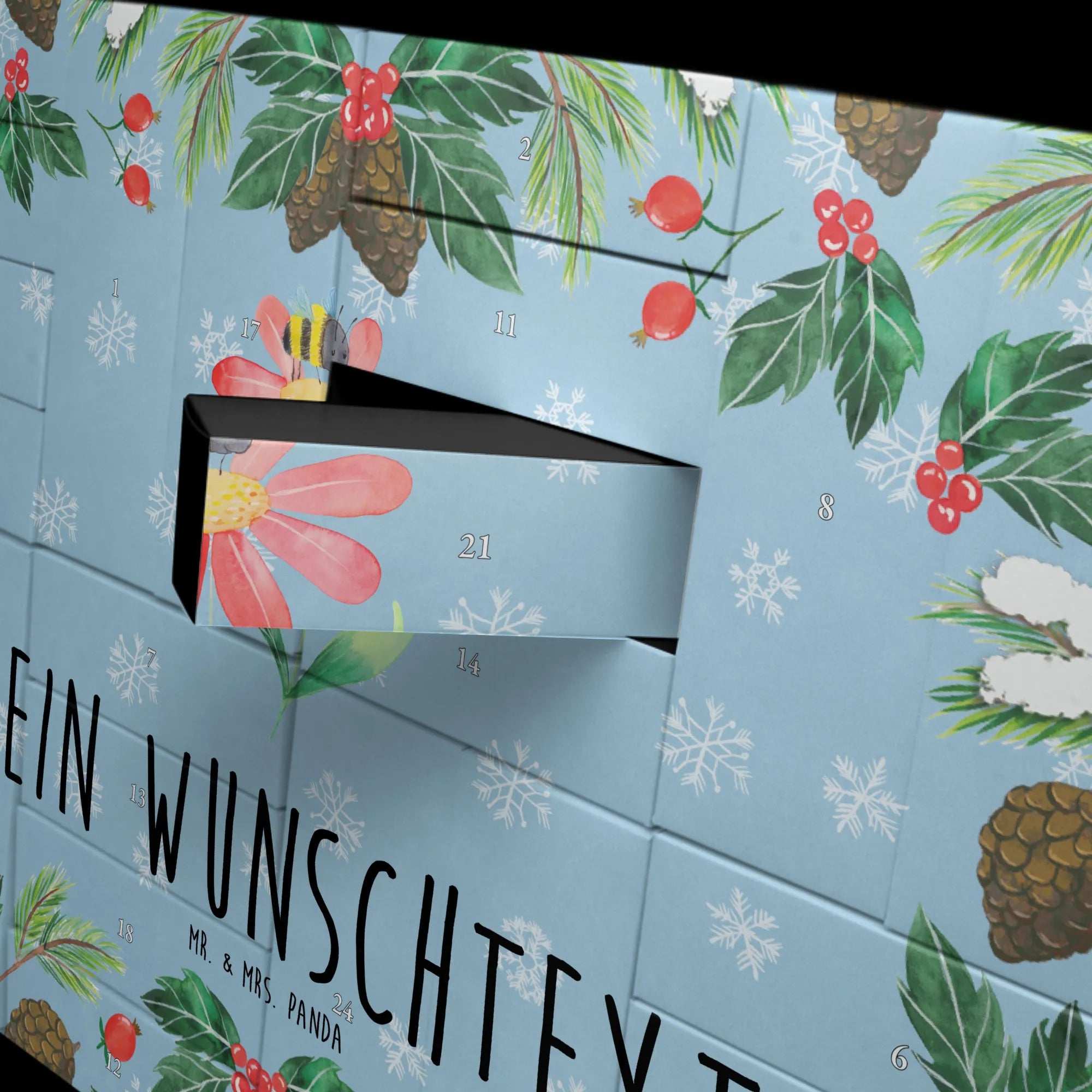 Der personalisierte befüllbare Adventskalender mit dem zauberhaften Motiv "Hummel Blume" aus der Small World Kollektion von Mr. & Mrs. Panda ist das perfekte Geschenk für alle, die Freude und gute Laune in der Adventszeit lieben!