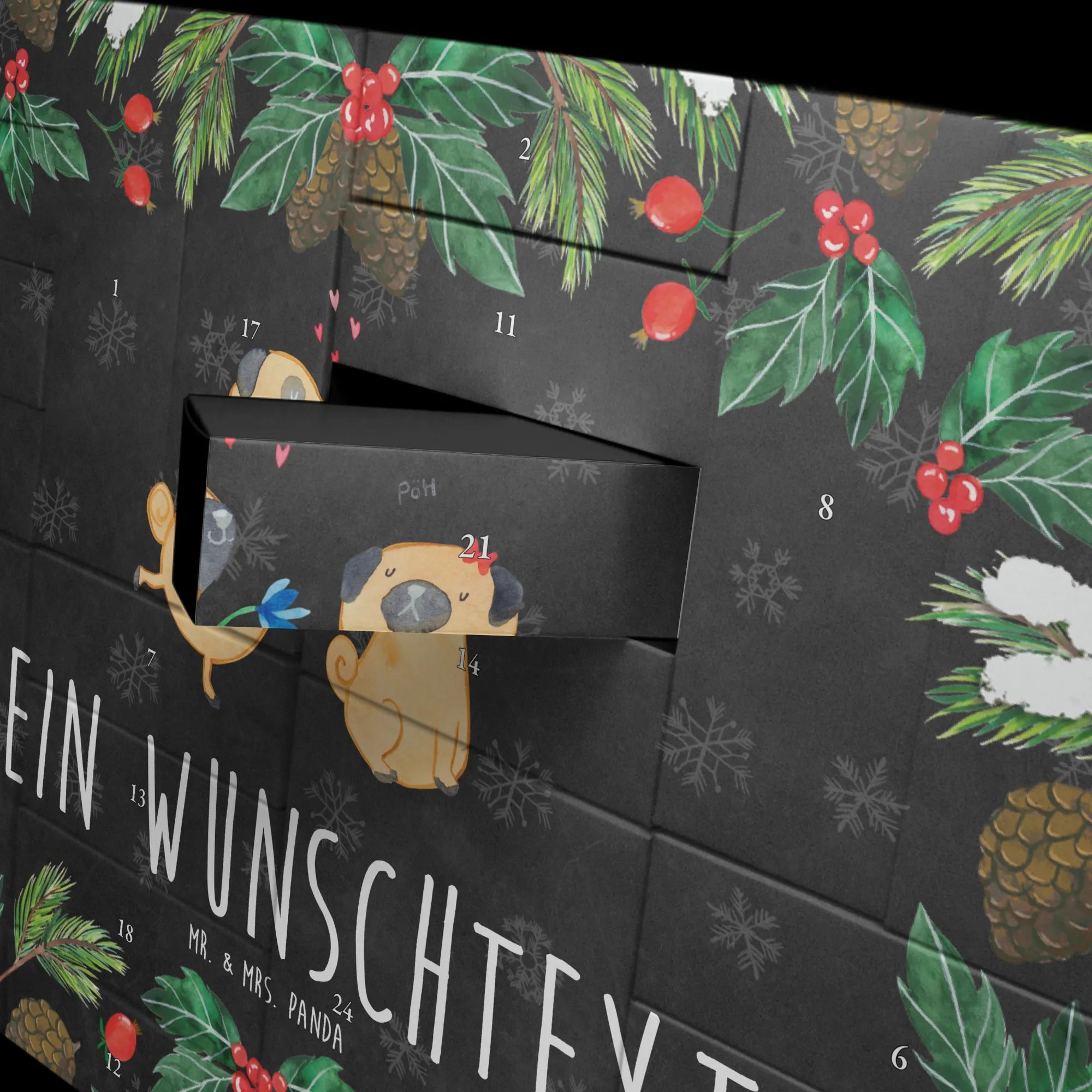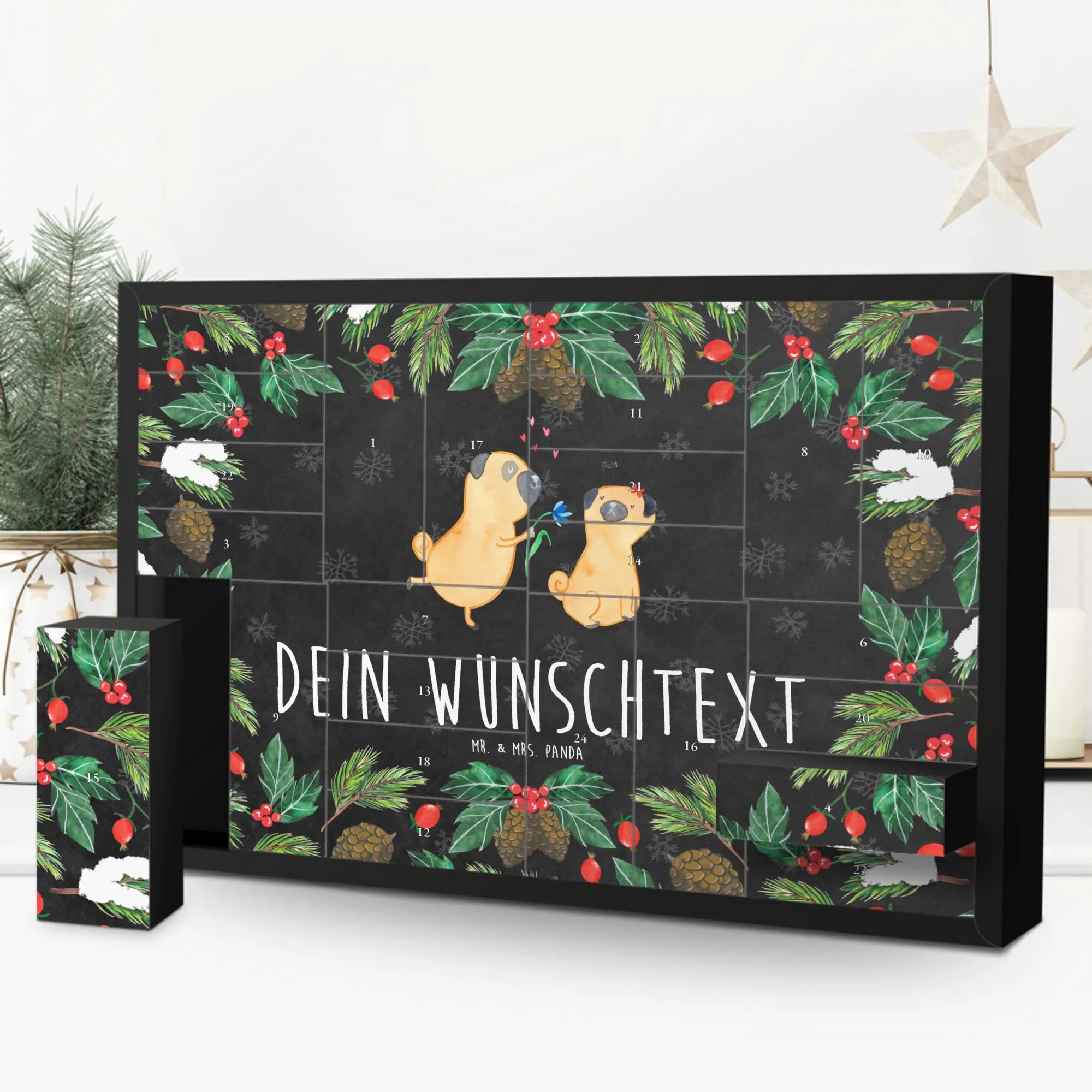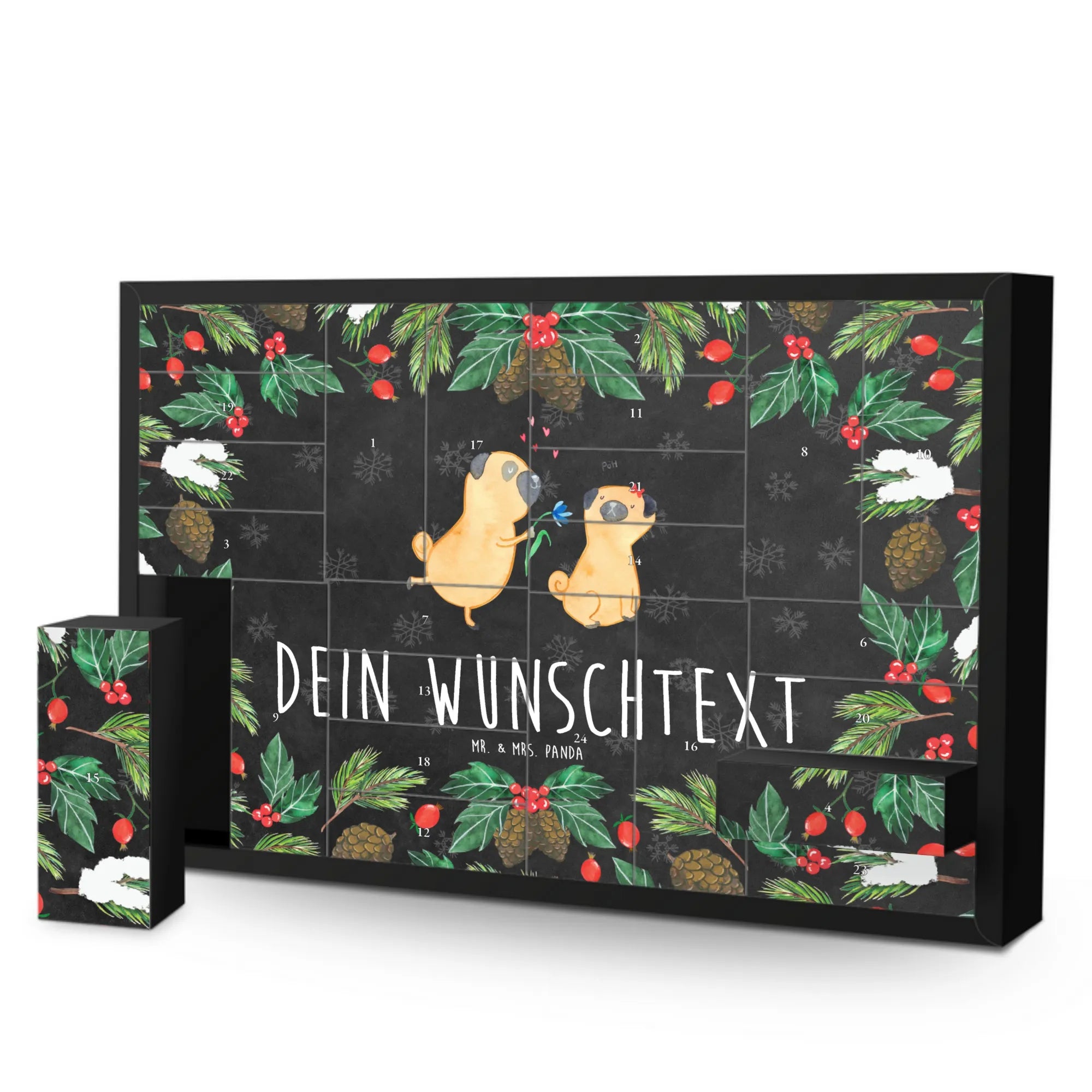 Der personalisierte befüllbare Adventskalender "Mops verliebt" von Mr. & Mrs. Panda ist das perfekte Geschenk für jeden Hundeliebhaber und besonders für Hundebesitzer, die ihre Tierliebe auf besondere Weise zum Ausdruck bringen möchten.