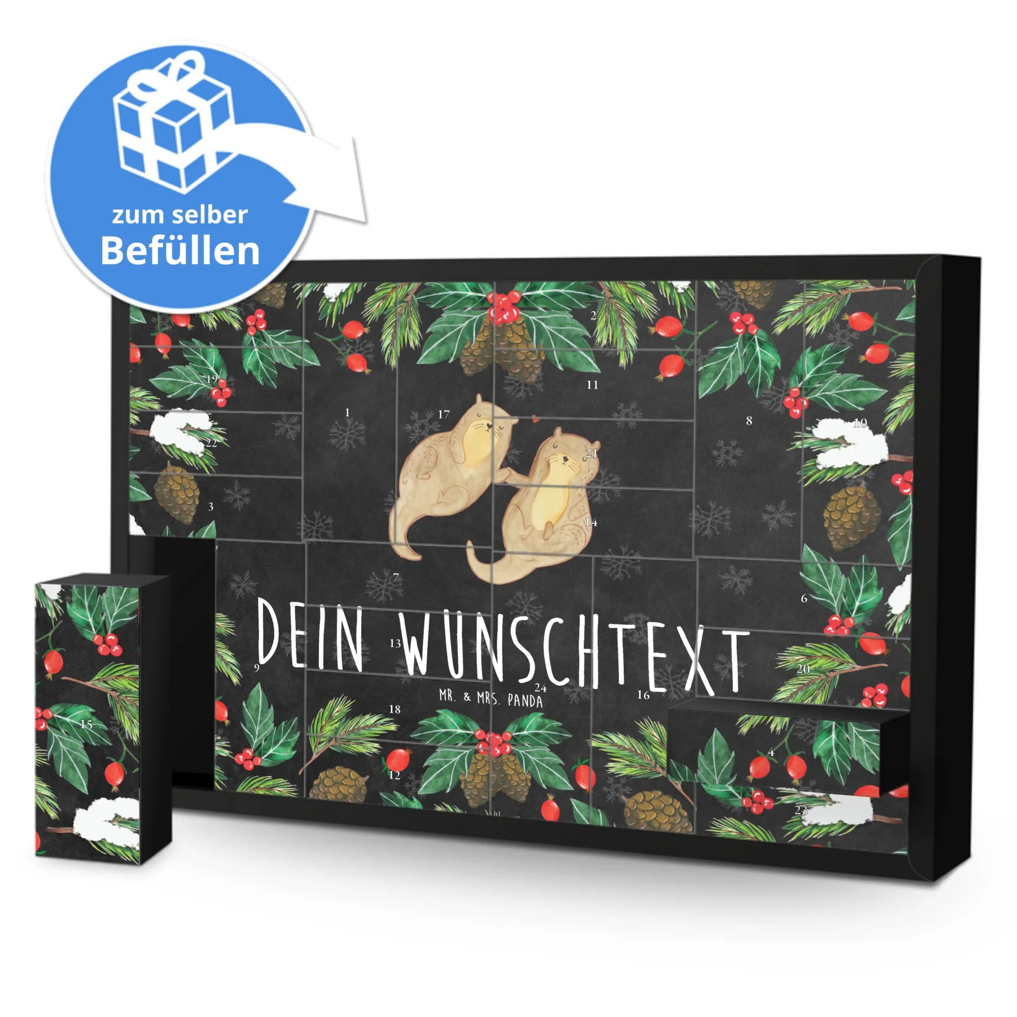 Der personalisierte, befüllbare Adventskalender von Mr. & Mrs. Panda mit dem süßen Motiv "Otter händchenhaltend" ist das perfekte Geschenk für Otter-Fans und Tierliebhaber.