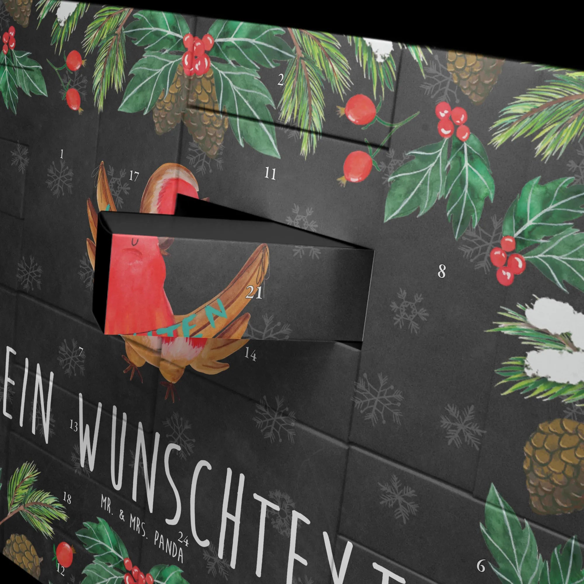 Mit diesem Adventskalender von Mr. & Mrs. Panda kannst du deine Liebsten mit 24 kleinen Überraschungen beglücken, die du selbst befüllst und so ganz persönlich gestaltest. 🎁 Egal ob für den Partner, die beste Freundin oder die Kinder, dieser Adventskalender bringt jeden Tag ein neues Lächeln und passt perfekt in jede Weihnachtsdeko. Das süße Rotkehlchen ziert den Kalender und bringt die fröhliche Botschaft 'Fröhliche Weihnachten' direkt in dein Zuhause.