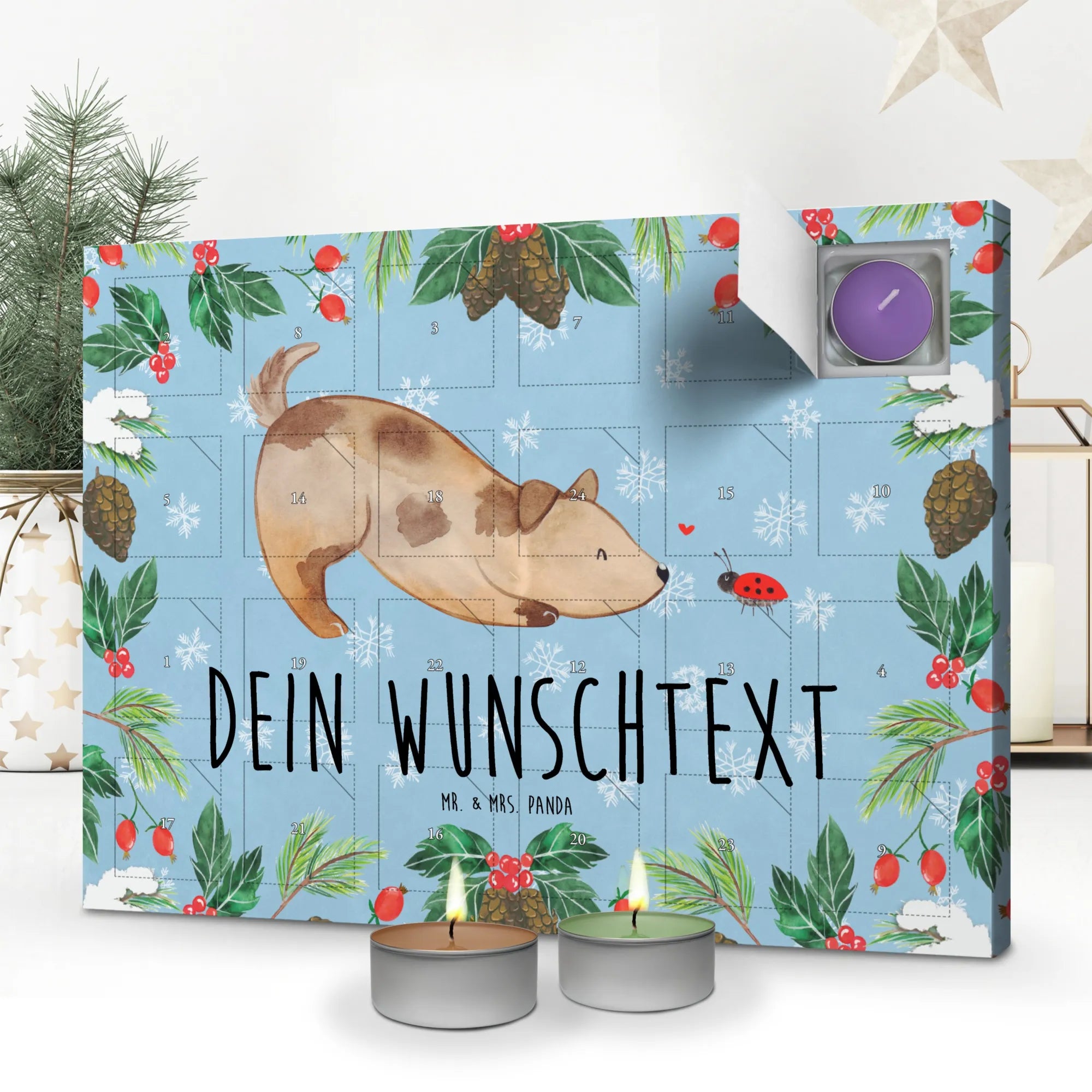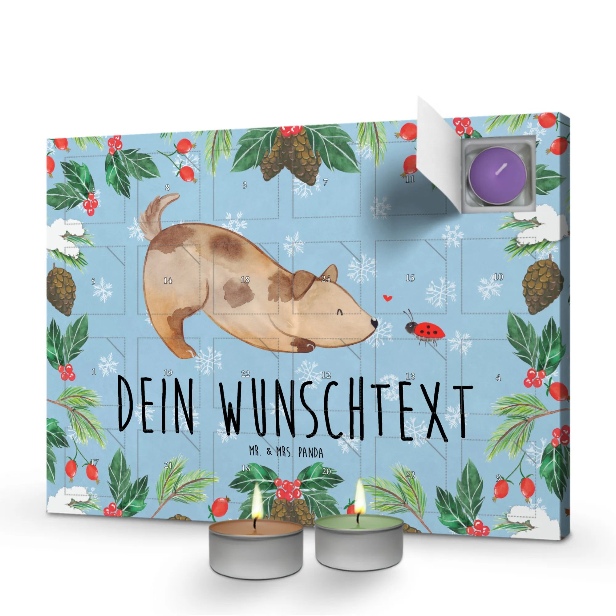 Der personalisierte Duftkerzen Adventskalender von Mr. & Mrs. Panda ist das perfekte Geschenk für alle Tierliebhaber und Hundebesitzer. Mit seinem bezaubernden Hund Marienkäfer-Motiv und der Möglichkeit, einen Wunschtext oder Namen hinzuzufügen, wird dieser Adventskalender zum Highlight der Adventszeit.