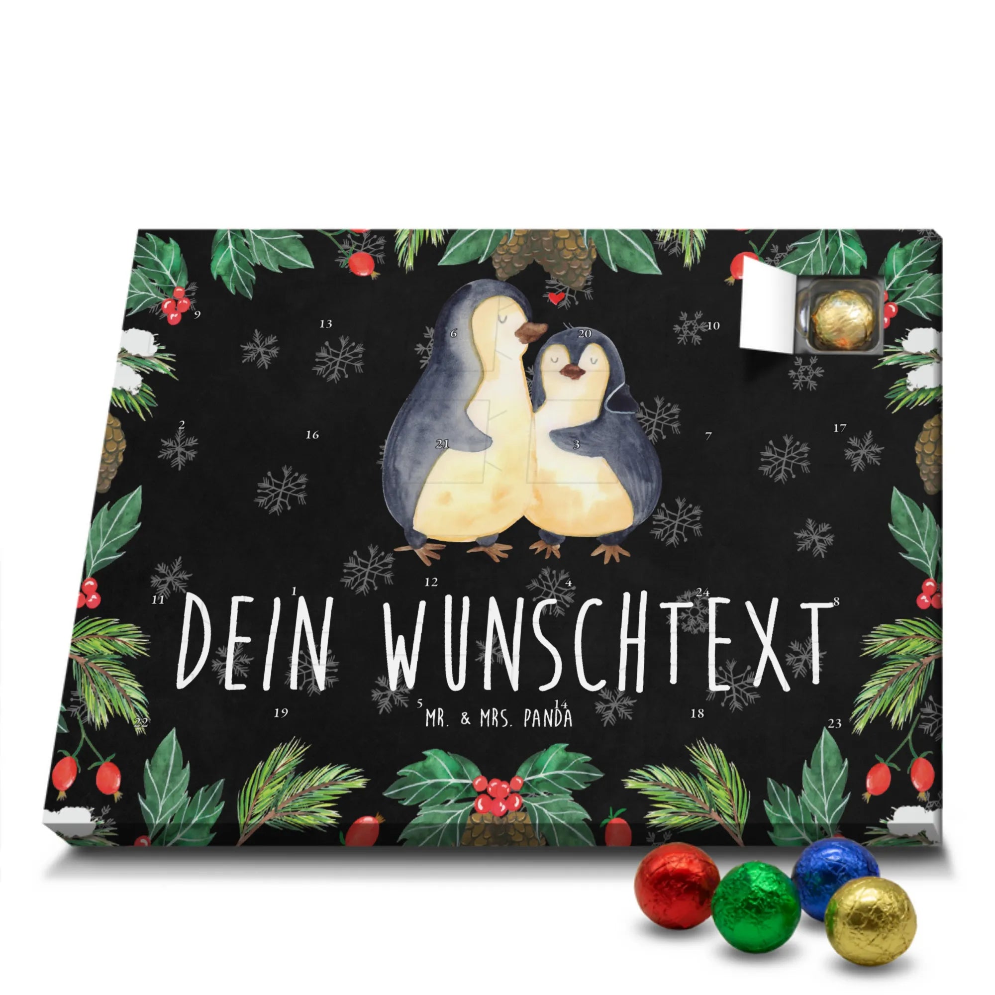 Verschenke Liebe in 24 kleinen Momenten: Unser personalisierter Schoko Adventskalender „Pinguin umarmend“ aus der Pinguin - Kollektion von Mr. & Mrs. Panda ist das perfekte Liebesgeschenk für Paare, Verliebte und alle, die Nähe schätzen. Auf dem liebevollen Motiv umarmt ein Pinguin seinen Partner – ein Symbol für Geborgenheit, Zuneigung und Zusammenhalt. Der eingedruckte Spruch „Tage mit dir sind meine absoluten Lieblingstage.“ macht jeden Adventstag zu einem kleinen Fest der Gefühle. 🎁