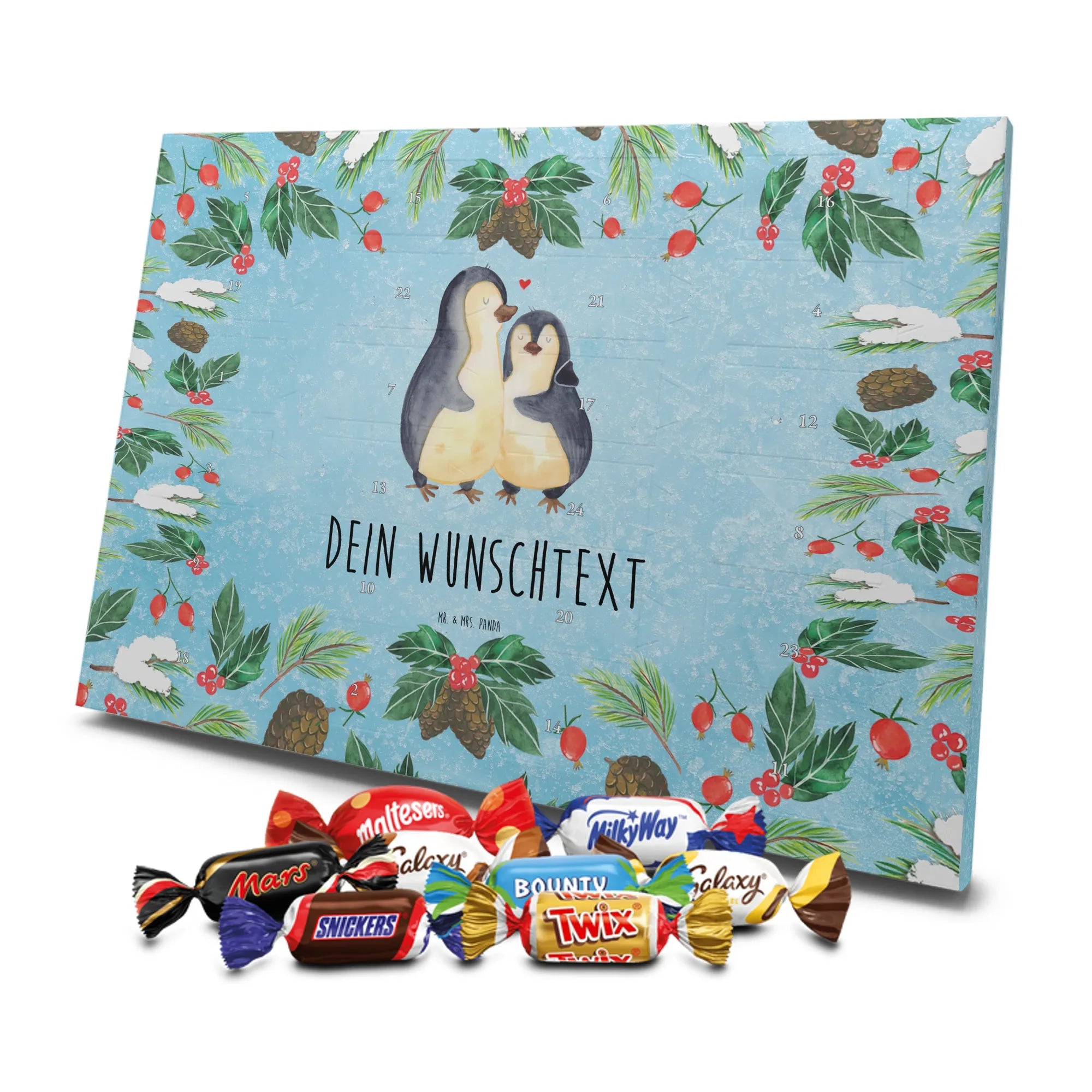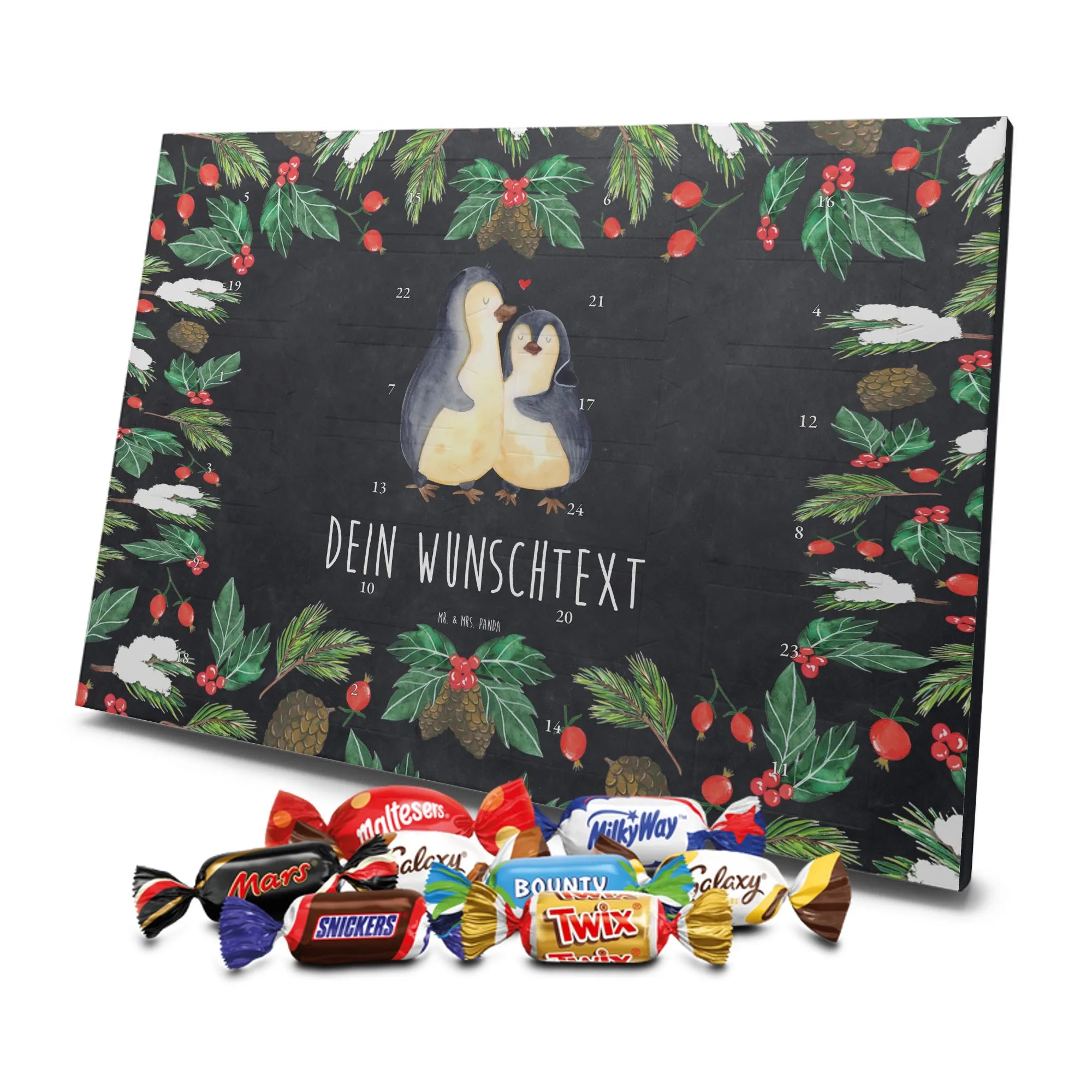 Personalisierter Schoko-Adventskalender von Mr. & Mrs. Panda – liebevoll gestaltet und ideal als individuelles Geschenk in der Adventszeit. Wir bedrucken den Kalender mit zauberhaften Motiven & herzlichen Sprüchen und personalisieren ihn mit deinem Wunschnamen oder Wunschtext. Die hochwertige Druckqualität kombiniert mit einer seidenmatten Oberflächenveredelung sorgt für ein edles Erscheinungsbild, und die bedruckten Seitenflächen geben dem Motiv zusätzlichen Charme. Der Kalender kann aufgehängt oder aufgestellt werden, sodass du ihn flexibel platzieren kannst. Gefüllt ist der Kalender mit Celebrations, die 24 hochwertige Überraschungen in 8 verschiedenen Sorten beinhalten: Maltesers, Mars, Snickers, Twix, Milky Way, Bounty, Galaxy und Galaxy Caramel. Maße: 325 mm x 225 mm x 27 mm – handlich und doch großzügig für die kleinen Leckereien hinter den Türchen. Ob für Kinder, Partner oder beste Freunde: dieser personalisierte Schoko-Adventskalender macht das Warten auf Weihnachten bunter und leckerer. Verschenke eine persönliche Erinnerung und jeden Tag ein kleines Schokoladen-Glück!