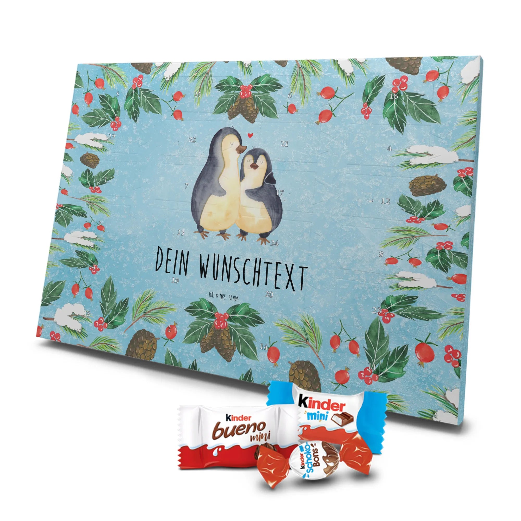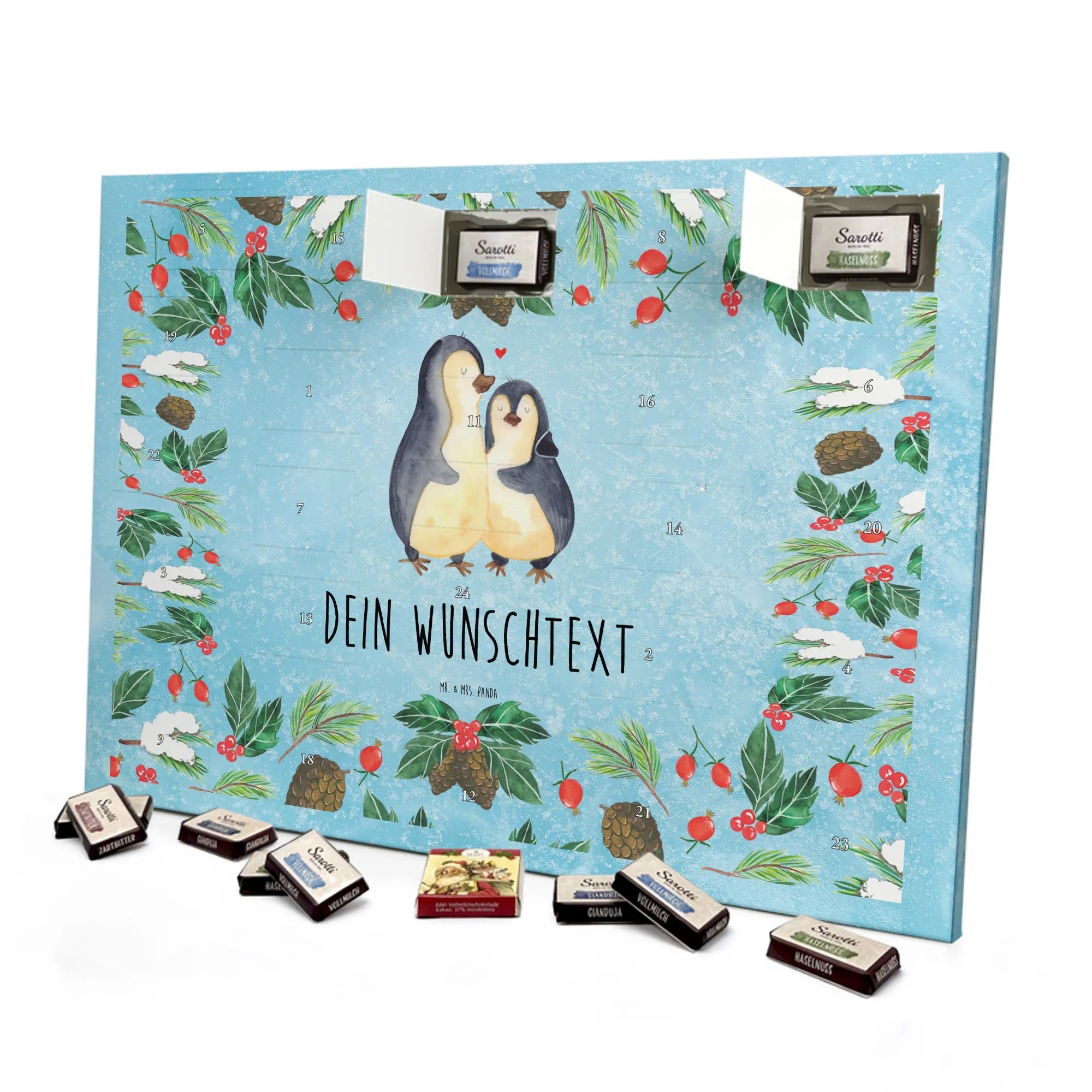Schenke Vorfreude, Nähe und süße Momente – mit dem personalisierten Schoko Adventskalender „Pinguin umarmend“ von Mr. & Mrs. Panda. Ein Adventskalender mit Namen, der von Herzen kommt.