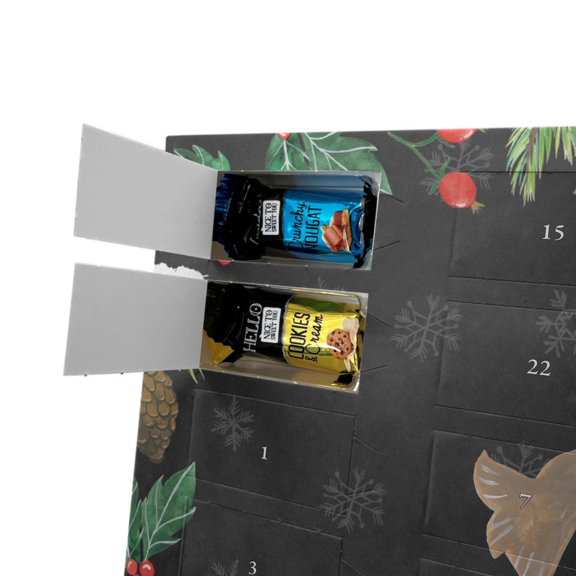 Unser Personalisierter Schoko-Adventskalender von Mr. & Mrs. Panda bringt Freude ins Adventsfenster und zaubert jedem ein Lächeln aufs Gesicht. Du gestaltest ihn ganz individuell: wähle deinen Wunschtext oder Namen und wir drucken ihn auf den Kalender – inklusive bedruckter Seitenflächen für ein rundum schönes Ergebnis. Die seidenmatte Oberflächenveredelung sorgt für eine elegante Haptik, während die brillante Druckqualität die Motive zum Strahlen bringt. Der Kalender ist flexibel einsetzbar, denn er kann aufgehängt oder einfach aufgestellt werden. Gefüllt mit Lindt Hello: 24 einzelne Schokoladen Mini Sticks in vier leckeren Geschmacksrichtungen (Karamell-Schokoladenkuchen, Kekse, Knuspriger Nougat, Erdbeer-Cheesecake). Zutaten und Allergene (Milcheiweiß, Milchzucker, Soja, Weizen, Haselnüsse; kann Mandeln und andere Schalenfrüchte enthalten) sind ausgewiesen. Ideal als persönliches Geschenk für Familienmitglieder, Freundinnen oder für dich selbst – mit viel Liebe gestaltet von Mr. & Mrs. Panda. Maße: 325 mm x 225 mm x 27 mm, praktische Größe für Regal oder Wand.