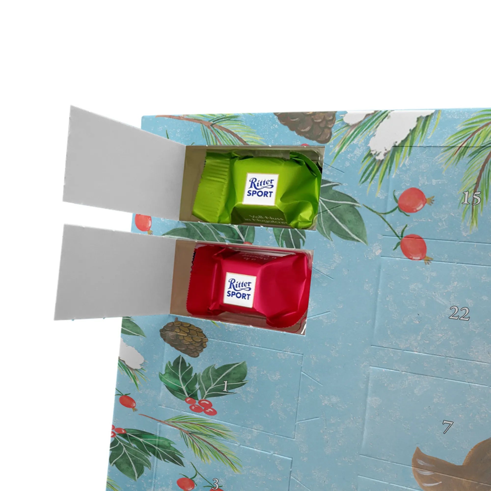 Wunderschöner, persönlicher Genuss für die Vorweihnachtszeit: unser Personalisierter Schoko Adventskalender von Mr. & Mrs. Panda ist das perfekte Geschenk für alle, die Schokolade und liebevolle Details lieben. Du kannst den Kalender mit deinem Wunschnamen oder einem kurzen Wunschtext personalisieren – so wird jeder Adventstag zu etwas ganz Besonderem. Der Karton ist liebevoll bedruckt mit den typischen, herzerwärmenden Motiven und Sprüchen von Mr. & Mrs. Panda und besticht durch brillante Druckqualität sowie eine seidenmatte Oberflächenveredelung, die edel wirkt und sich toll anfühlt. Auch die Seitenflächen sind bedruckt, sodass der Kalender von allen Seiten ein Hingucker ist. Praktisch: Du kannst den Kalender aufstellen oder an der Wand aufhängen – ganz wie es bei dir passt. Gefüllt ist der Kalender mit Ritter Sport Schokowürfeln in beliebten Geschmacksrichtungen: Mousse au Chocolat, Schoko Crisp, Voll-Nuss in Nougatcreme, Karamell Duo, Joghurt und Erdbeer-Joghurt. Maße: 325 mm x 225 mm x 27 mm. Ob für Partner, Kinder oder die beste Freundin – dieser personalisierte Adventskalender sorgt für tägliche Freude und süße Überraschungen in der Adventszeit.