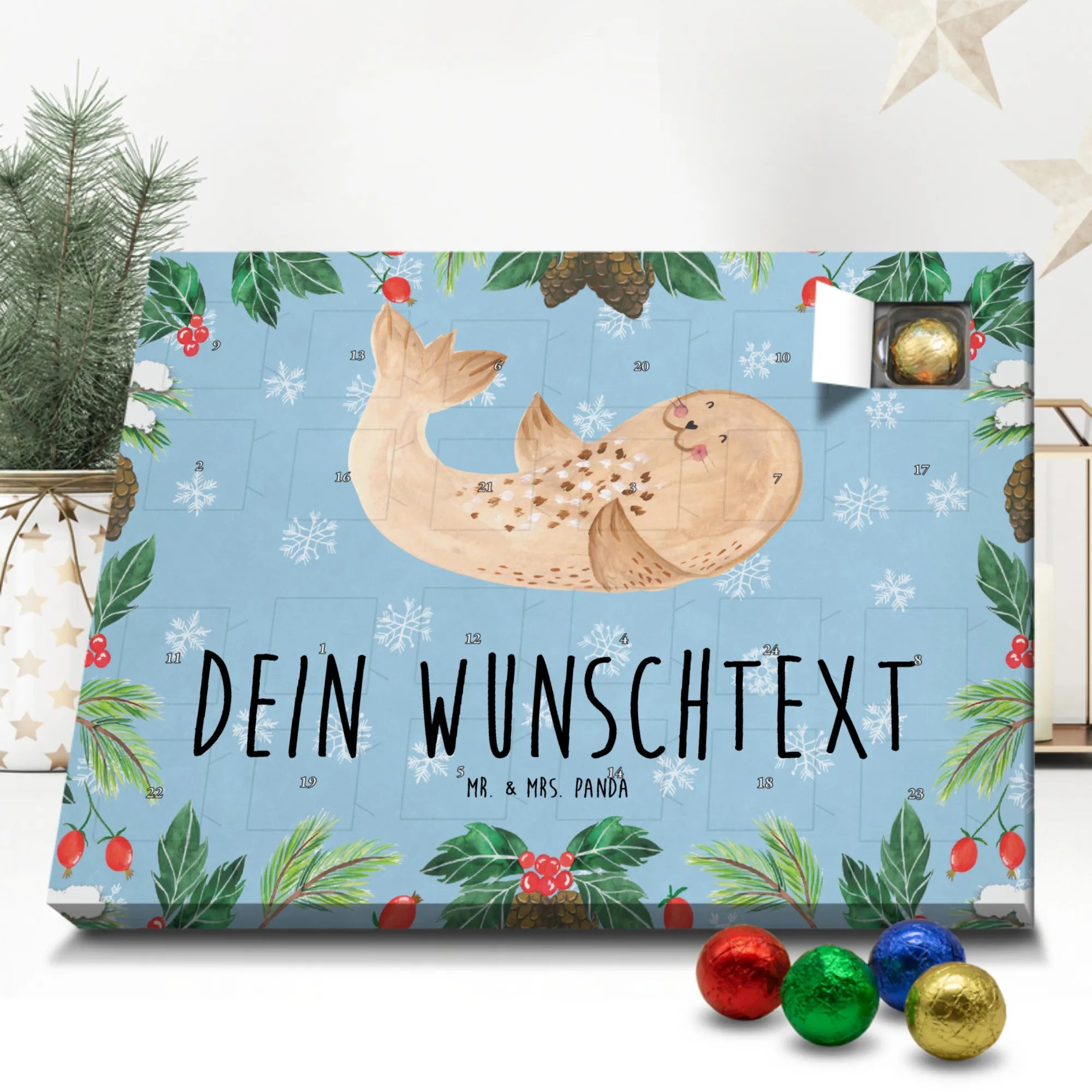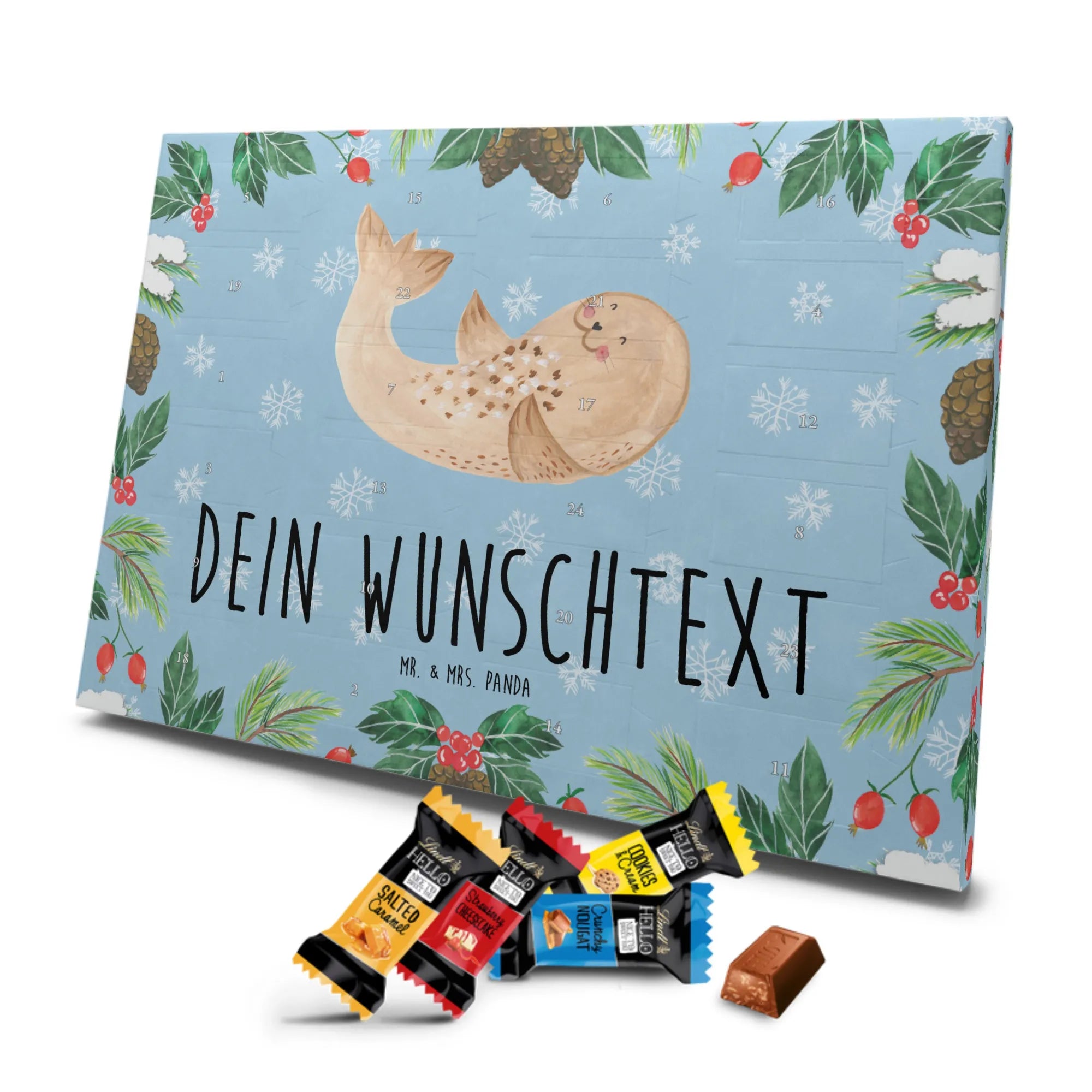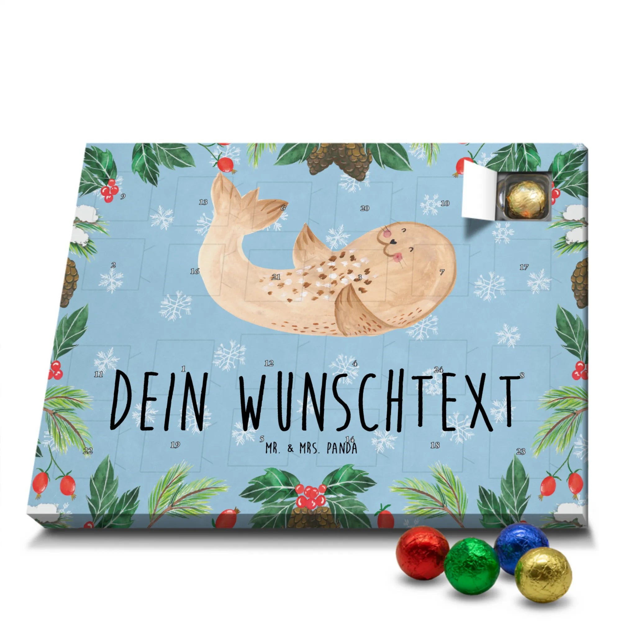 Mach es dir gemütlich mit unserem personalisierten Schoko Adventskalender „Robbe liegend“ aus der Small World Kollektion von Mr. & Mrs. Panda. Dieses fröhliche Motiv bringt Strand-Feeling, Gute Laune und ein Lächeln in deine Vorweihnachtszeit. Die liegende Robbe auf eisblauem Hintergrund erinnert an Spaziergänge an Nordsee und Ostsee und lädt dazu ein, den Alltag hinter sich zu lassen.