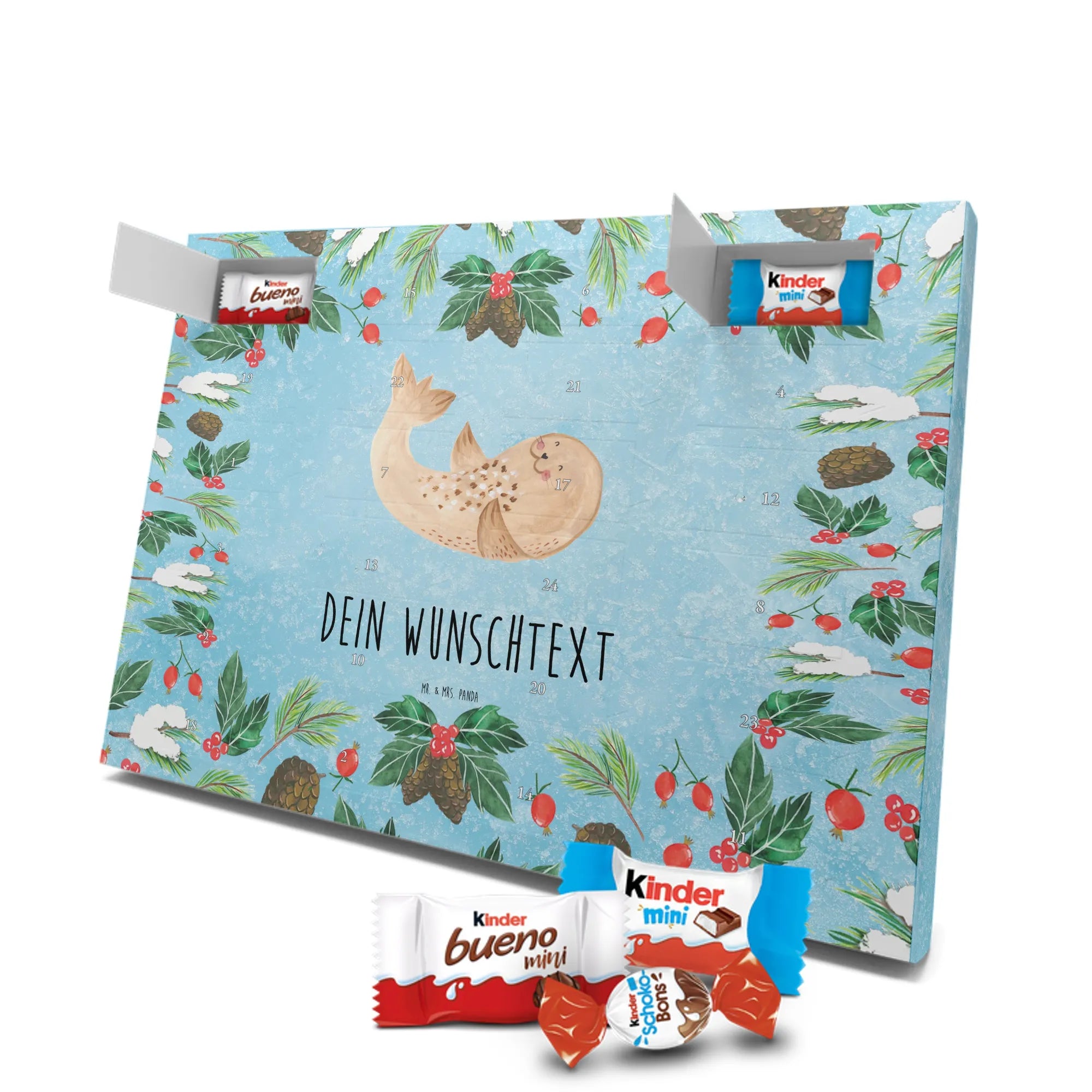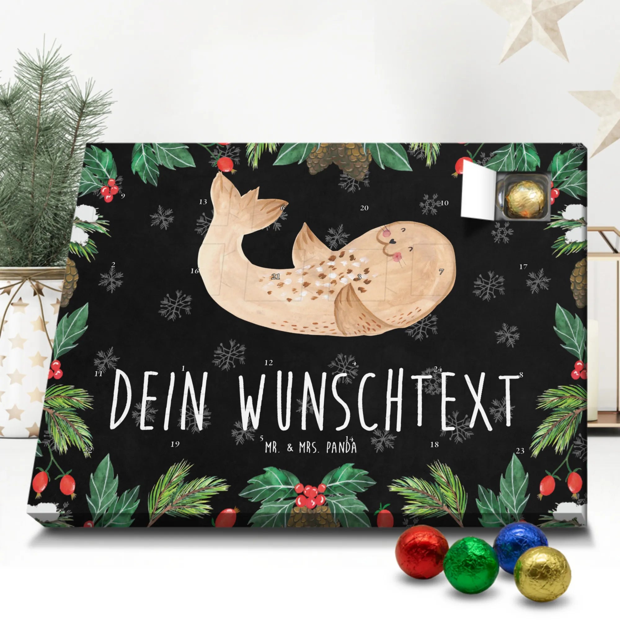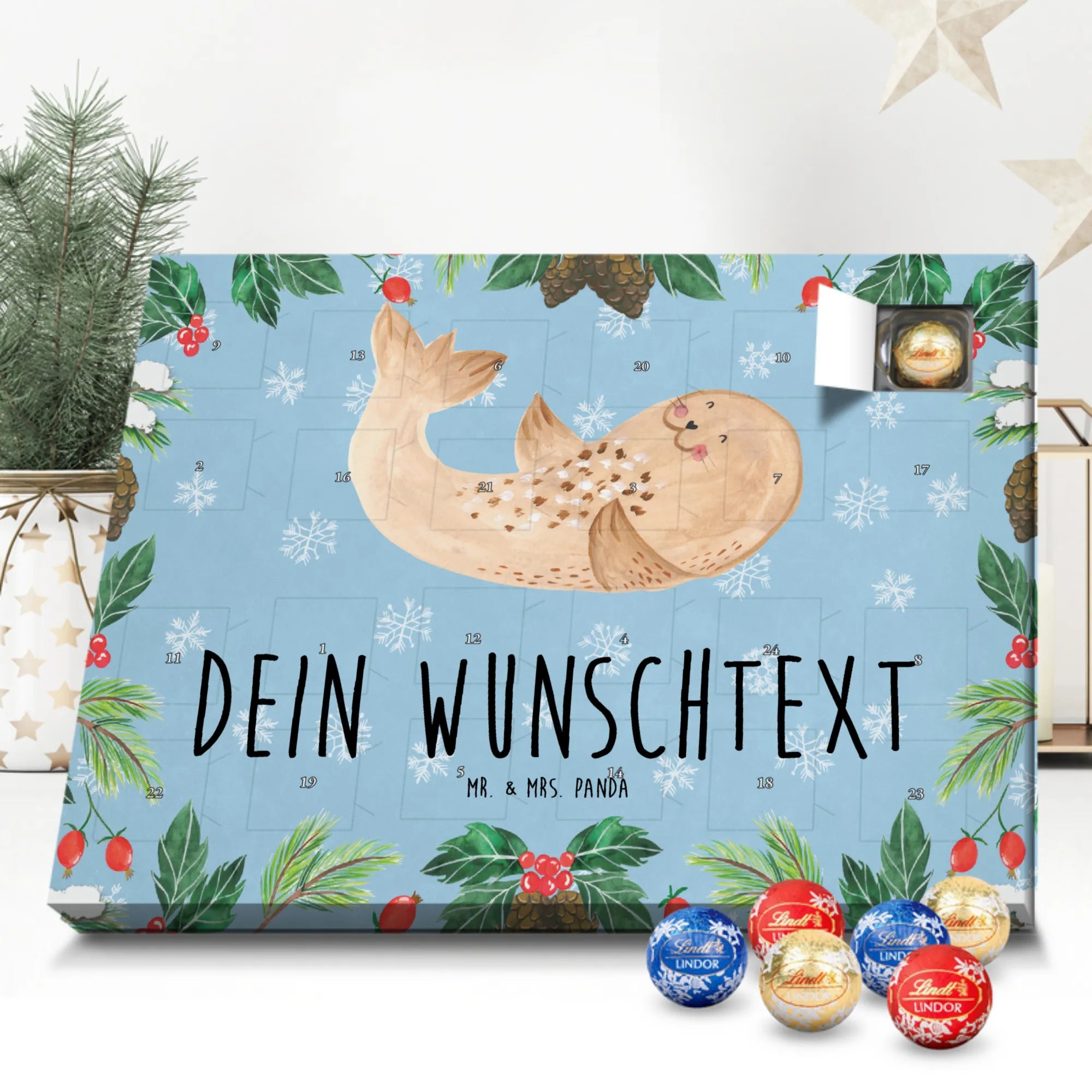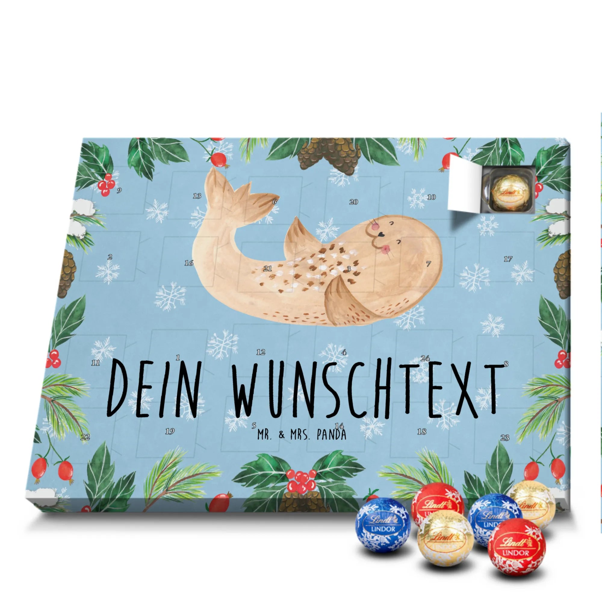 Mach es dir gemütlich mit unserem personalisierten Schoko Adventskalender „Robbe liegend“ aus der Small World Kollektion von Mr. & Mrs. Panda. Dieses fröhliche Motiv bringt Strand-Feeling, Gute Laune und ein Lächeln in deine Vorweihnachtszeit. Die liegende Robbe auf eisblauem Hintergrund erinnert an Spaziergänge an Nordsee und Ostsee und lädt dazu ein, den Alltag hinter sich zu lassen.