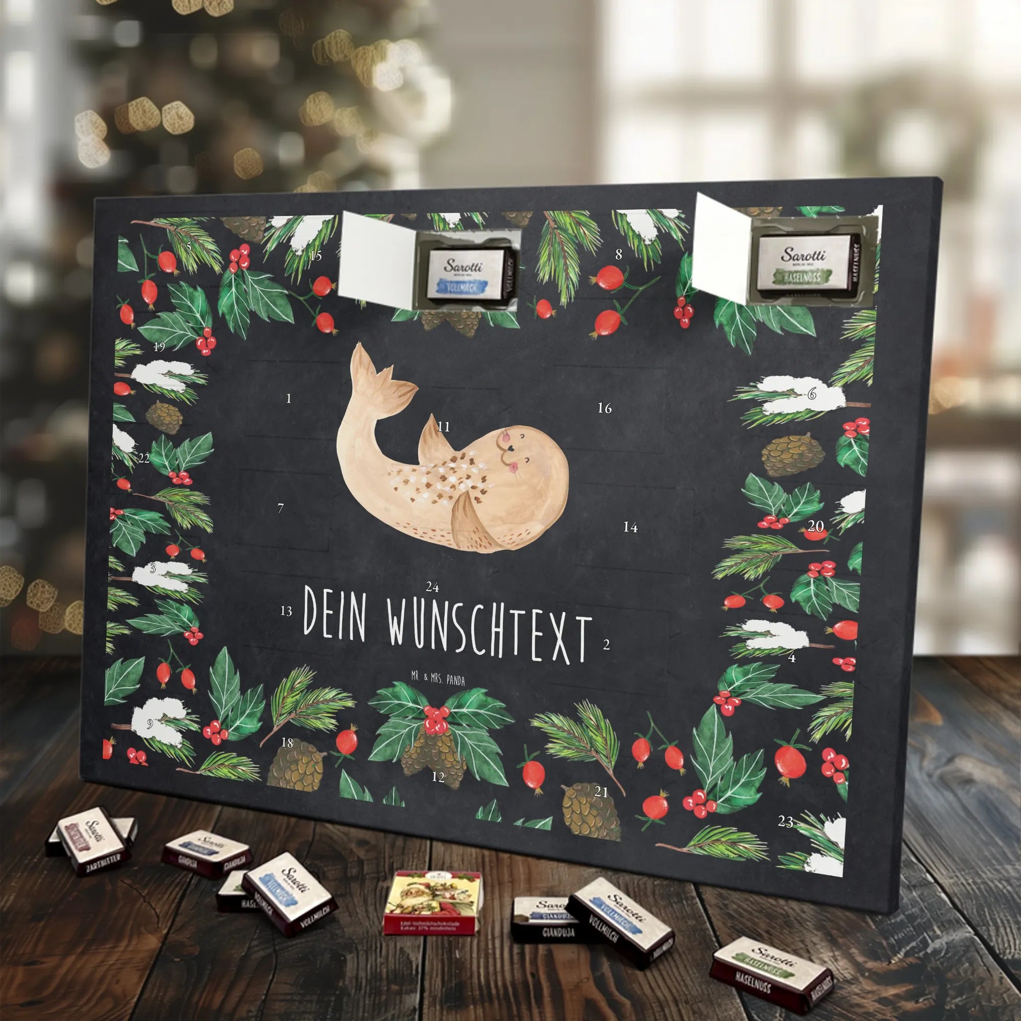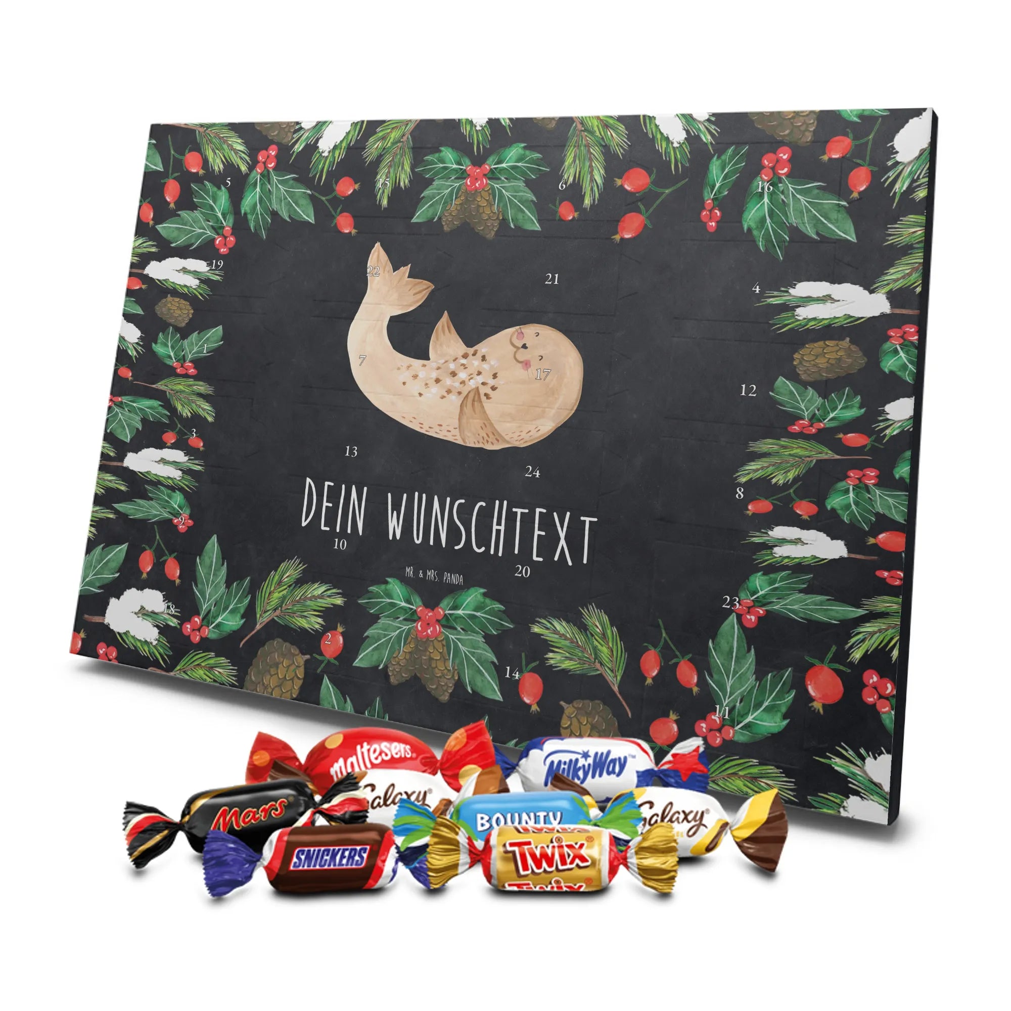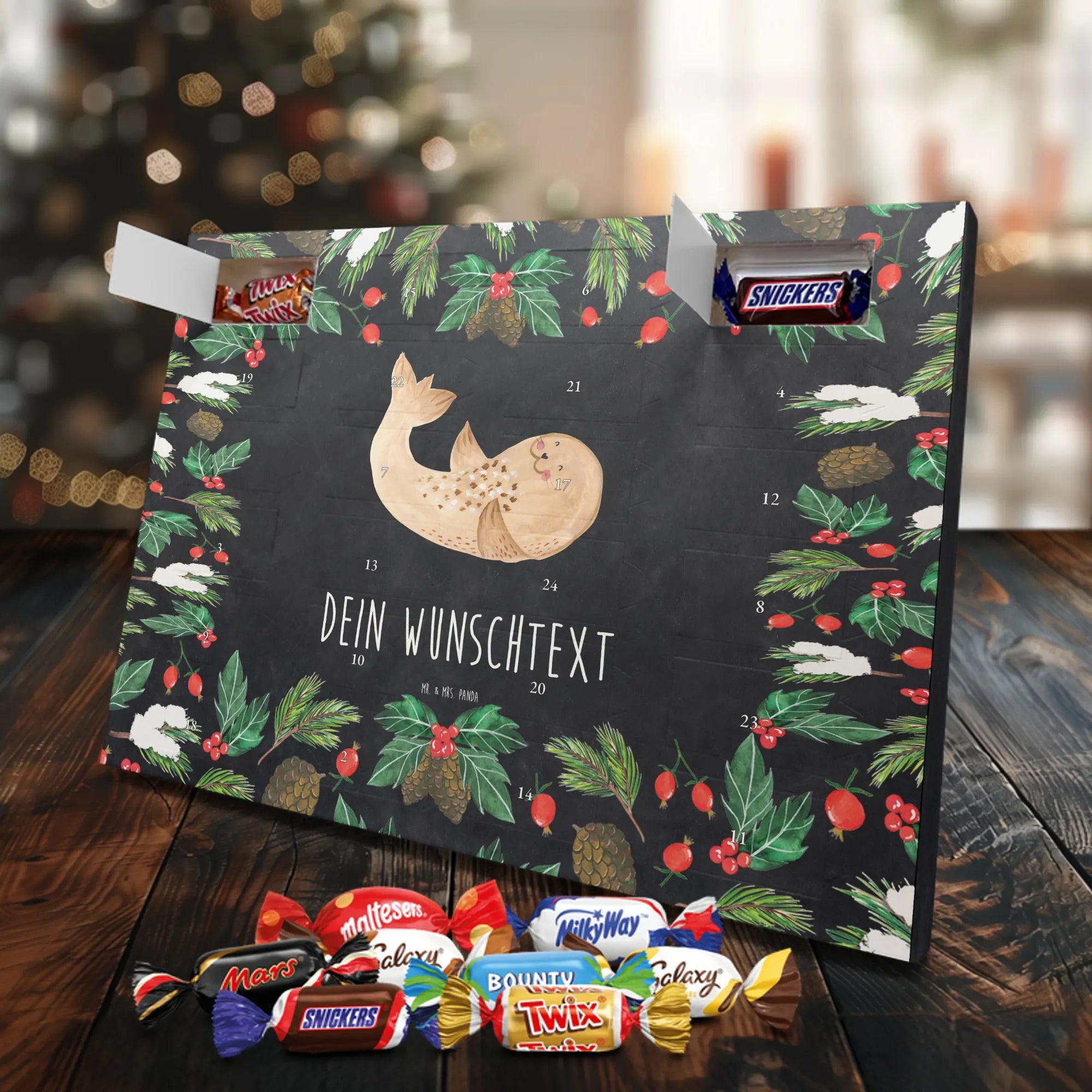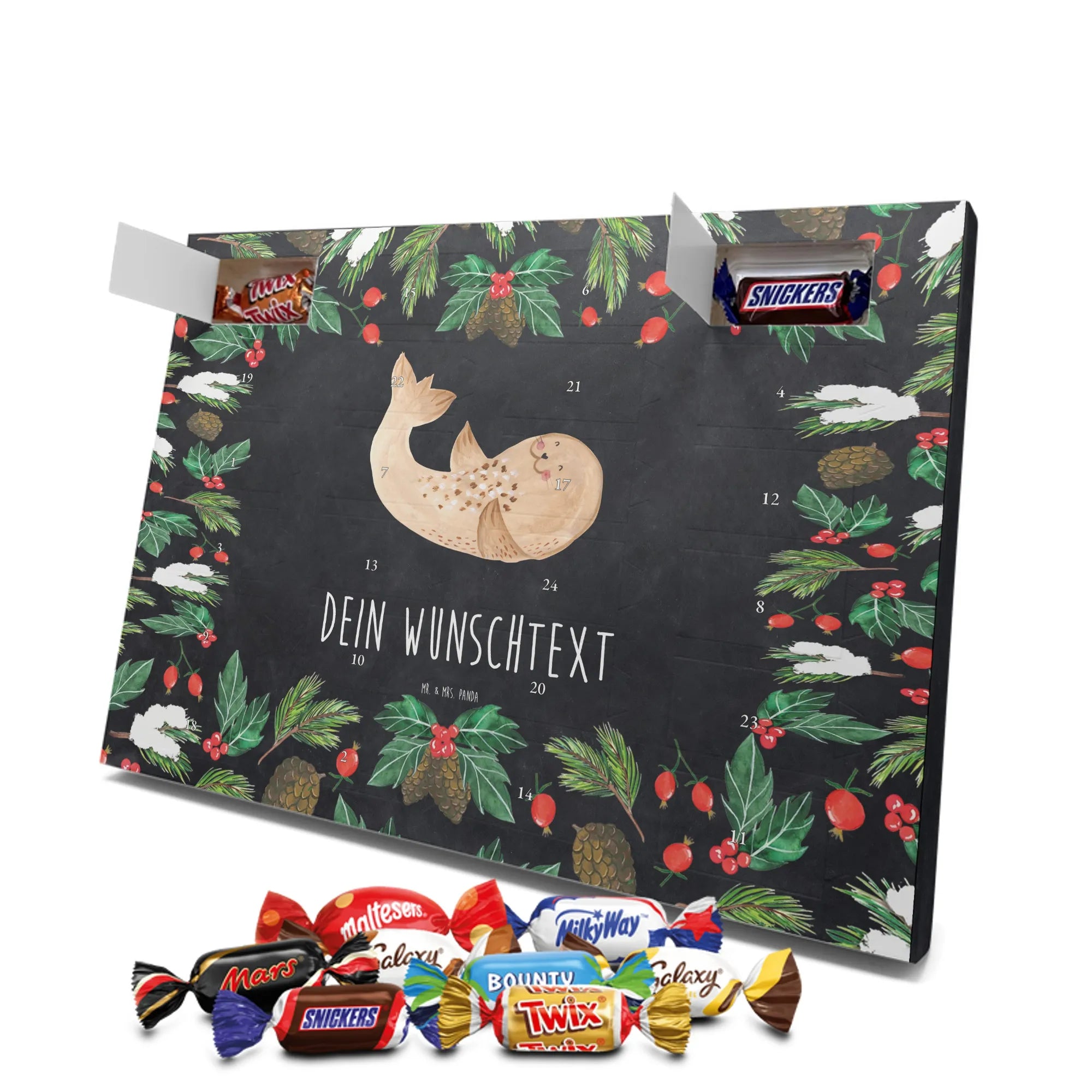 Personalisierter Schoko-Adventskalender von Mr. & Mrs. Panda – liebevoll gestaltet und ideal als individuelles Geschenk in der Adventszeit. Wir bedrucken den Kalender mit zauberhaften Motiven & herzlichen Sprüchen und personalisieren ihn mit deinem Wunschnamen oder Wunschtext. Die hochwertige Druckqualität kombiniert mit einer seidenmatten Oberflächenveredelung sorgt für ein edles Erscheinungsbild, und die bedruckten Seitenflächen geben dem Motiv zusätzlichen Charme. Der Kalender kann aufgehängt oder aufgestellt werden, sodass du ihn flexibel platzieren kannst. Gefüllt ist der Kalender mit Celebrations, die 24 hochwertige Überraschungen in 8 verschiedenen Sorten beinhalten: Maltesers, Mars, Snickers, Twix, Milky Way, Bounty, Galaxy und Galaxy Caramel. Maße: 325 mm x 225 mm x 27 mm – handlich und doch großzügig für die kleinen Leckereien hinter den Türchen. Ob für Kinder, Partner oder beste Freunde: dieser personalisierte Schoko-Adventskalender macht das Warten auf Weihnachten bunter und leckerer. Verschenke eine persönliche Erinnerung und jeden Tag ein kleines Schokoladen-Glück!