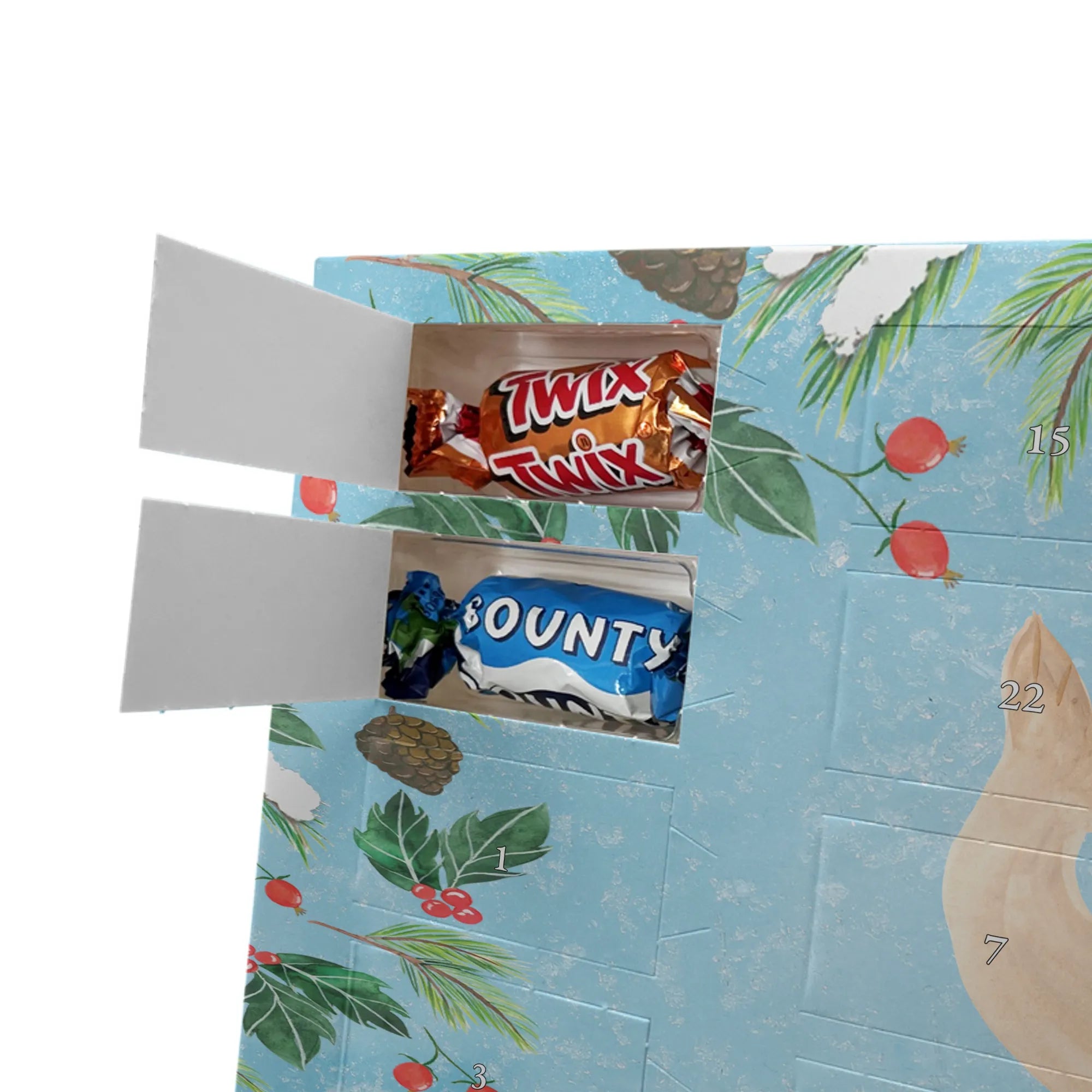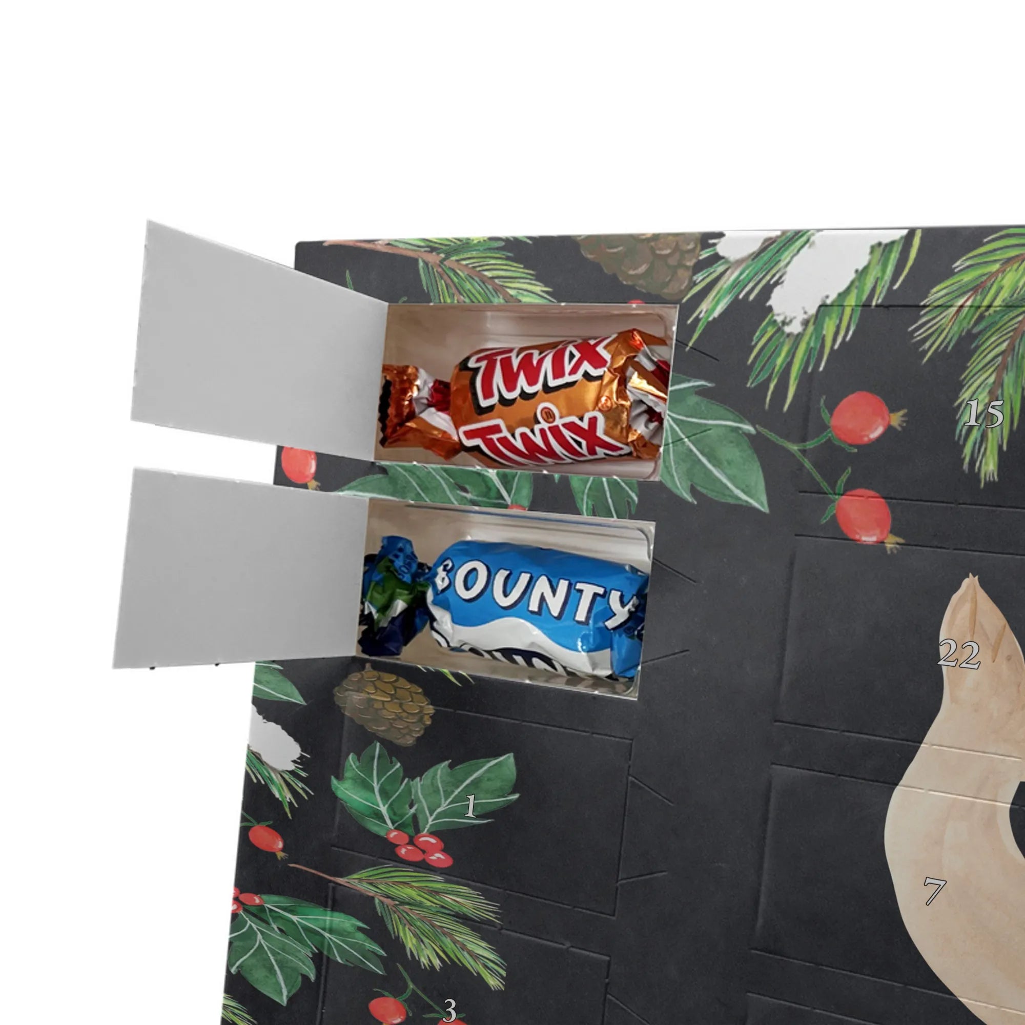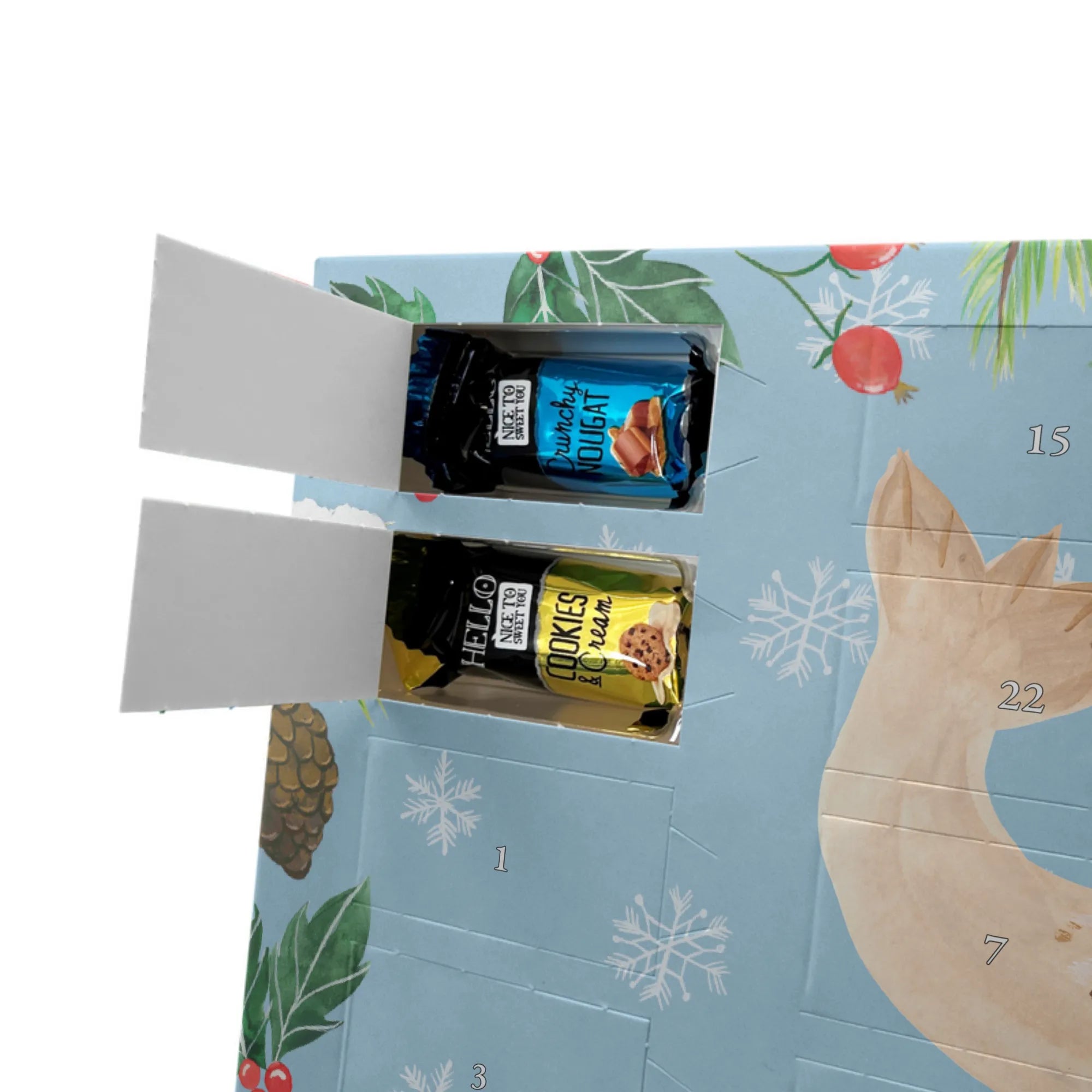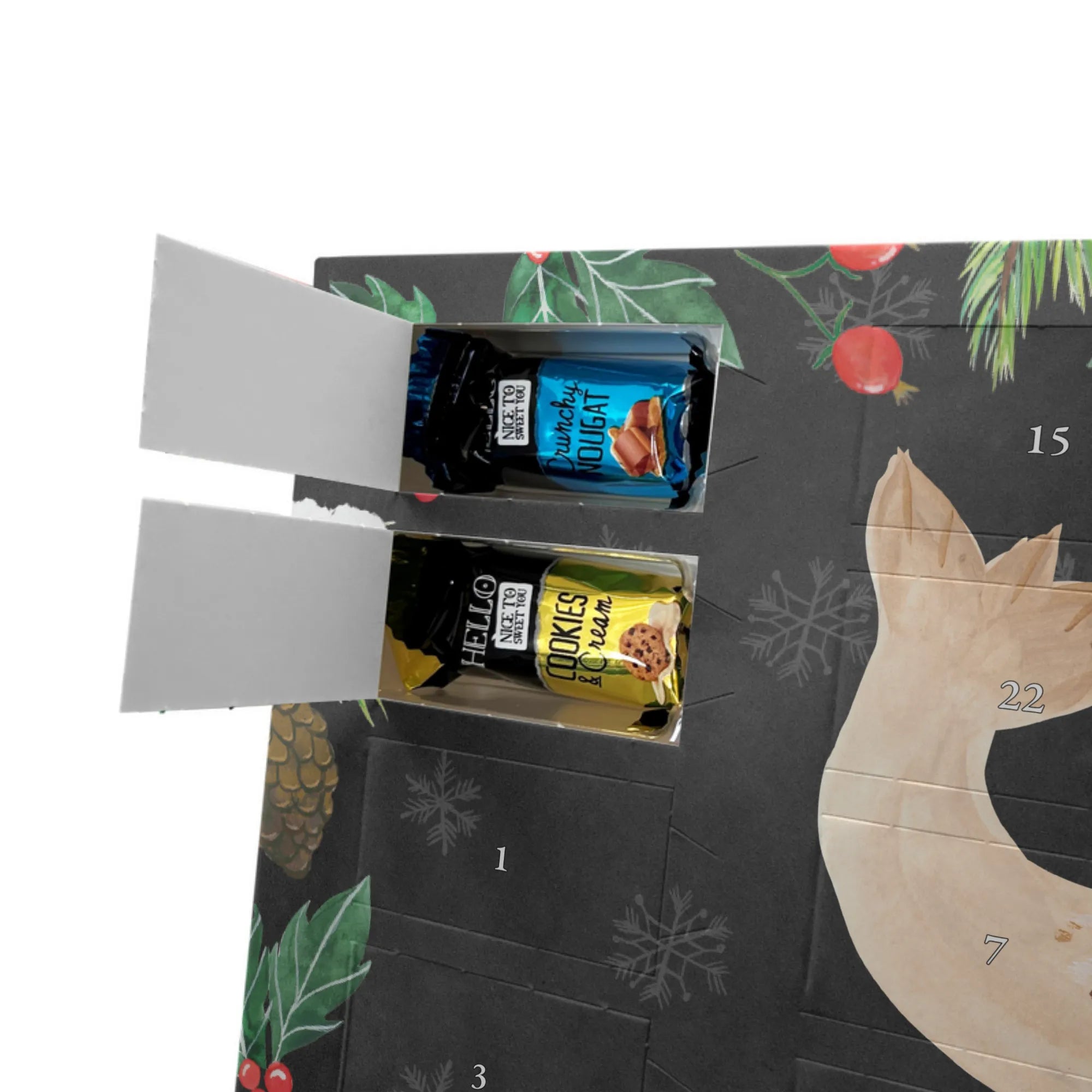 Personalisierter Schoko-Adventskalender von Mr. & Mrs. Panda – liebevoll gestaltet und ideal als individuelles Geschenk in der Adventszeit. Wir bedrucken den Kalender mit zauberhaften Motiven & herzlichen Sprüchen und personalisieren ihn mit deinem Wunschnamen oder Wunschtext. Die hochwertige Druckqualität kombiniert mit einer seidenmatten Oberflächenveredelung sorgt für ein edles Erscheinungsbild, und die bedruckten Seitenflächen geben dem Motiv zusätzlichen Charme. Der Kalender kann aufgehängt oder aufgestellt werden, sodass du ihn flexibel platzieren kannst. Gefüllt ist der Kalender mit Celebrations, die 24 hochwertige Überraschungen in 8 verschiedenen Sorten beinhalten: Maltesers, Mars, Snickers, Twix, Milky Way, Bounty, Galaxy und Galaxy Caramel. Maße: 325 mm x 225 mm x 27 mm – handlich und doch großzügig für die kleinen Leckereien hinter den Türchen. Ob für Kinder, Partner oder beste Freunde: dieser personalisierte Schoko-Adventskalender macht das Warten auf Weihnachten bunter und leckerer. Verschenke eine persönliche Erinnerung und jeden Tag ein kleines Schokoladen-Glück!