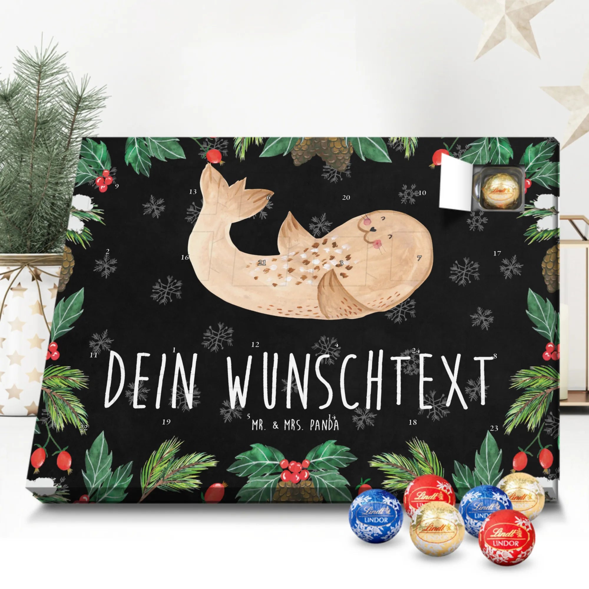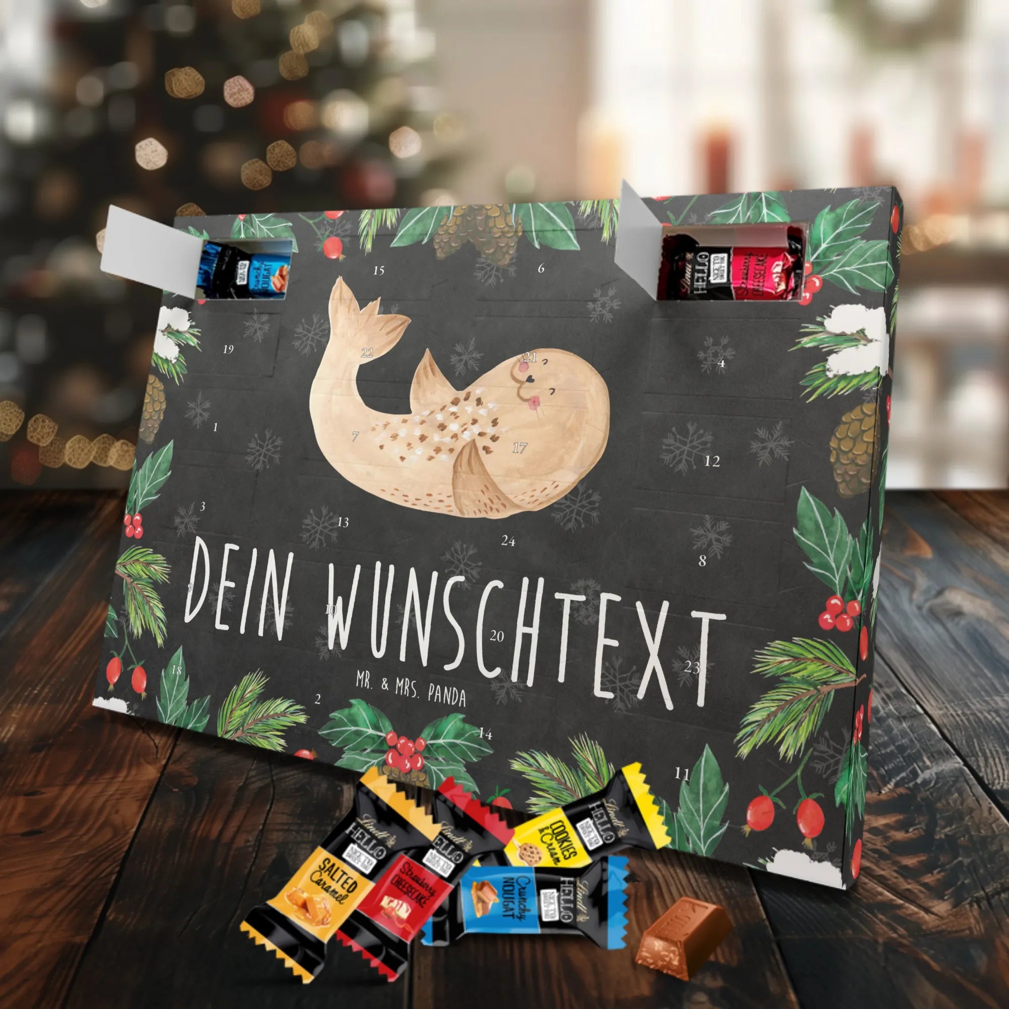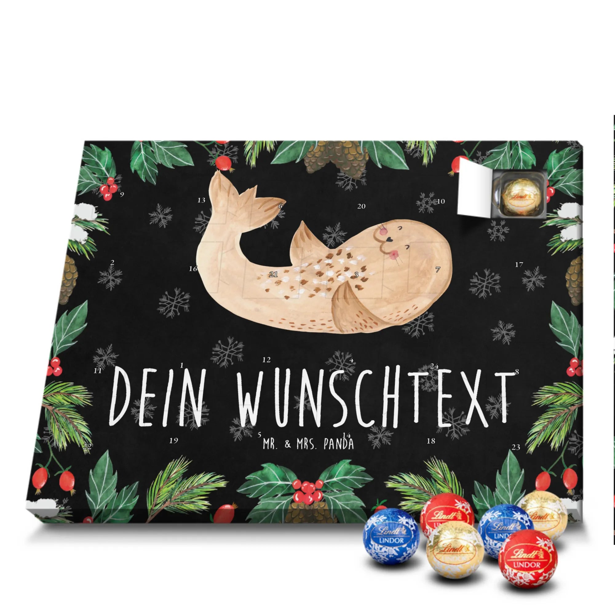 Personalisierter Adventskalender mit Schokolade von Mr. & Mrs. Panda – ein fröhlicher Blickfang in der Adventszeit! Der Kalender ist liebevoll gestaltet und bedruckt mit zauberhaften Motiven und positiven Sprüchen aus der Mr. & Mrs. Panda Kollektion. Du kannst ihn mit deinem Wunschnamen oder einem kurzen Wunschtext personalisieren, sodass jedes Türchen eine persönliche Botschaft trägt. Die brillante Druckqualität und die seidenmatte Oberflächenveredelung machen das Design besonders hochwertig, und die bedruckten Seitenflächen runden das Gesamtbild ab. Maße: 233 mm x 178 mm x 24 mm. Flexibel einsetzbar: entweder aufgehängt oder einfach aufgestellt – so wie es dir gefällt. Gefüllt mit Lindt Lindor Schokolade: 24 einzeln verpackte Markenschokoladen Kugeln in drei beliebten Sorten. Geschmacksrichtungen: Vollmilch, Feinherb und Weiße Schokolade. Zutaten: Zucker, pflanzliches Fett (Kokosnuss, Palmkern), Kakaobutter, Vollmilchpulver, Kakaomasse, Milchzucker, Magermilchpulver, Butterreinfett, Emulgator (Sojalecithin), Gerstenmalzextrakt, Aromen. Besondere Hinweise: Kann Haselnüsse und Mandeln enthalten. Verschenke Vorfreude und kleine Genussmomente – individuell, liebevoll und köstlich.