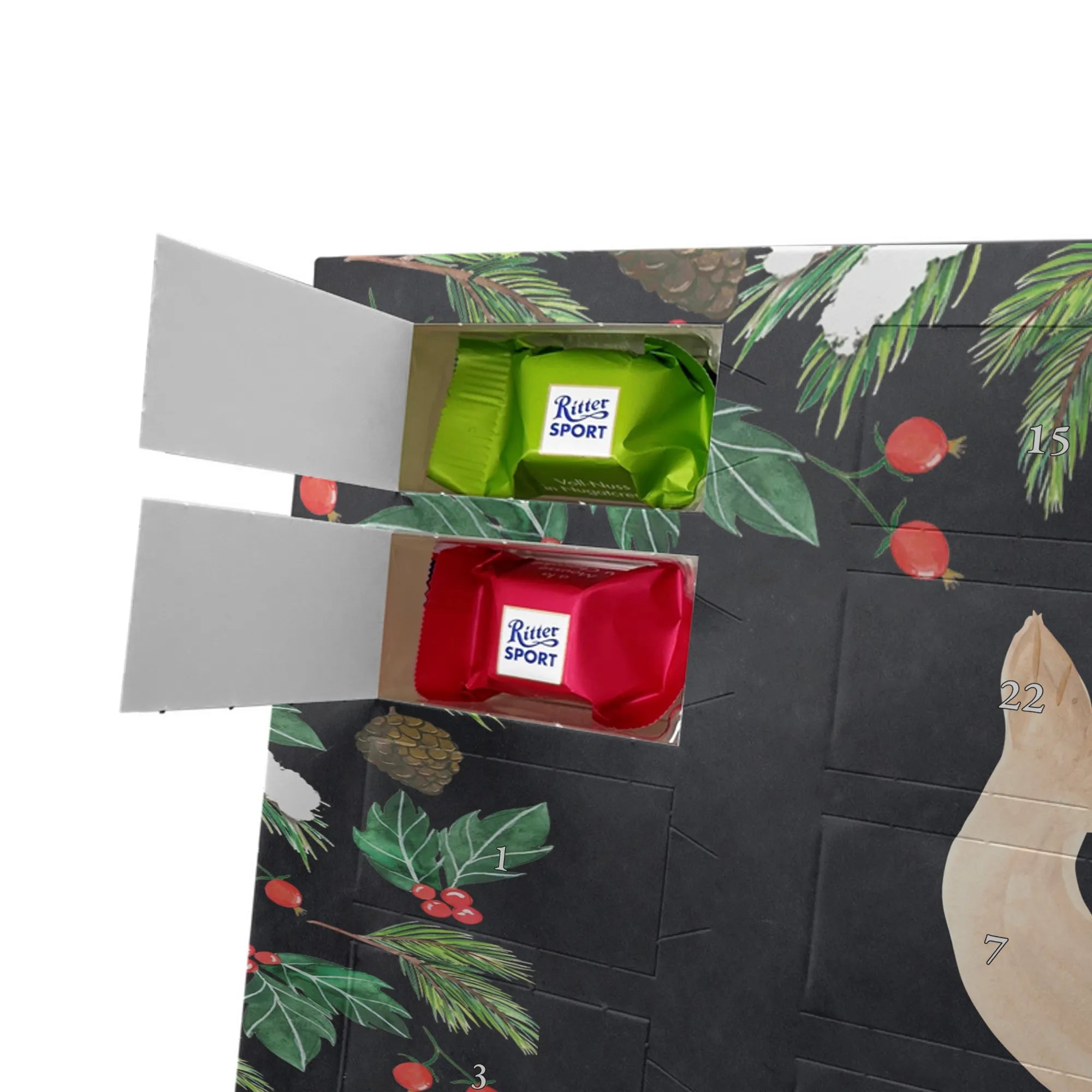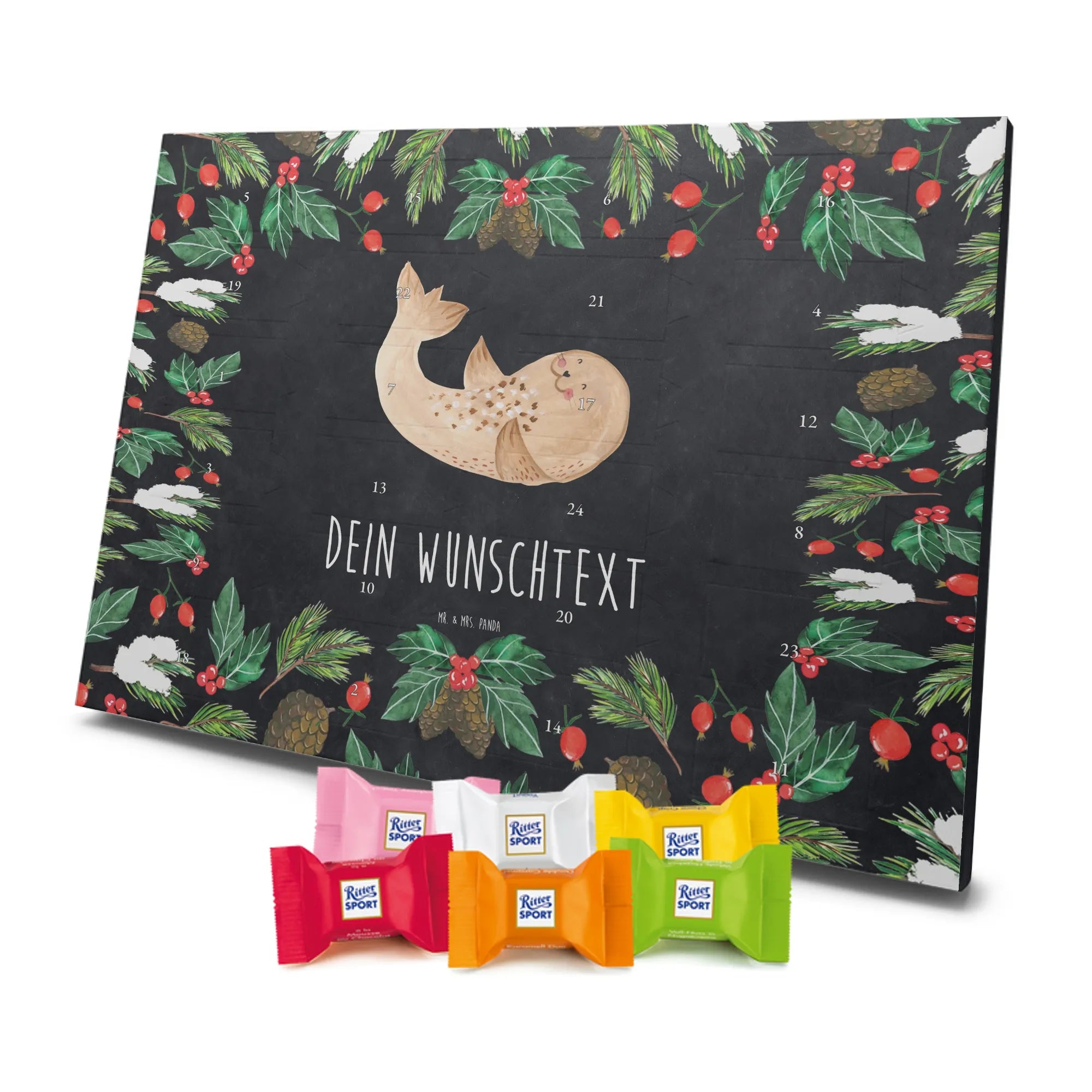 Suchst du einen besonderen Adventskalender, der persönlich und hochwertig ist? Unser Adventskalender mit Namen von Mr. & Mrs. Panda ist genau das – individualisierbar mit dem Namen deiner Liebsten oder einem kurzen Spruch und bedruckt mit unseren beliebten, charmanten Motiven. Die Druckqualität ist brillant, die seidenmatte Oberflächenveredelung verleiht dem Kalender eine elegante Haptik. Auch die Seitenflächen sind liebevoll bedruckt, sodass das Design rundum überzeugt. Du kannst den Kalender aufstellen oder an einer Stelle aufhängen, die du magst – die besondere Form macht beides möglich. Gefüllt ist der Kalender mit Ritter Sport Schokowürfeln in sechs beliebten Sorten: Mousse au Chocolat, Schoko Crisp, Voll-Nuss in Nougatcreme, Karamell Duo, Joghurt und Erdbeer-Joghurt. So gibt es hinter jedem Türchen eine kleine, leckere Überraschung. Maße: 325 mm x 225 mm x 27 mm – kompakt genug, um überall Platz zu finden, groß genug für 24 sorgfältig verpackte Schokowürfel.