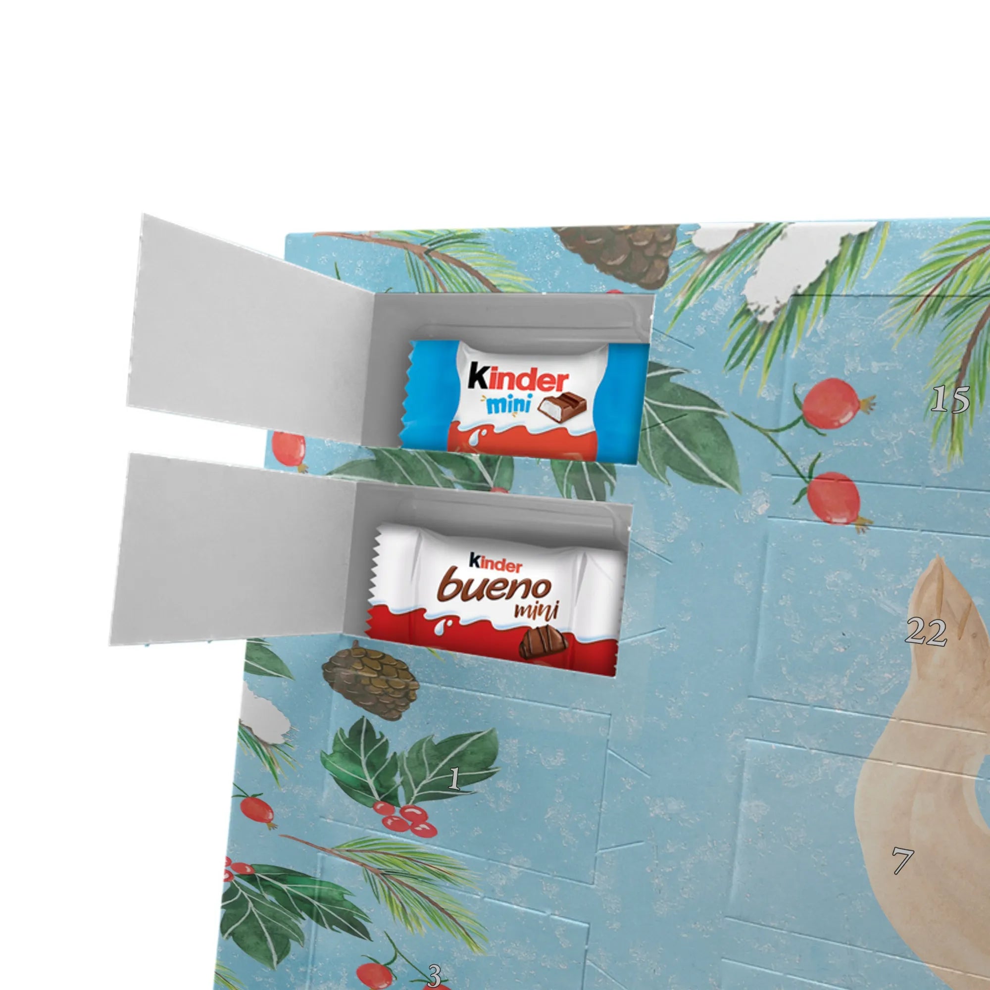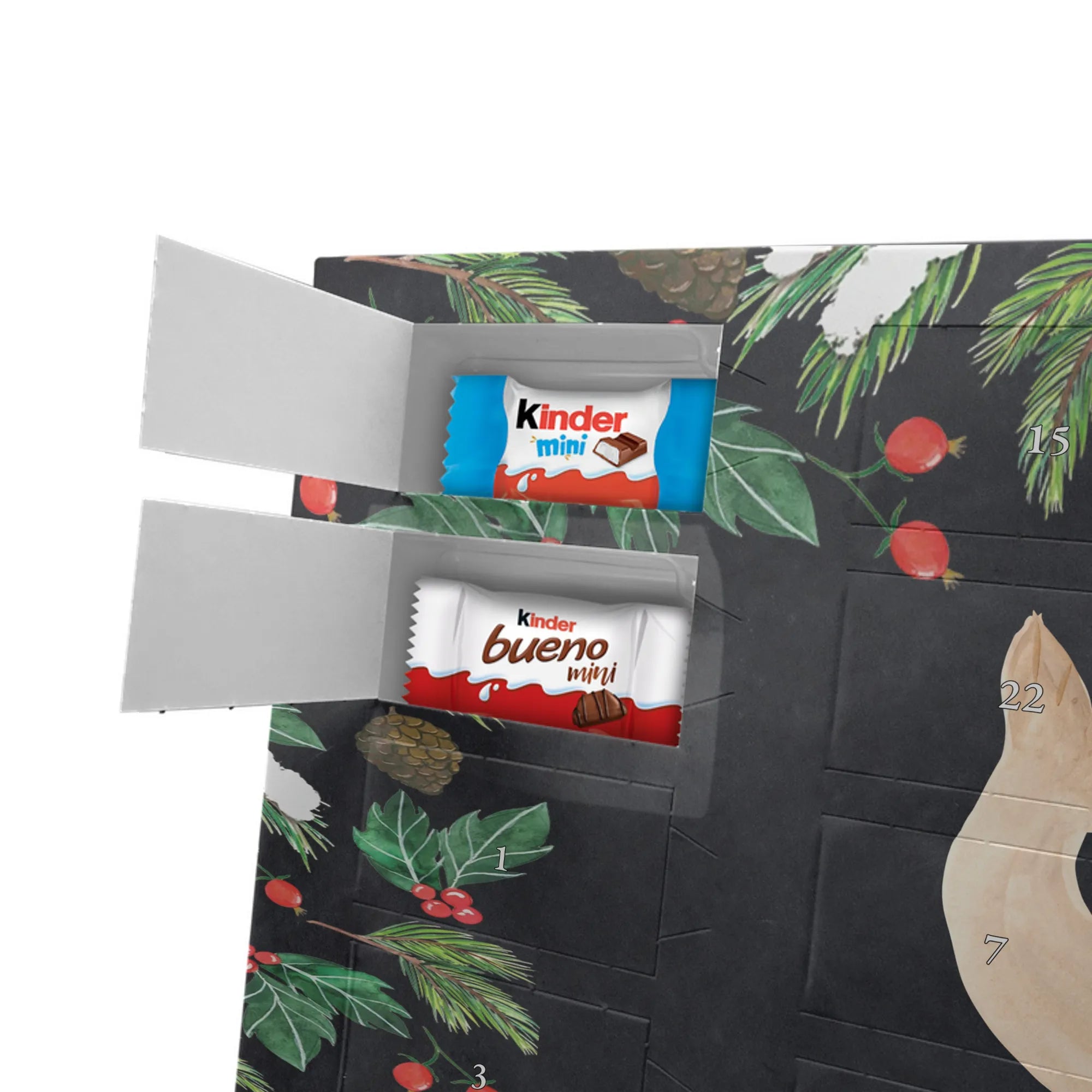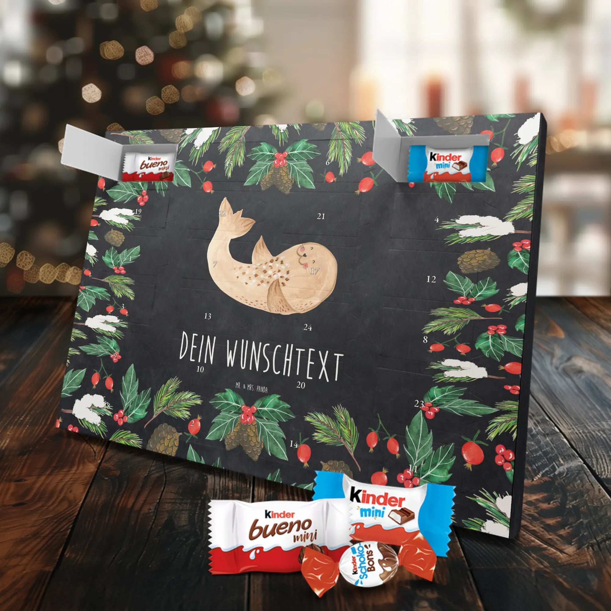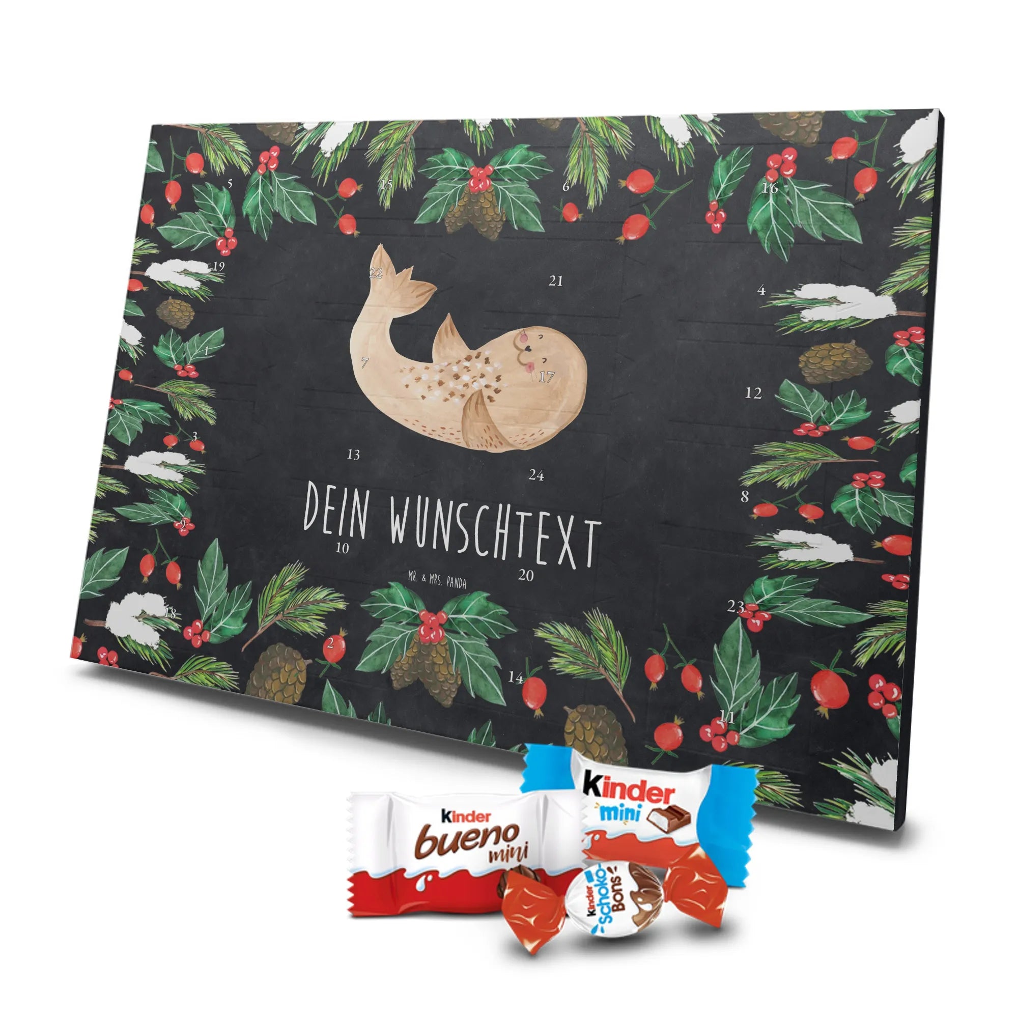 Feier die Vorfreude mit einem persönlichen Hingucker: unser Personalisierter Schoko Adventskalender von Mr. & Mrs. Panda. Dieser Kalender ist liebevoll mit wunderschönen Motiven & Sprüchen bedruckt und kann mit deinem Wunschnamen oder Wunschtext individualisiert werden – perfekt für eine persönliche Überraschung jeden Adventstag. Die brillante Druckqualität und die seidenmatte Oberflächenveredelung geben dem Kalender einen edlen Look, und die bedruckten Seitenflächen machen ihn rundum dekorativ. Besonders praktisch: der Kalender kann aufgehängt oder aufgestellt werden, je nachdem, wie du ihn präsentieren möchtest. Maße: 355 mm x 245 mm x 11 mm – ein ideales Format für dekorative Platzierung und genügend Raum für leckere Türchenüberraschungen. Gefüllt mit kinder® Schokolade: Adventskalender gefüllt mit kinder® Schokolade; Inhalt: kinder® Schoko-Bons, kinder® Bueno mini und kinder® Schokolade mini. Ob als Geschenk für Kinder, Partner oder beste Freunde – mit Mr. & Mrs. Panda verschenkst du nicht nur Süßes, sondern echte Vorfreude und liebevolle Gestaltung.