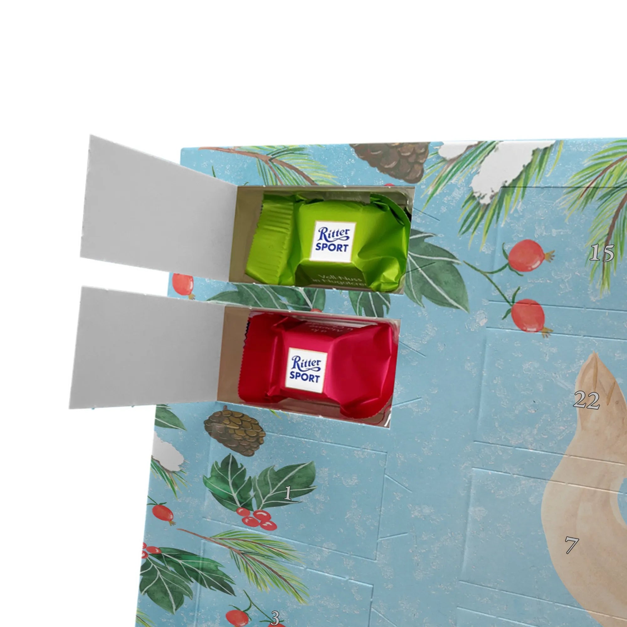Wunderschöner, persönlicher Genuss für die Vorweihnachtszeit: unser Personalisierter Schoko Adventskalender von Mr. & Mrs. Panda ist das perfekte Geschenk für alle, die Schokolade und liebevolle Details lieben. Du kannst den Kalender mit deinem Wunschnamen oder einem kurzen Wunschtext personalisieren – so wird jeder Adventstag zu etwas ganz Besonderem. Der Karton ist liebevoll bedruckt mit den typischen, herzerwärmenden Motiven und Sprüchen von Mr. & Mrs. Panda und besticht durch brillante Druckqualität sowie eine seidenmatte Oberflächenveredelung, die edel wirkt und sich toll anfühlt. Auch die Seitenflächen sind bedruckt, sodass der Kalender von allen Seiten ein Hingucker ist. Praktisch: Du kannst den Kalender aufstellen oder an der Wand aufhängen – ganz wie es bei dir passt. Gefüllt ist der Kalender mit Ritter Sport Schokowürfeln in beliebten Geschmacksrichtungen: Mousse au Chocolat, Schoko Crisp, Voll-Nuss in Nougatcreme, Karamell Duo, Joghurt und Erdbeer-Joghurt. Maße: 325 mm x 225 mm x 27 mm. Ob für Partner, Kinder oder die beste Freundin – dieser personalisierte Adventskalender sorgt für tägliche Freude und süße Überraschungen in der Adventszeit.