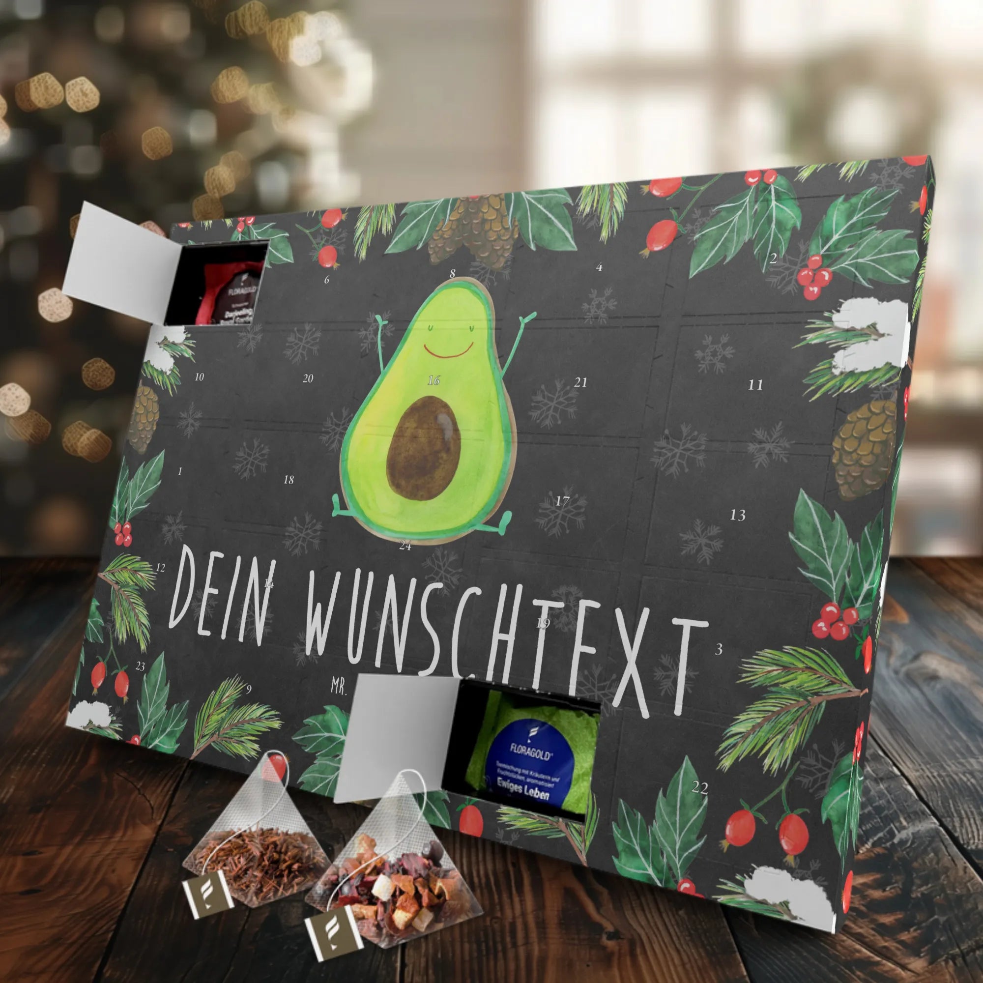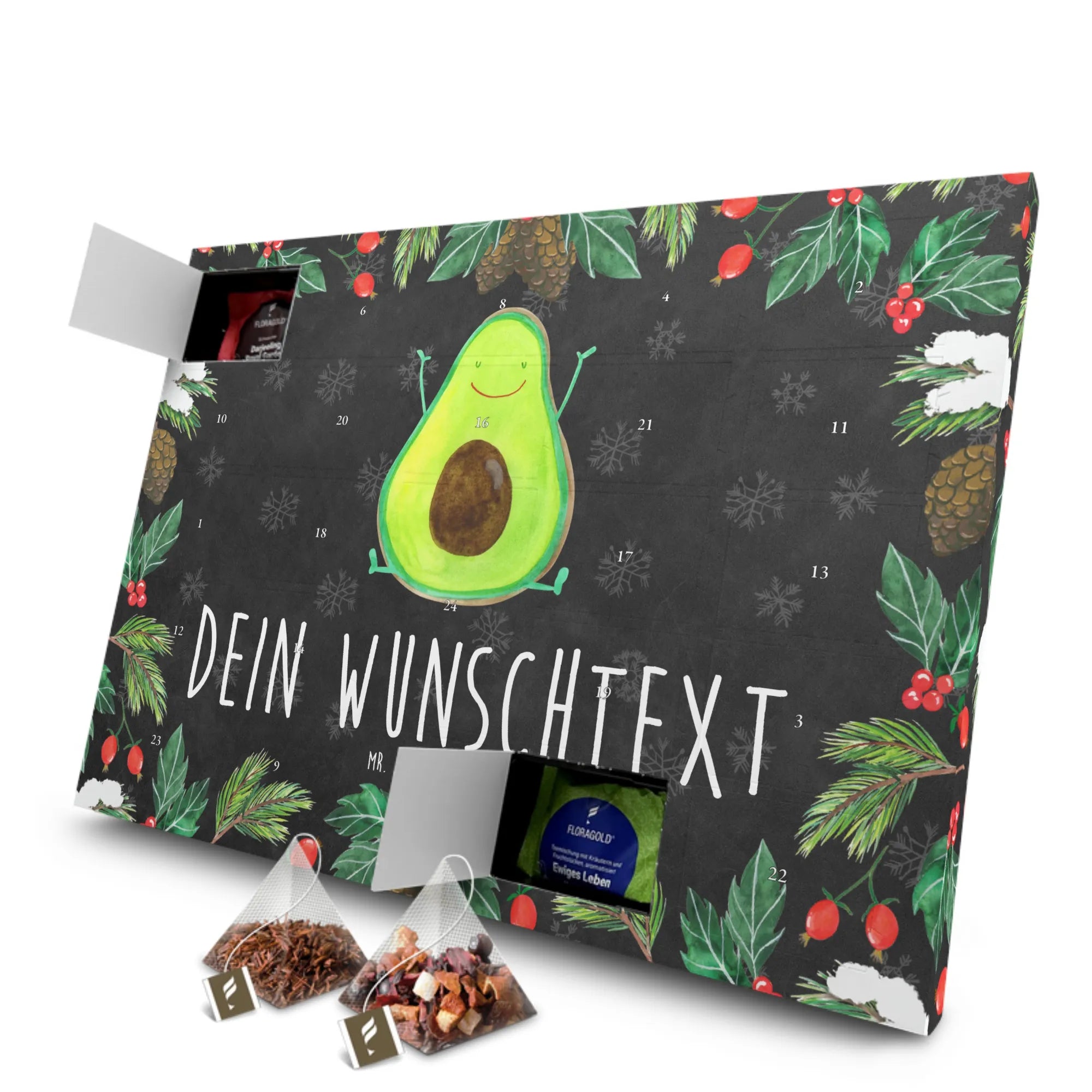 Der personalisierte Tee Adventskalender "Avocado Happy" von Mr. & Mrs. Panda ist das perfekte Geschenk für alle Tee-Liebhaber und Avocado-Fans. Mit seinem fröhlichen Motiv einer strahlenden Avocado, die ihre Arme in die Luft streckt, bringt dieser Adventskalender gute Laune in die Vorweihnachtszeit.