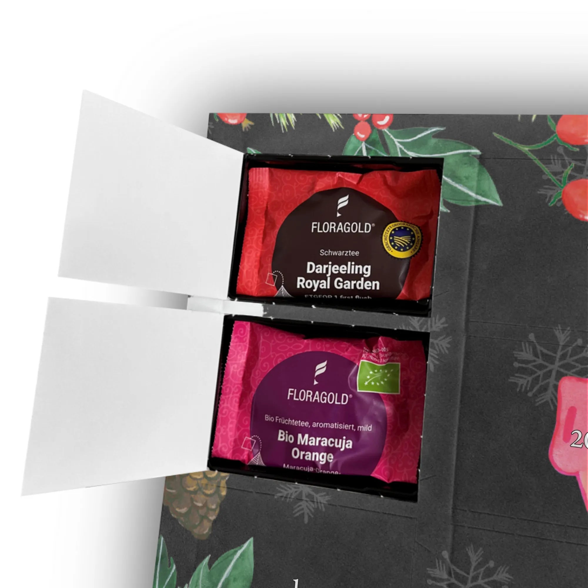 Schenk Vorfreude im Doppelpack: Personalisierten Tee-Kalender bestellen und 24 Tage voller Genuss und liebevoller Botschaften verschenken.
