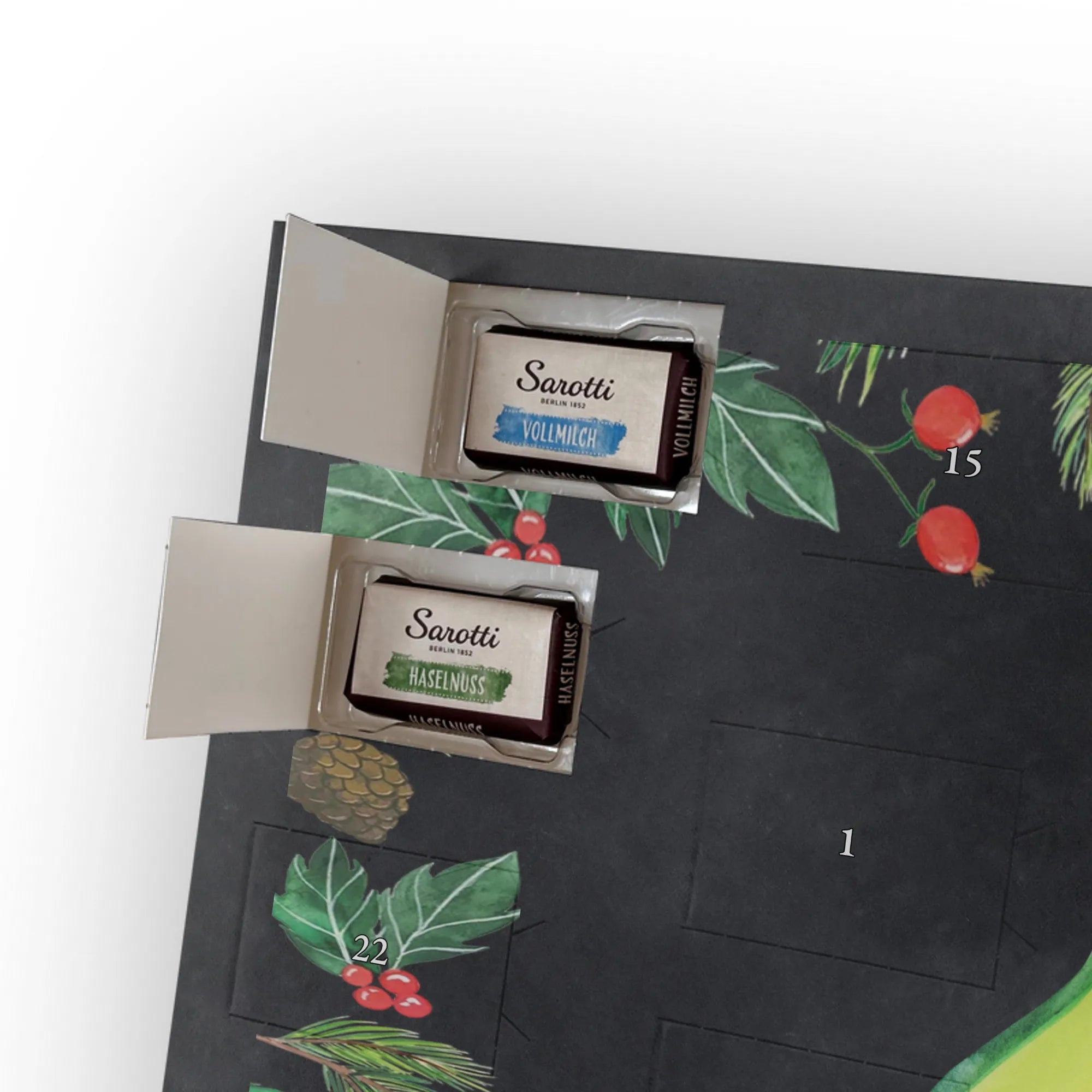 Adventskalender Schokolade von Mr. & Mrs. Panda – eine liebevolle Kombination aus hübschem Design und süßem Inhalt. Der Kalender ist bedruckt mit wunderschönen Motiven & Sprüchen von Mr. & Mrs. Panda und besticht durch brillante Druckqualität mit seidenmatter Oberflächenveredelung. Die Seitenflächen sind ebenfalls bedruckt, wodurch der Kalender rundum ein Hingucker ist. Er ist nicht personalisierbar. Maße: 325 mm x 225 mm x 27 mm. Besonders praktisch: Du kannst ihn sowohl aufgehängt als auch aufgestellt nutzen, je nachdem, wo er bei dir am schönsten wirkt. Gefüllt ist der Kalender mit Ritter Sport Schokowürfeln in verführerischen Sorten – Mousse au Chocolat, Schoko Crisp, Voll-Nuss in Nougatcreme, Karamell Duo, Joghurt und Erdbeer-Joghurt. Wichtiger Hinweis: Es handelt sich um einen Kalender gefüllt mit Ritter Sport Schokolade, nicht um einen Kalender der Marke Ritter Sport. Schenke deinen Liebsten oder dir selbst tägliche Schokoglücksmomente mit diesem charmanten Adventskalender.
