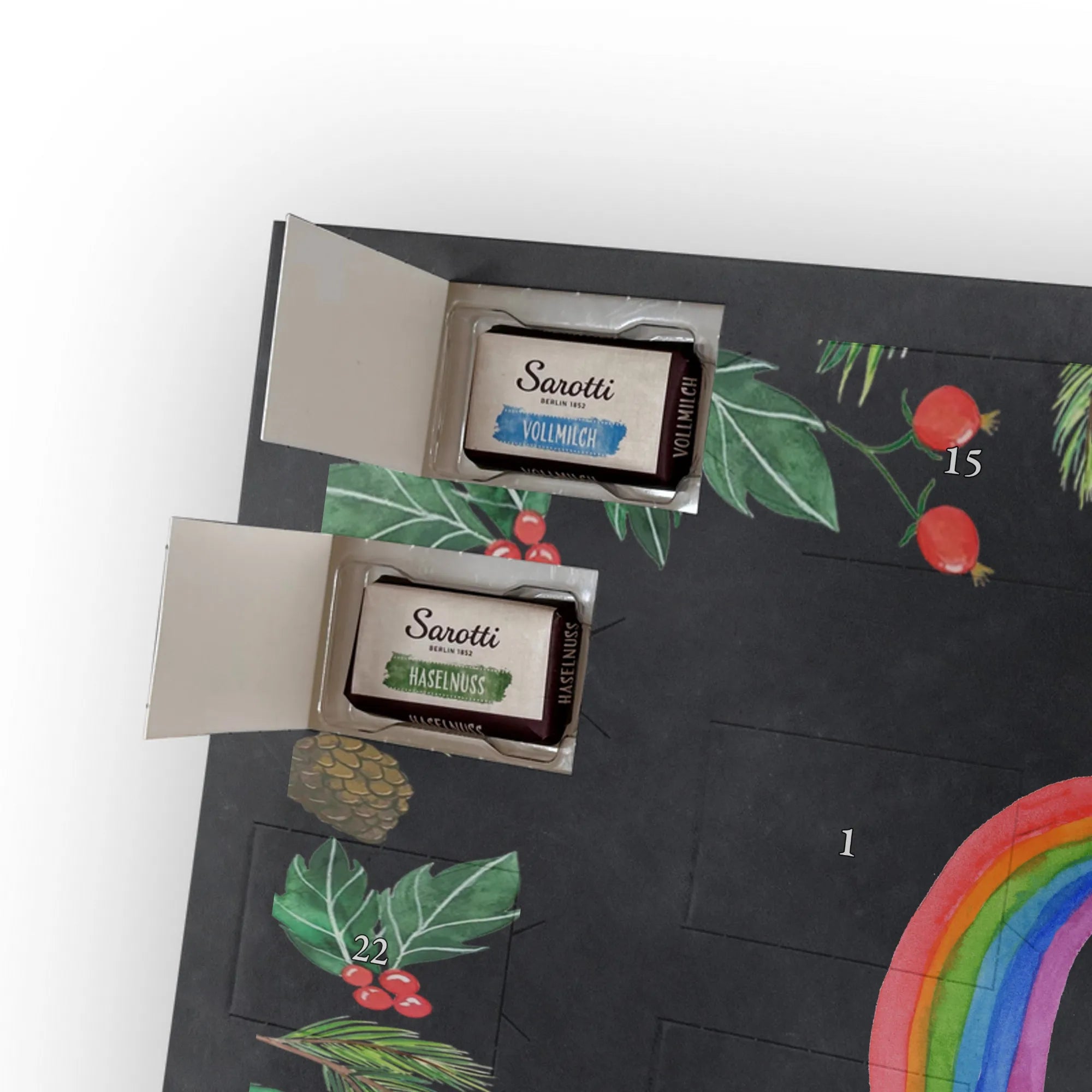 Schon unser Schoko-Adventskalender von Mr. & Mrs. Panda gesehen? Ein liebevoll gestalteter Kalender, bedruckt mit wunderschönen Motiven & Sprüchen, der deine Adventszeit versüßt. Der Kalender ist nicht personalisierbar, überzeugt aber durch brillante Druckqualität mit seidenmatter Oberflächenveredelung und bedruckte Seitenflächen für ein rundum schönes Erscheinungsbild. Maße: 325 mm x 225 mm x 27 mm. Du kannst ihn aufhängen oder aufstellen – ganz wie es dir gefällt. Gefüllt mit Ritter Sport Schokowürfeln in köstlichen Sorten: Mousse au Chocolat, Schoko Crisp, Voll-Nuss in Nougatcreme, Karamell Duo, Joghurt und Erdbeer-Joghurt. Bitte beachten: Es handelt sich um einen Kalender gefüllt mit Ritter Sport Schokolade, nicht um einen Kalender der Marke Ritter Sport. Ob als Geschenk oder für dich selbst – dieser Schoko-Adventskalender bringt täglich kleine Glücksmomente und süße Überraschungen.