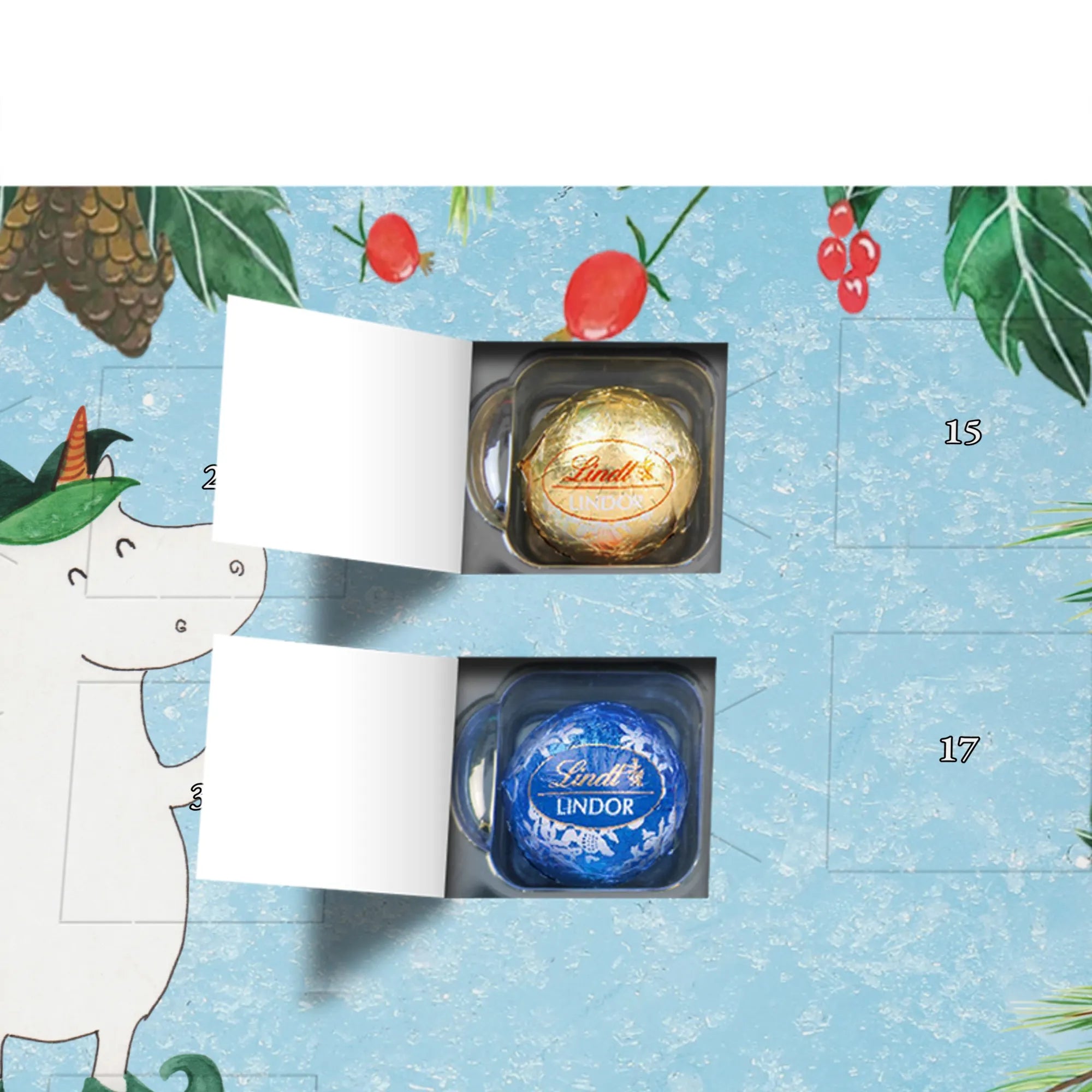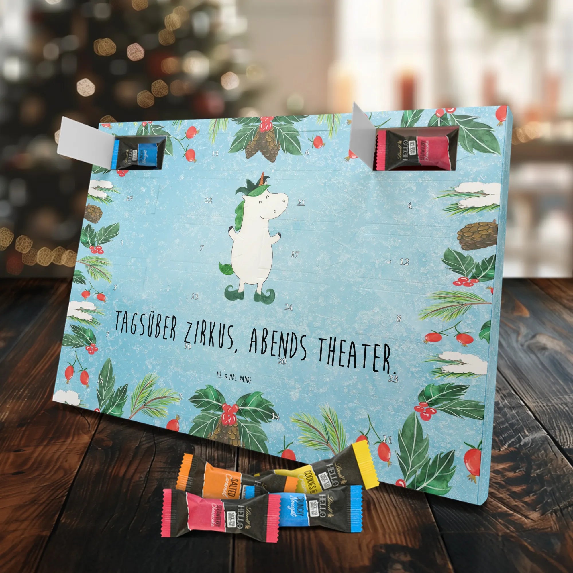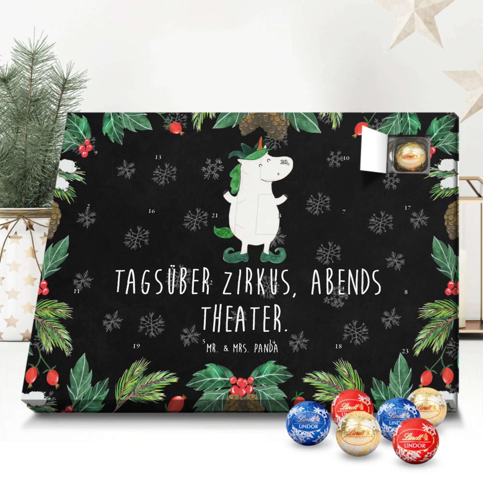 Unser zauberhafter Schoko Adventskalender von Mr. & Mrs. Panda bringt dir die süßeste Vorfreude auf Weihnachten! Dieser liebevoll gestaltete Adventskalender ist bedruckt mit wunderschönen Motiven & Sprüchen von Mr. & Mrs. Panda und ist nicht personalisierbar – dafür aber ein perfektes Geschenk für Freunde und Familie. Brillante Druckqualität mit seidenmatter Oberflächenveredelung sorgt für ein edles Finish, und die bedruckten Seitenflächen machen den Kalender von allen Seiten zu einem Hingucker. Maße: 233 mm x 178 mm x 24 mm. Besonderheit: kann aufgehängt oder aufgestellt werden, je nachdem, wie du ihn präsentieren möchtest. Gefüllt mit Lindt Lindor: 24 einzeln verpackte Markenschokoladen Kugeln in drei verschiedenen Sorten – Vollmilch, Feinherb und Weiße Schokolade – sorgen für abwechslungsreichen Genuss in der Adventszeit. Zutaten: Zucker, pflanzliches Fett (Kokosnuss, Palmkern), Kakaobutter, Vollmilchpulver, Kakaomasse, Milchzucker, Magermilchpulver, Butterreinfett, Emulgator (Sojalecithin), Gerstenmalzextrakt, Aromen. Besondere Hinweise: Kann Haselnüsse und Mandeln enthalten. Unser Schoko Adventskalender verbindet niedliches Design mit hochwertiger Füllung – ideal zum Verschenken oder selbst Naschen. Mr. & Mrs. Panda wünschen dir eine fröhliche und leckere Adventszeit!