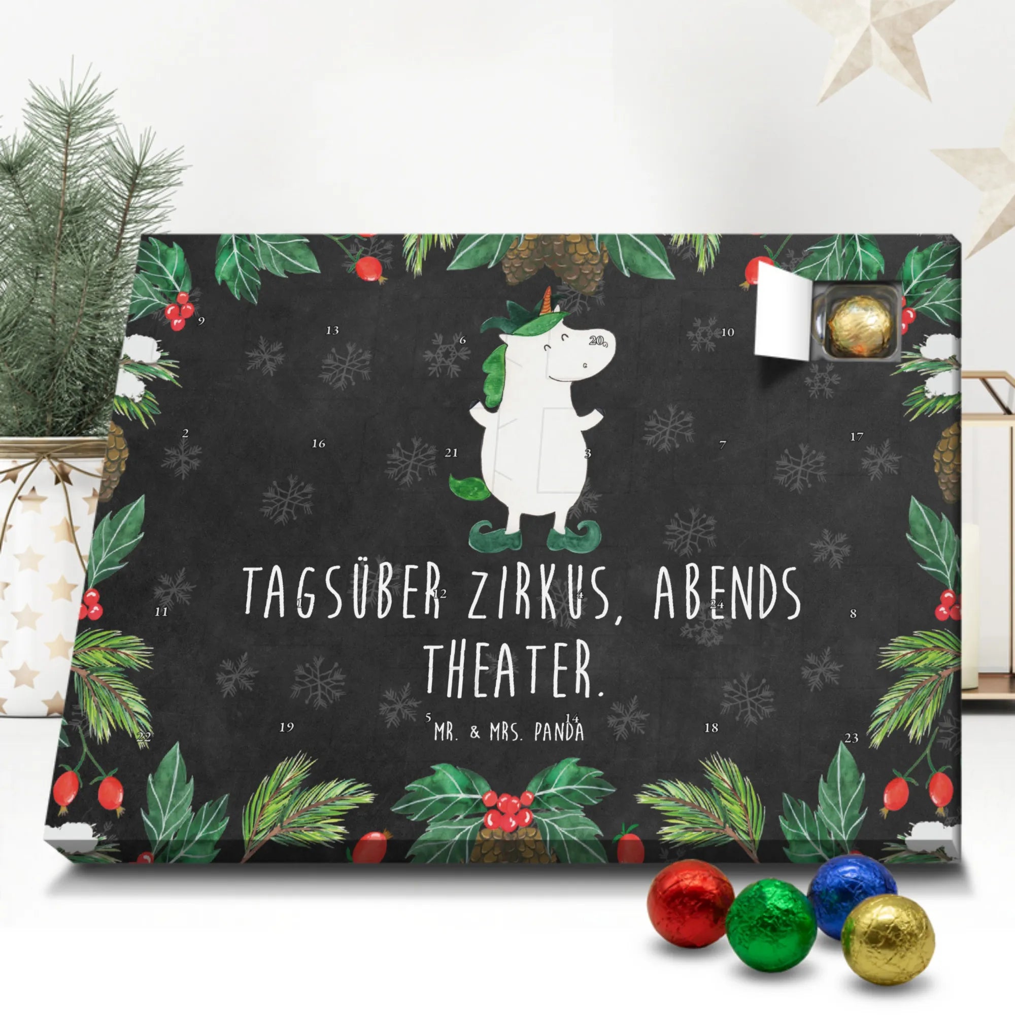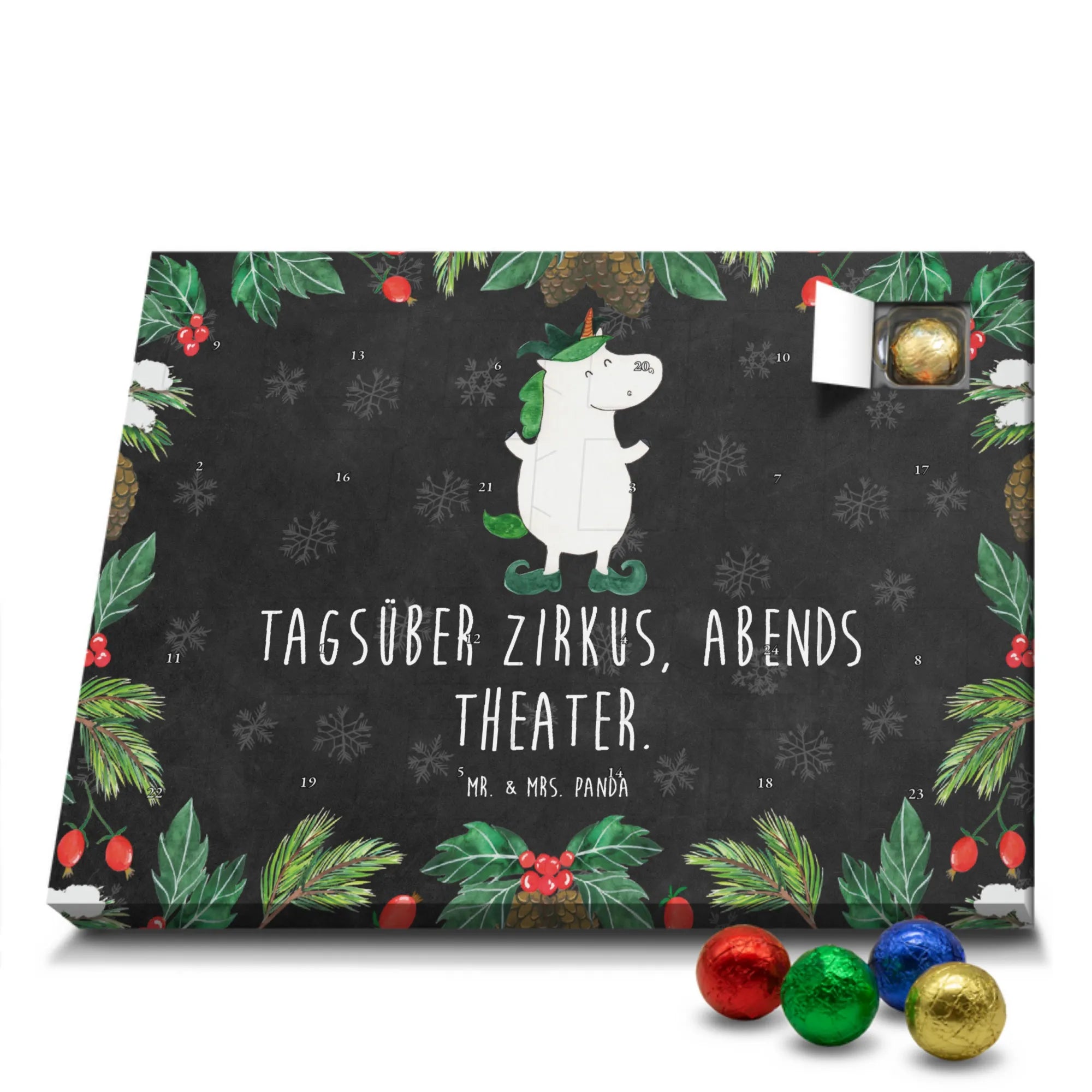 Wunderschöner Schokoladen-Adventskalender von Mr. & Mrs. Panda – süßes Design trifft hochwertige Verarbeitung. Unser Schokoladen-Adventskalender ist bedruckt mit wunderschönen Motiven & Sprüchen von Mr. & Mrs. Panda und nicht personalisierbar, dafür aber mit liebevollen Details gestaltet. Die brillante Druckqualität mit seidenmatter Oberflächenveredelung verleiht dem Kalender ein edles Finish, und auch die Seitenflächen sind bedruckt für einen rundum stimmigen Look. Maße: 233 mm x 178 mm x 24 mm. Die Konstruktion erlaubt sowohl das Aufstellen als auch das Aufhängen – Besonderheit: kann aufgehängt oder aufgestellt werden. Gefüllt mit MARKENNAMEN Schokolade und mit leckeren Schokoladenkugeln bestückt, ist jeder Dezembertag eine kleine Belohnung. Bitte lies die besonderen Hinweise: (Kann Spuren von Haselnüssen, Mandeln, Gluten und Soja enthalten!), kühl und trocken lagern. Ideal als Geschenk, Adventsdekoration oder süße Überraschung für Freunde und Familie. Mr. & Mrs. Panda wünscht dir eine gemütliche und genussvolle Adventszeit!