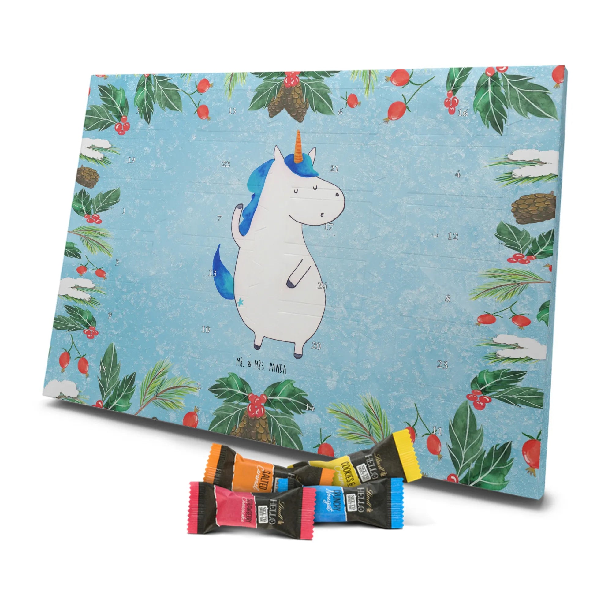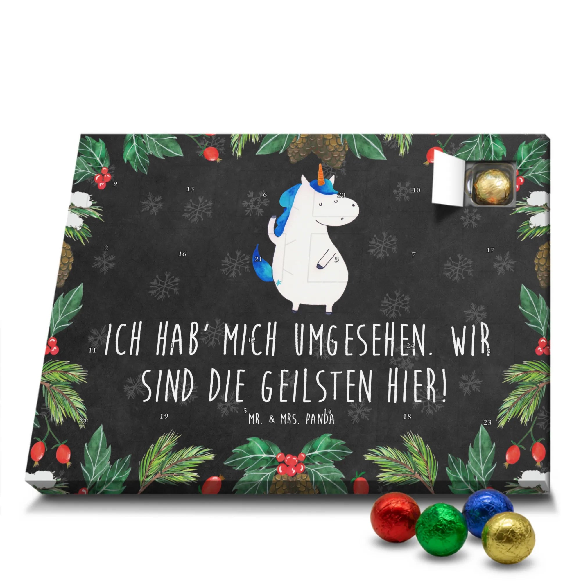 Wunderschöner Schokoladen-Adventskalender von Mr. & Mrs. Panda – süßes Design trifft hochwertige Verarbeitung. Unser Schokoladen-Adventskalender ist bedruckt mit wunderschönen Motiven & Sprüchen von Mr. & Mrs. Panda und nicht personalisierbar, dafür aber mit liebevollen Details gestaltet. Die brillante Druckqualität mit seidenmatter Oberflächenveredelung verleiht dem Kalender ein edles Finish, und auch die Seitenflächen sind bedruckt für einen rundum stimmigen Look. Maße: 233 mm x 178 mm x 24 mm. Die Konstruktion erlaubt sowohl das Aufstellen als auch das Aufhängen – Besonderheit: kann aufgehängt oder aufgestellt werden. Gefüllt mit MARKENNAMEN Schokolade und mit leckeren Schokoladenkugeln bestückt, ist jeder Dezembertag eine kleine Belohnung. Bitte lies die besonderen Hinweise: (Kann Spuren von Haselnüssen, Mandeln, Gluten und Soja enthalten!), kühl und trocken lagern. Ideal als Geschenk, Adventsdekoration oder süße Überraschung für Freunde und Familie. Mr. & Mrs. Panda wünscht dir eine gemütliche und genussvolle Adventszeit!